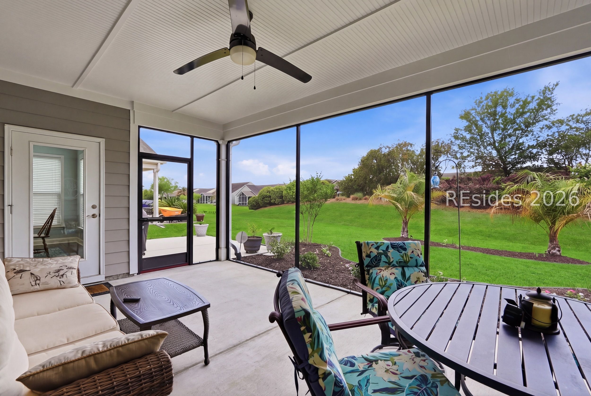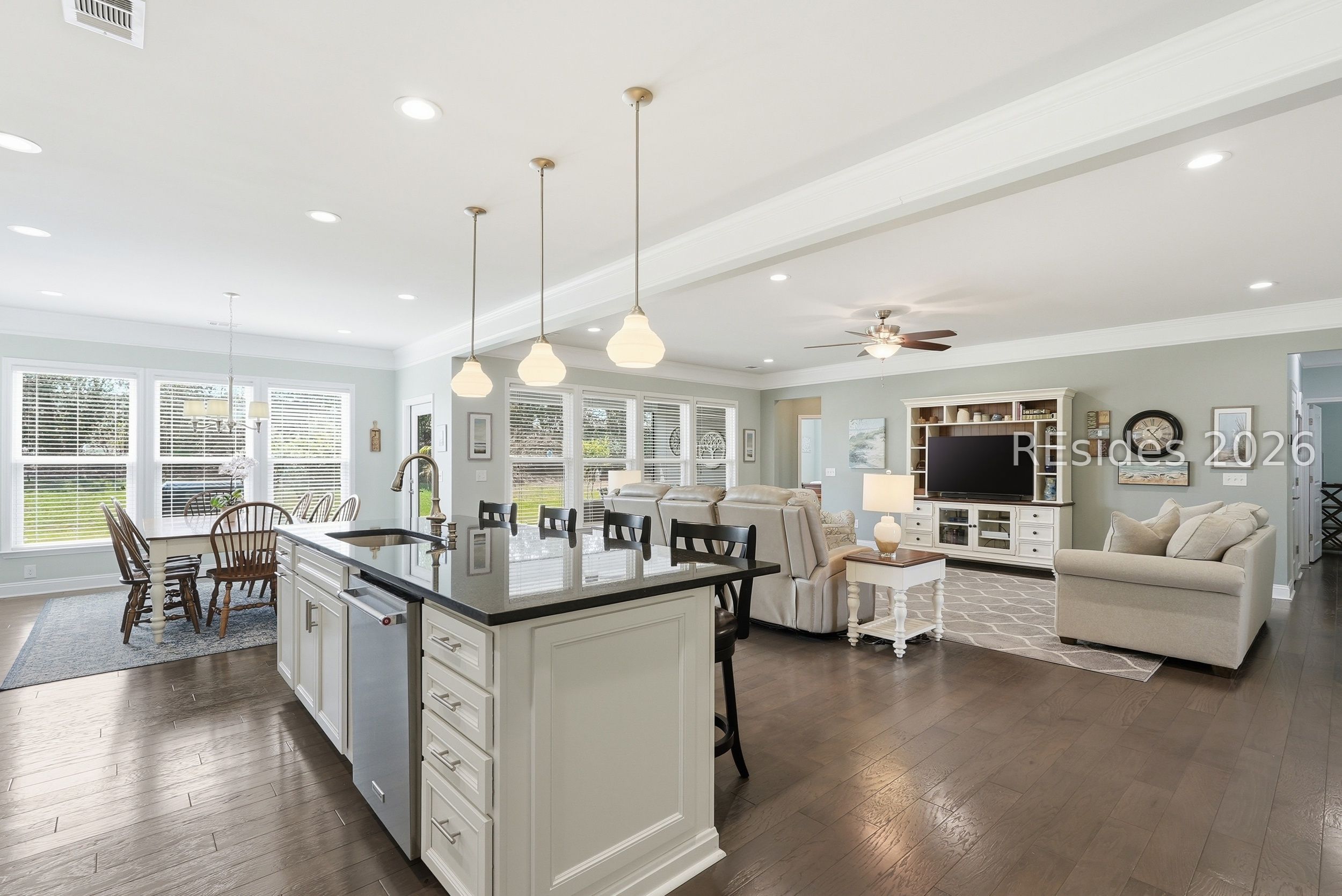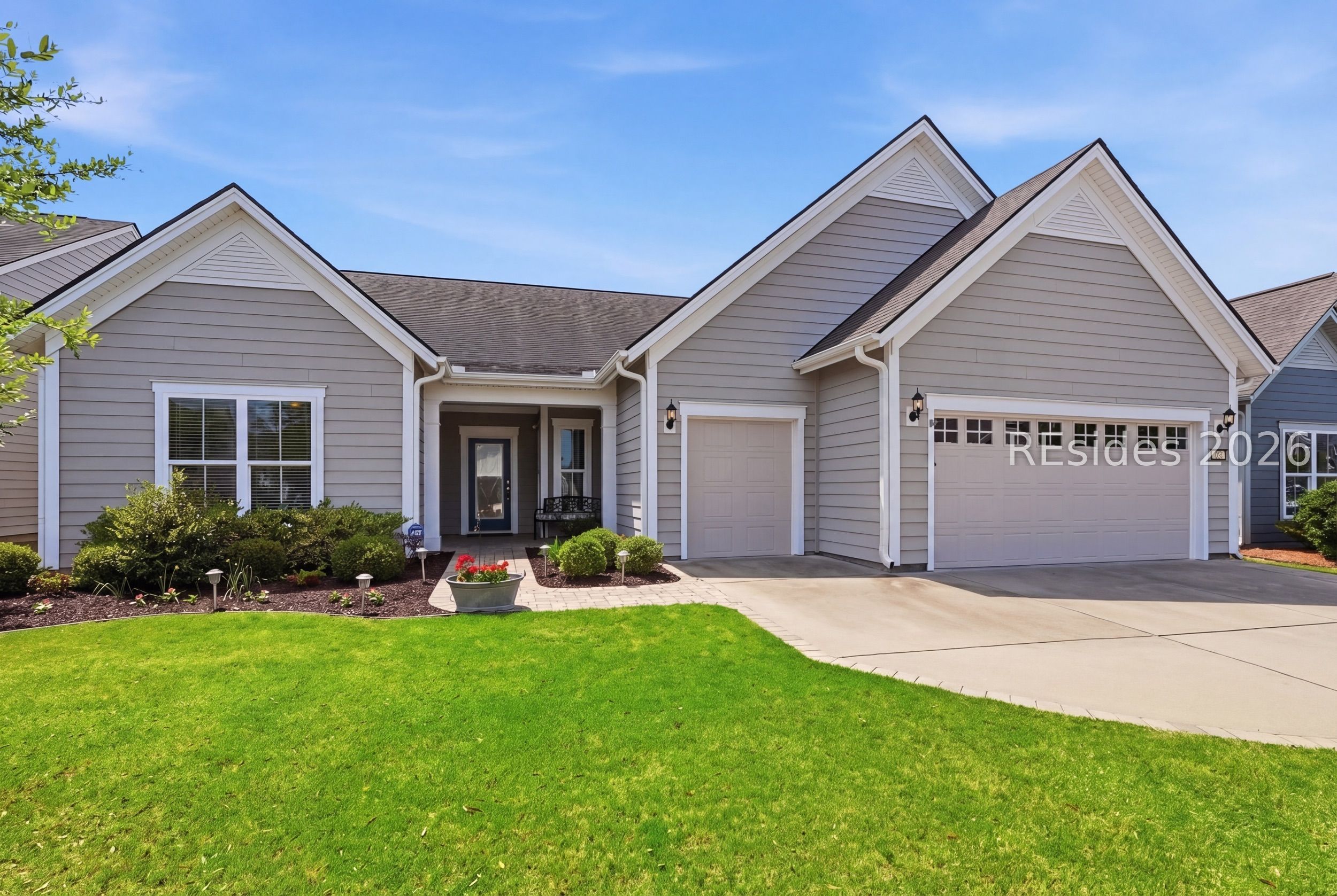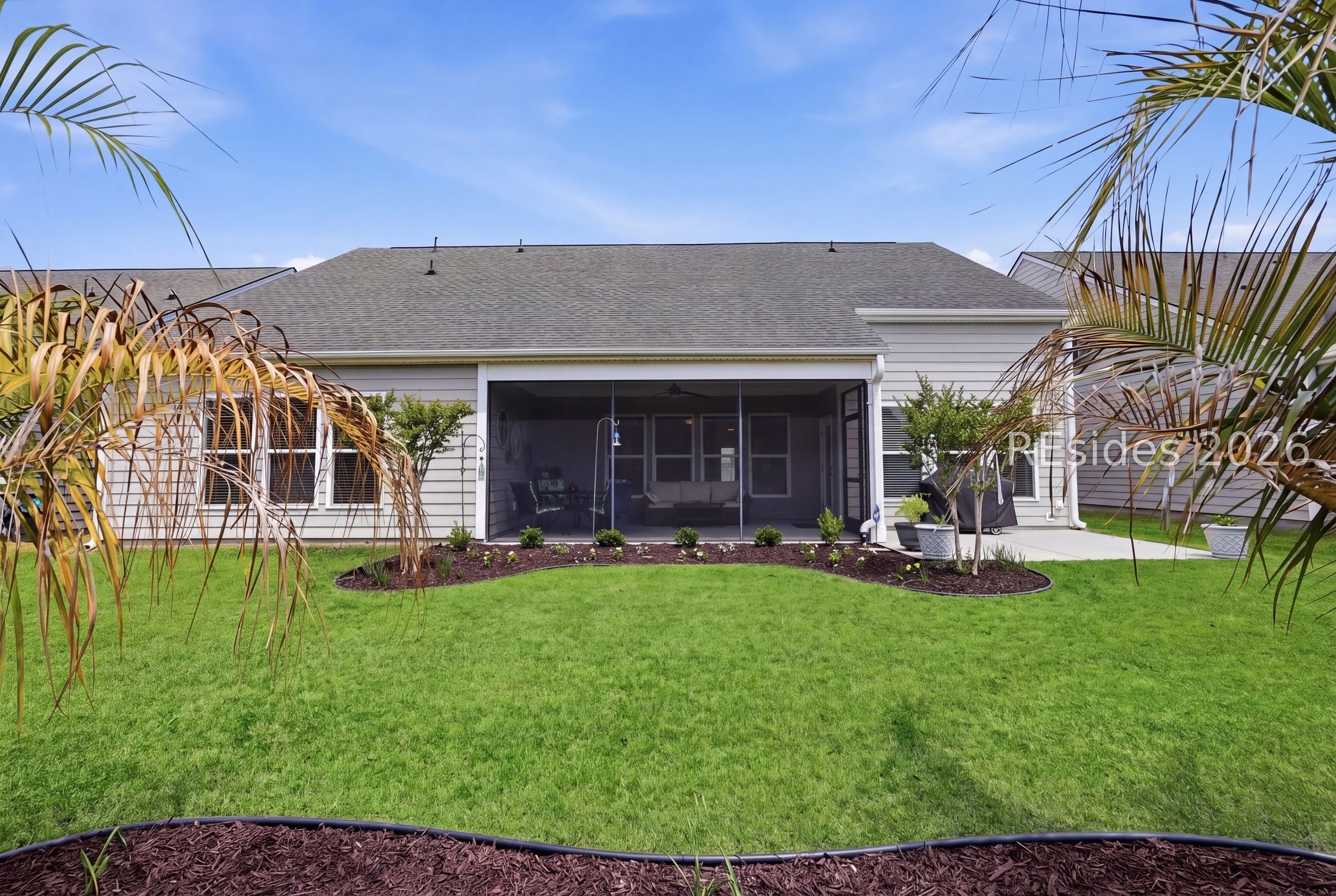 Welcome to a beautifully appointed home in the highly sought-after Sun City Hilton Head community, offering a perfect blend of comfort, functionality, and Lowcountry lifestyle. This thoughtfully designed residence features 3 spacious bedrooms plus a versatile den/office/flex room, ideal for working from home, hobbies, or additional guest space. The heart of the home is the gourmet kitchen, complete with crisp white cabinetry, ample counter space, and a layout that flows seamlessly into the main living areas-perfect for both everyday living and entertaining. Wood flooring extends throughout, adding warmth and continuity to the home's design. The generously sized primary suite offers a relaxing retreat, highlighted by a spa-like bathroom featuring a super shower and excellent closet and storage space designed for easy organization. Two additional bedrooms provide comfortable accommodations for guests or family. Outdoor living is equally inviting, with a screened lanai overlooking a private backyard that offers a peaceful setting and a charming peek-a-boo lagoon view-perfect for enjoying quiet mornings or evening relaxation. Additional exterior upgrades include pavers that widen the driveway as well as an enhanced walkway leading to the front door, creating both curb appeal and convenience. A dedicated golf cart garage adds extra functionality and storage. Ideally situated in a central location within the community, this home provides easy access to the Lake House Amenity Center and the new Argent East Amenity Center, placing world-class amenities, fitness, dining, and social activities just moments away. Sun City Hilton Head is a premier active adult community offering an unmatched lifestyle with golf courses, resort-style pools, fitness centers, clubs, and countless opportunities to stay active and connected.