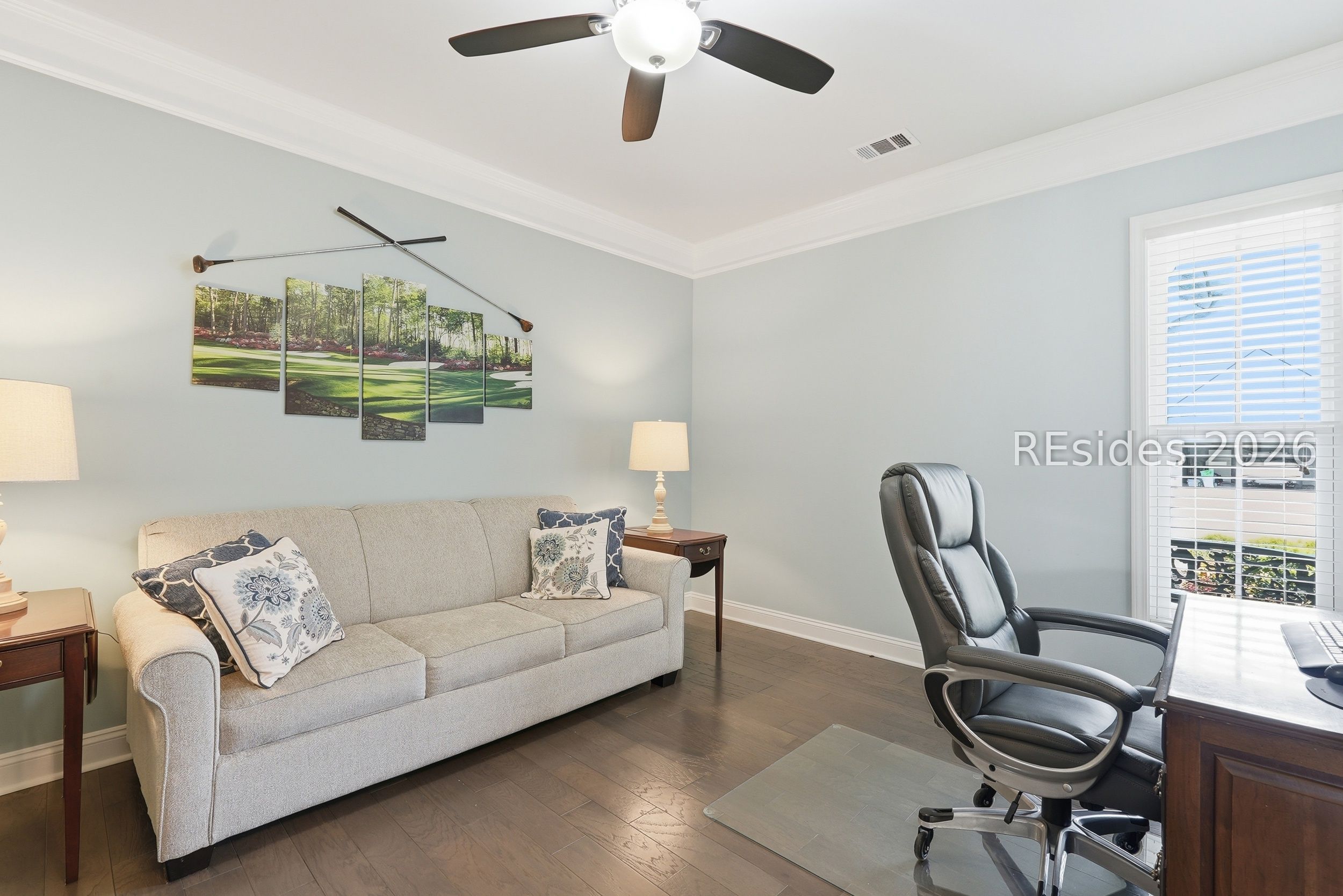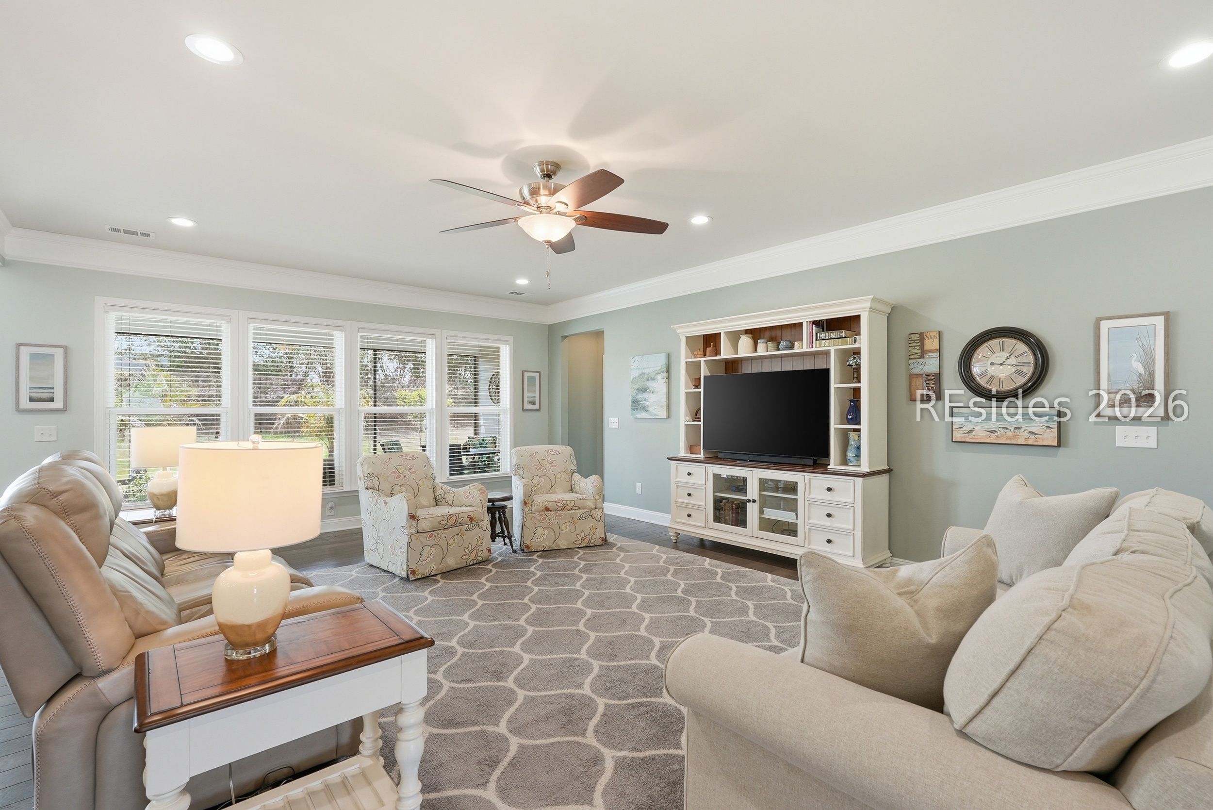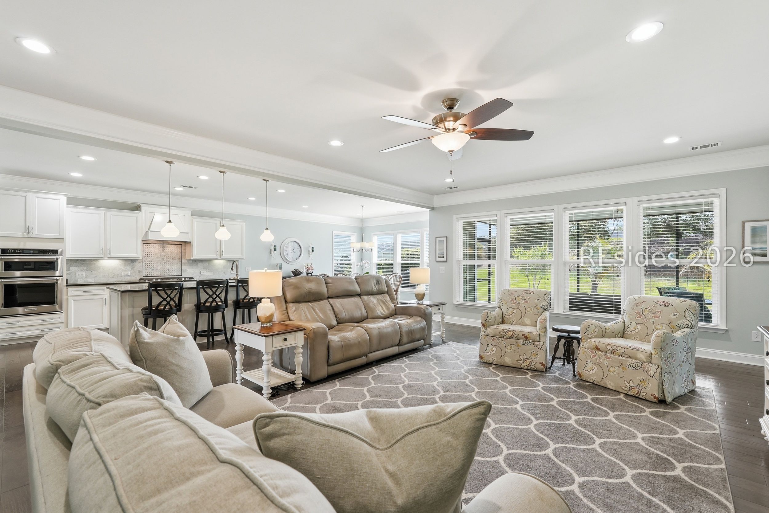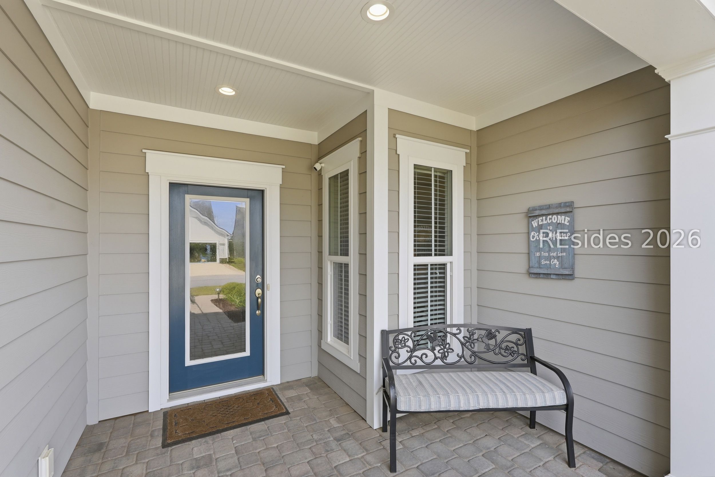Welcome to a beautifully appointed home in the highly sought-after Sun City Hilton Head community, offering a perfect blend of comfort, functionality, and Lowcountry lifestyle. This thoughtfully designed residence features 3 spacious bedrooms plus a versatile den/office/flex room, ideal for working from home, hobbies, or additional guest space. The heart of the home is the gourmet kitchen, complete with crisp white cabinetry, ample counter space, and a layout that flows seamlessly into the main living areas-perfect for both everyday living and entertaining. Wood flooring extends throughout, adding warmth and continuity to the home's design. The generously sized primary suite offers a relaxing retreat, highlighted by a spa-like bathroom featuring a super shower and excellent closet and storage space designed for easy organization. Two additional bedrooms provide comfortable accommodations for guests or family. Outdoor living is equally inviting, with a screened lanai overlooking a private backyard that offers a peaceful setting and a charming peek-a-boo lagoon view-perfect for enjoying quiet mornings or evening relaxation. Additional exterior upgrades include pavers that widen the driveway as well as an enhanced walkway leading to the front door, creating both curb appeal and convenience. A dedicated golf cart garage adds extra functionality and storage. Ideally situated in a central location within the community, this home provides easy access to the Lake House Amenity Center and the new Argent East Amenity Center, placing world-class amenities, fitness, dining, and social activities just moments away. Sun City Hilton Head is a premier active adult community offering an unmatched lifestyle with golf courses, resort-style pools, fitness centers, clubs, and countless opportunities to stay active and connected.