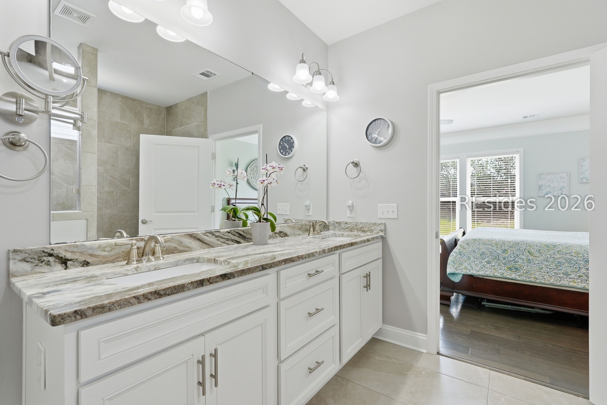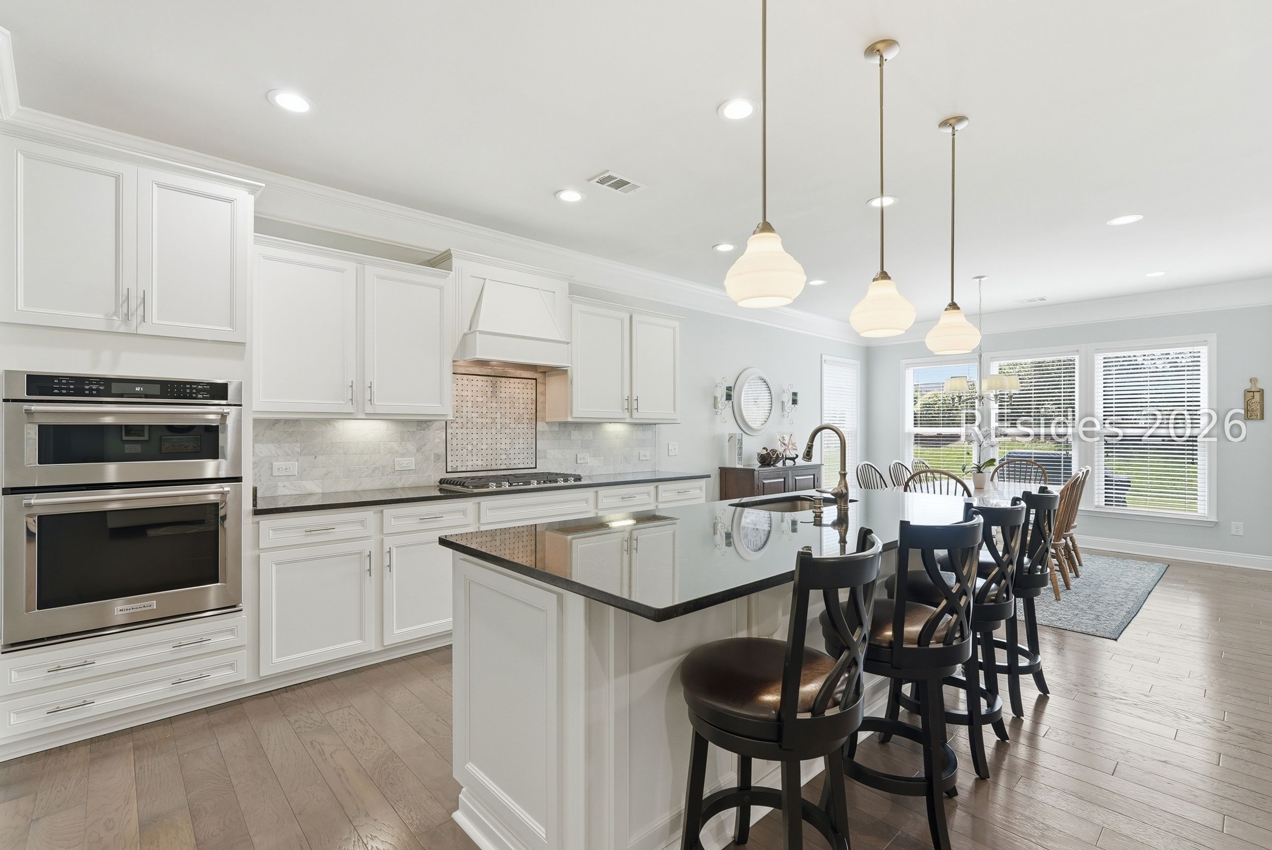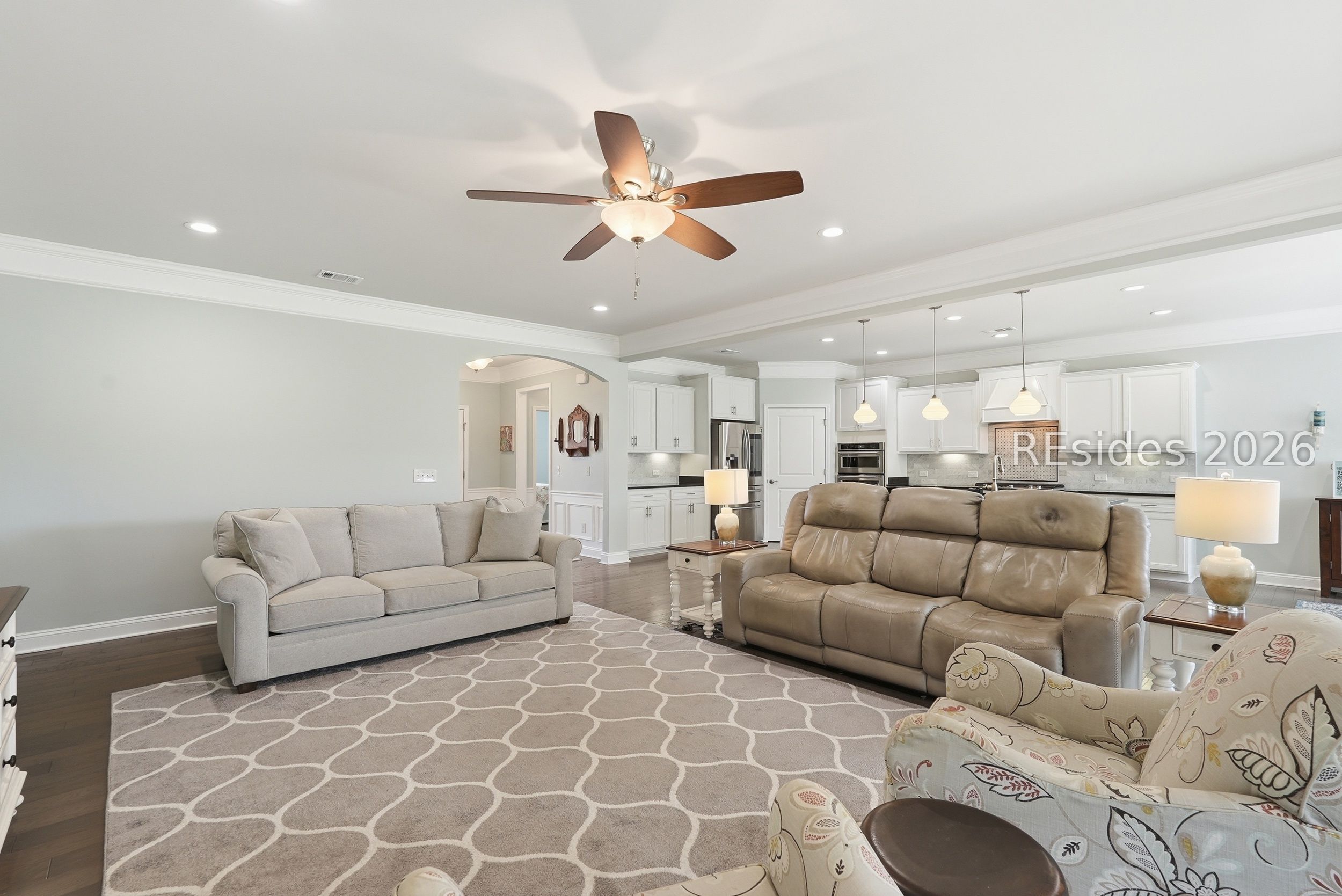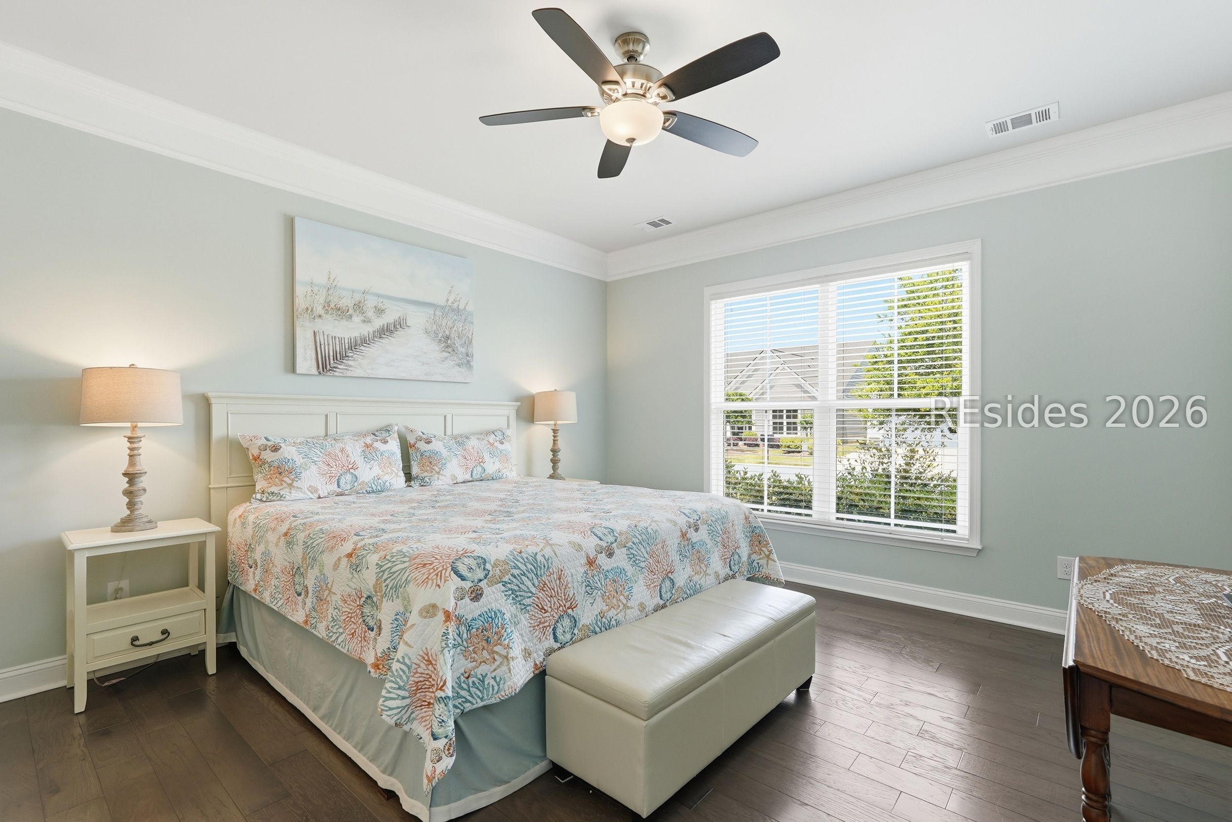 Welcome to a beautifully appointed home in the highly sought-after Sun City Hilton Head community, offering a perfect blend of comfort, functionality, and Lowcountry lifestyle. This thoughtfully designed residence features 3 spacious bedrooms plus a versatile den/office/flex room, ideal for working from home, hobbies, or additional guest space. The heart of the home is the gourmet kitchen, complete with crisp white cabinetry, ample counter space, and a layout that flows seamlessly into the main living areas-perfect for both everyday living and entertaining. Wood flooring extends throughout, adding warmth and continuity to the home's design. The generously sized primary suite offers a relaxing retreat, highlighted by a spa-like bathroom featuring a super shower and excellent closet and storage space designed for easy organization. Two additional bedrooms provide comfortable accommodations for guests or family. Outdoor living is equally inviting, with a screened lanai overlooking a private backyard that offers a peaceful setting and a charming peek-a-boo lagoon view-perfect for enjoying quiet mornings or evening relaxation. Additional exterior upgrades include pavers that widen the driveway as well as an enhanced walkway leading to the front door, creating both curb appeal and convenience. A dedicated golf cart garage adds extra functionality and storage. Ideally situated in a central location within the community, this home provides easy access to the Lake House Amenity Center and the new Argent East Amenity Center, placing world-class amenities, fitness, dining, and social activities just moments away. Sun City Hilton Head is a premier active adult community offering an unmatched lifestyle with golf courses, resort-style pools, fitness centers, clubs, and countless opportunities to stay active and connected.