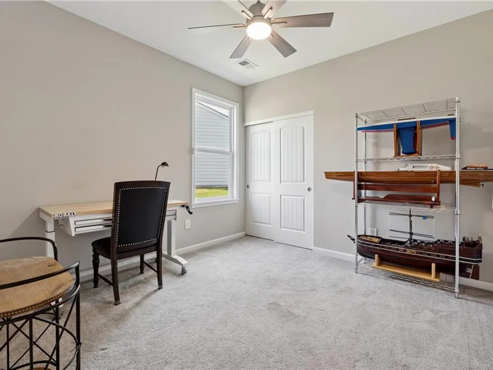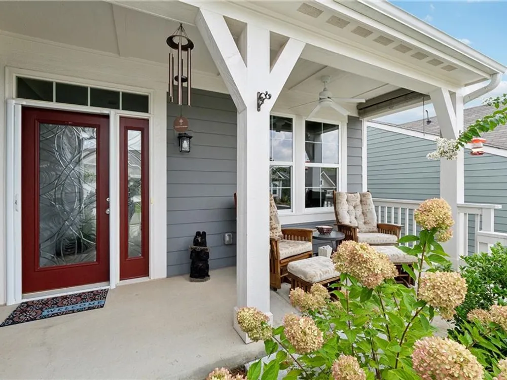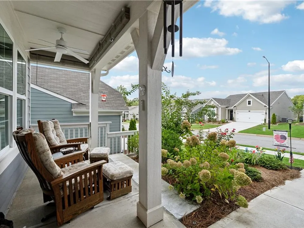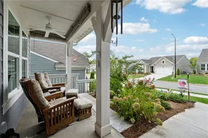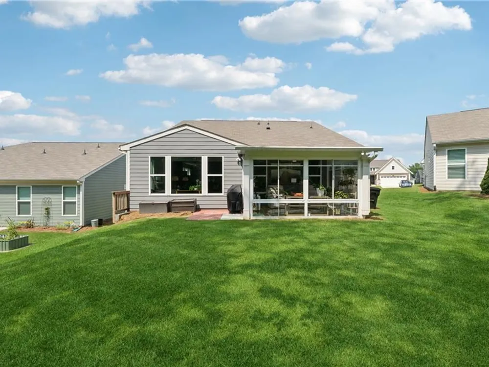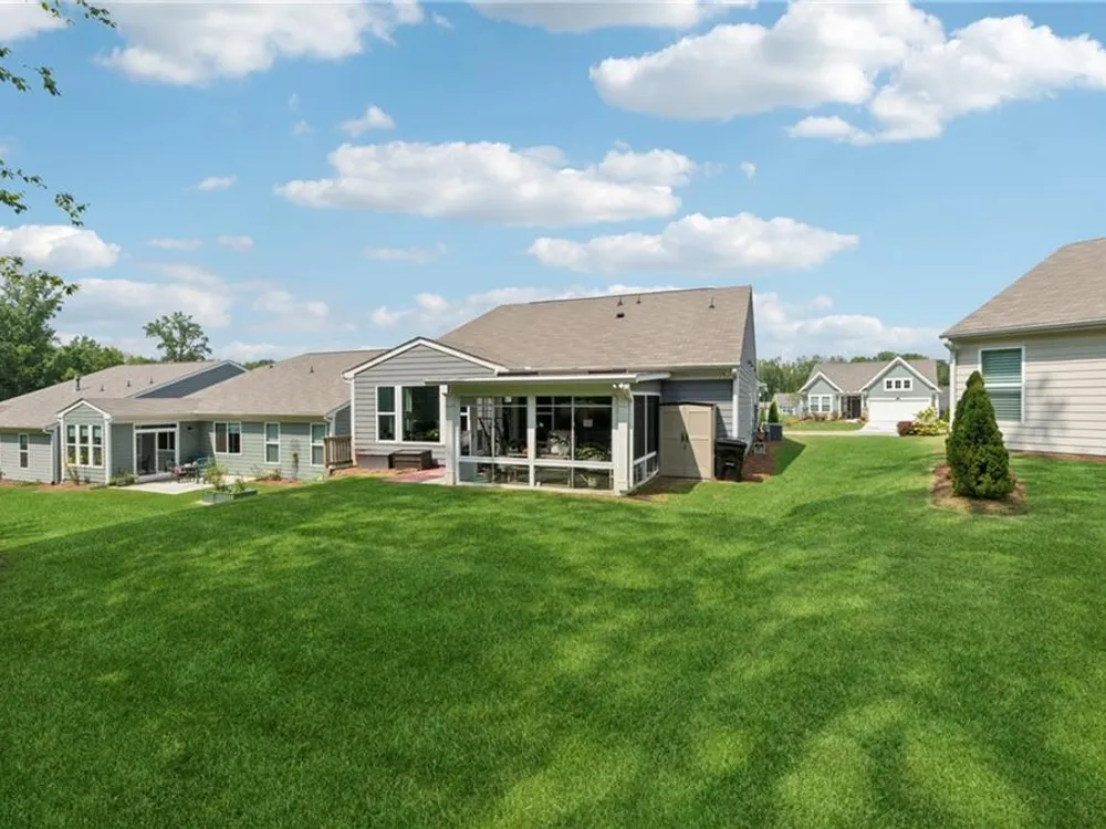Elegant Ranch in Gated 55+ Community – Premium Private Lot Welcome to this like-new, meticulously maintained 3 bedroom, 2 bath one level home with a desirable open floorplan and upscale finishes throughout. A charming rocking chair front porch sets the tone, while lawn maintenance provided by the HOA means carefree living. Inside, an elegant entry foyer with arched opening leads to a large office with glass double doors—ideal for private office or as a possible third bedroom. The gourmet kitchen features wood stained cabinetry with pull-out drawers, granite counters, pantry and upgraded stainless steel appliances including a five-burner cooktop, all overlooking the dining room with wainscoting and the spacious great room. The great room opens into a bright sunroom, perfect for entertaining and flows further into a professionally enclosed all-season porch with views of the private, tree-lined backyard at the end of a quiet street. The primary suite boasts a trey ceiling, hardwood flooring, spa-like bath with oversized glass shower, double sink granite vanity and a huge walk-in closet. A private guest suite, convenient laundry room and two-car garage with overhead shelving, insulated garage walls and door plus two garage windows for natural light, complete the thoughtful layout. Upgraded lighting and ceiling fans throughout add both style and comfort. Set on a premium lot in a gated 55+ active adult community, residents enjoy pickleball, clubhouse activities and a low-maintenance lifestyle—just minutes from shopping and dining.