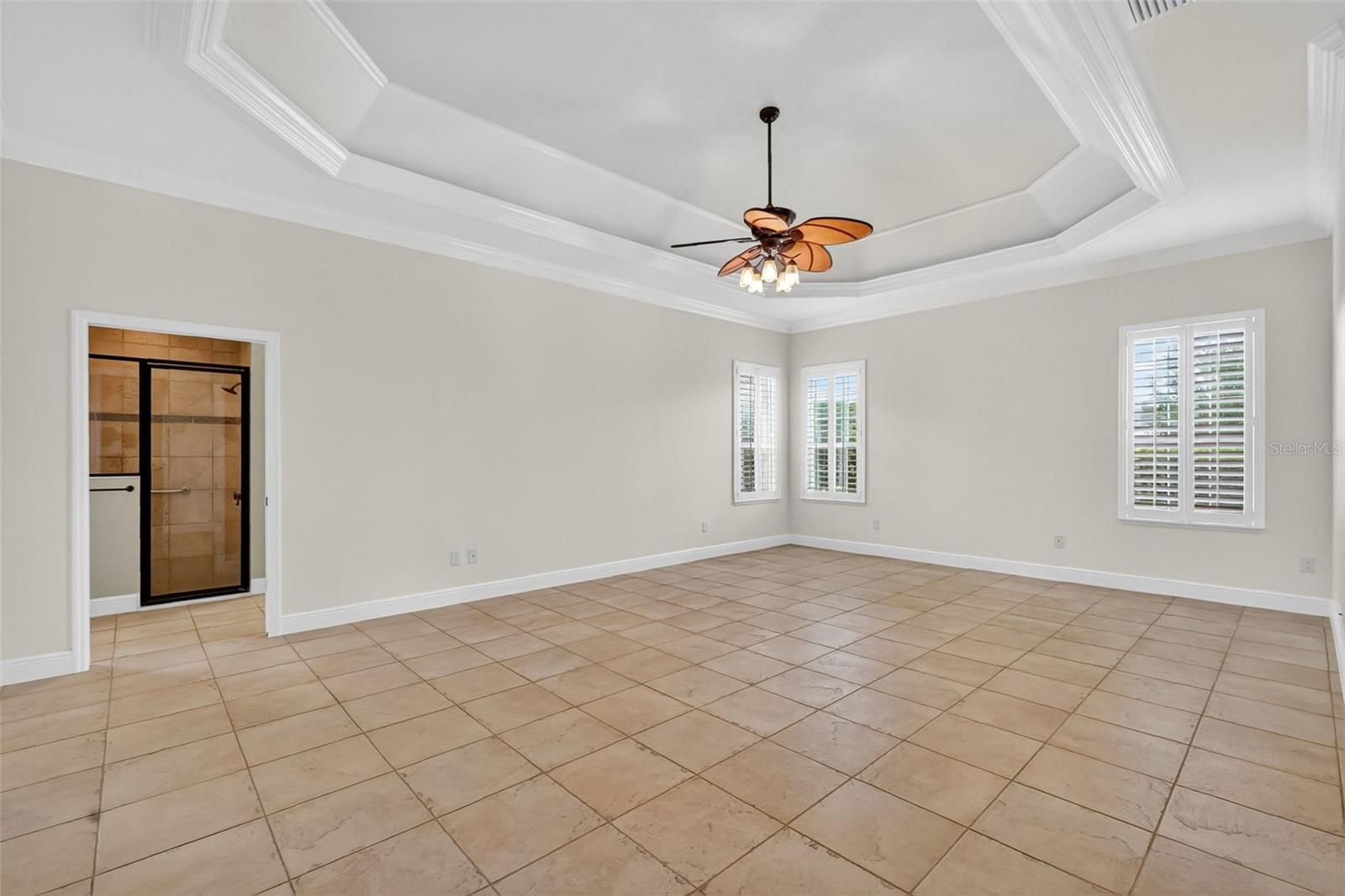 - Ceiling Fan(s), Crown Molding, Eat-in Kitchen, High Ceilings, Living/Dining Room, Open Floorplan, Main Level Primary, Split Bedrooms, Stone Counters, Thermostat, Tray Ceiling(s), Walk-In Closet(s)