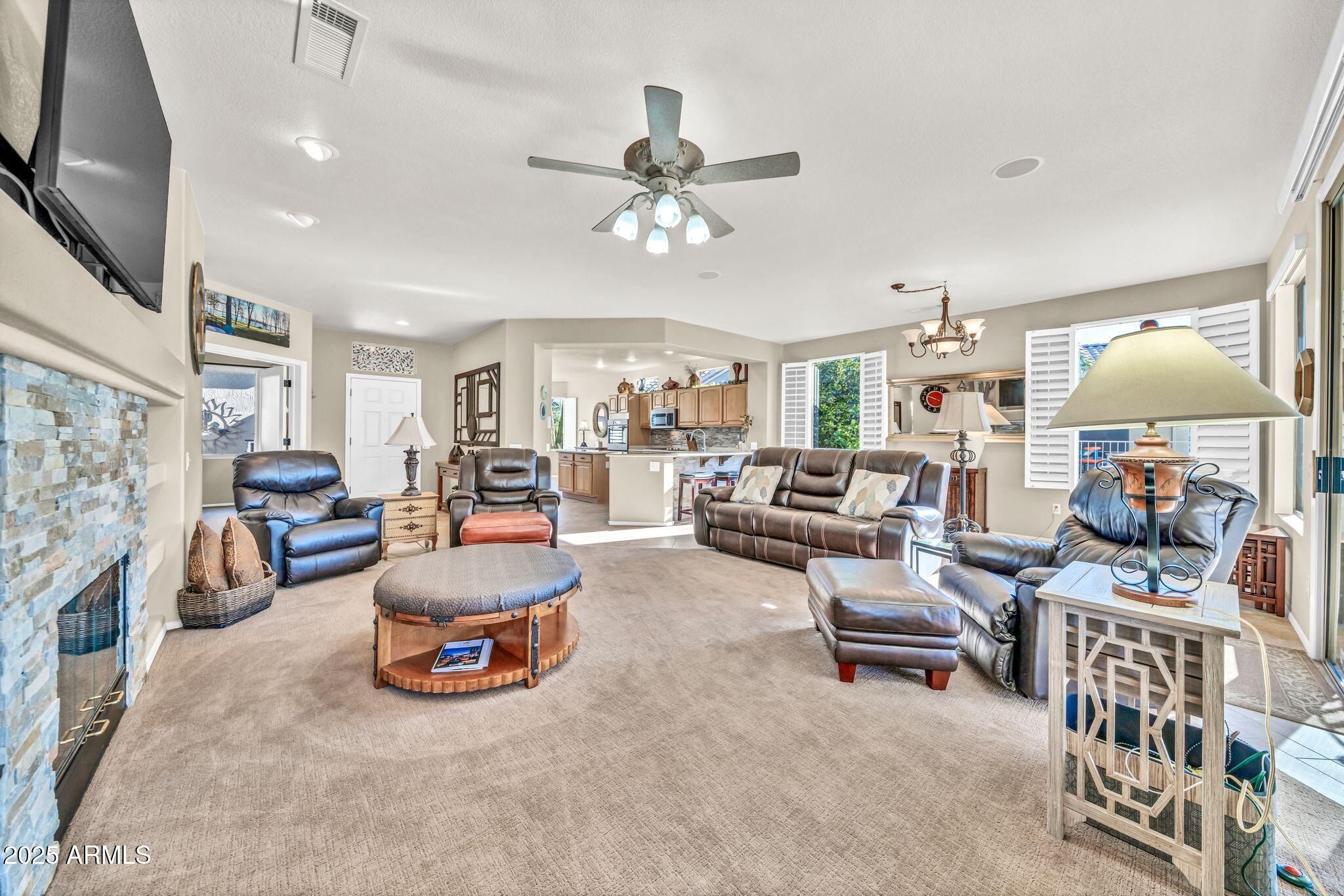 Enjoy 2 bedrooms + den, 2 baths, and a 2.5-car garage with golf cart bay—all designed for comfort and convenience. Set on the Granite Falls North Course, this home offers expansive views and unforgettable sunsets. Inside, the kitchen impresses with Corian counters, stainless appliances, and a gas cooktop. The family room features a cozy gas fireplace, while the private den adds flexibility. The primary suite bathroom pampers with dual sinks, a walk-in shower, and a soaking tub. Extras include washer/dryer, garage cabinets and an expanded patio with built-in BBQ—perfect for entertaining or relaxing under Arizona skies. Move-in ready and waiting for you!
