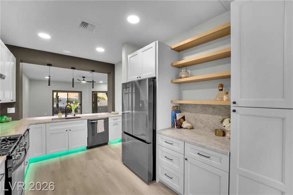 Beautifully remodeled 2 bed, 2 bath Huntley model in the highly desirable Sun City MacDonald Ranch community. This 1,674 sq ft home features thoughtfully selected, timeless finishes throughout, creating a warm and cohesive design that stands out from the rest. The functional layout offers comfortable living and easy entertaining. Enjoy a fully landscaped backyard with mature trees, low-maintenance desert landscaping, a charming garden feature, and solar lighting for added ambiance. Situated on a 6,969 sq ft lot, this move-in ready home also offers convenient access to nearby hiking trails, as well as a variety of dining, shopping, and entertainment options. A perfect blend of style, comfort, and low-maintenance living in a premier 55+ community.