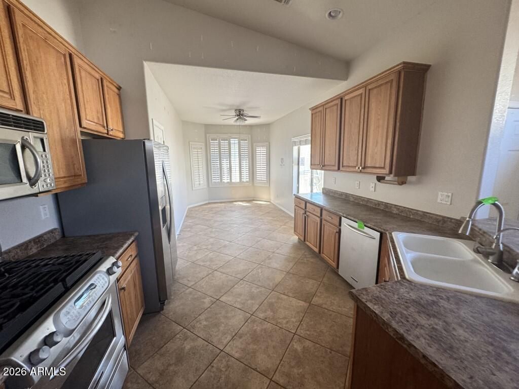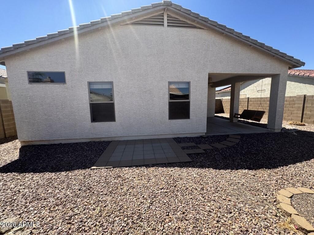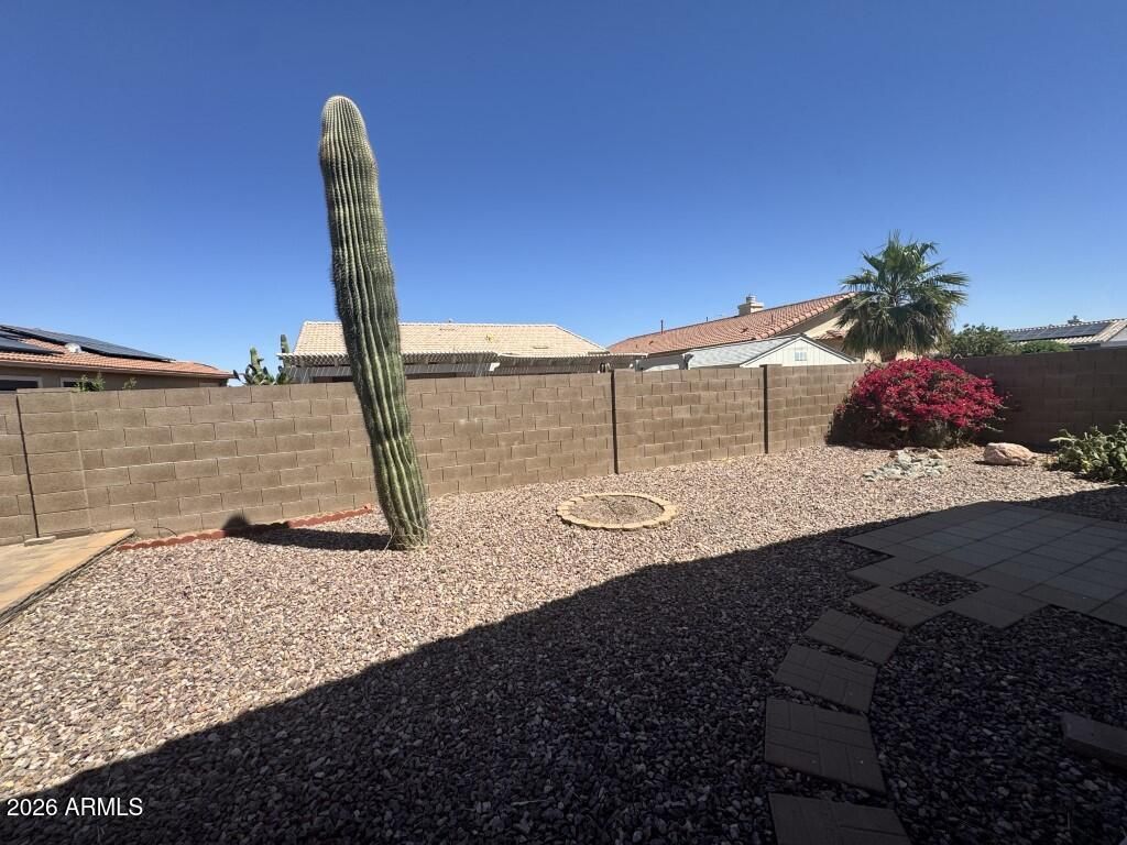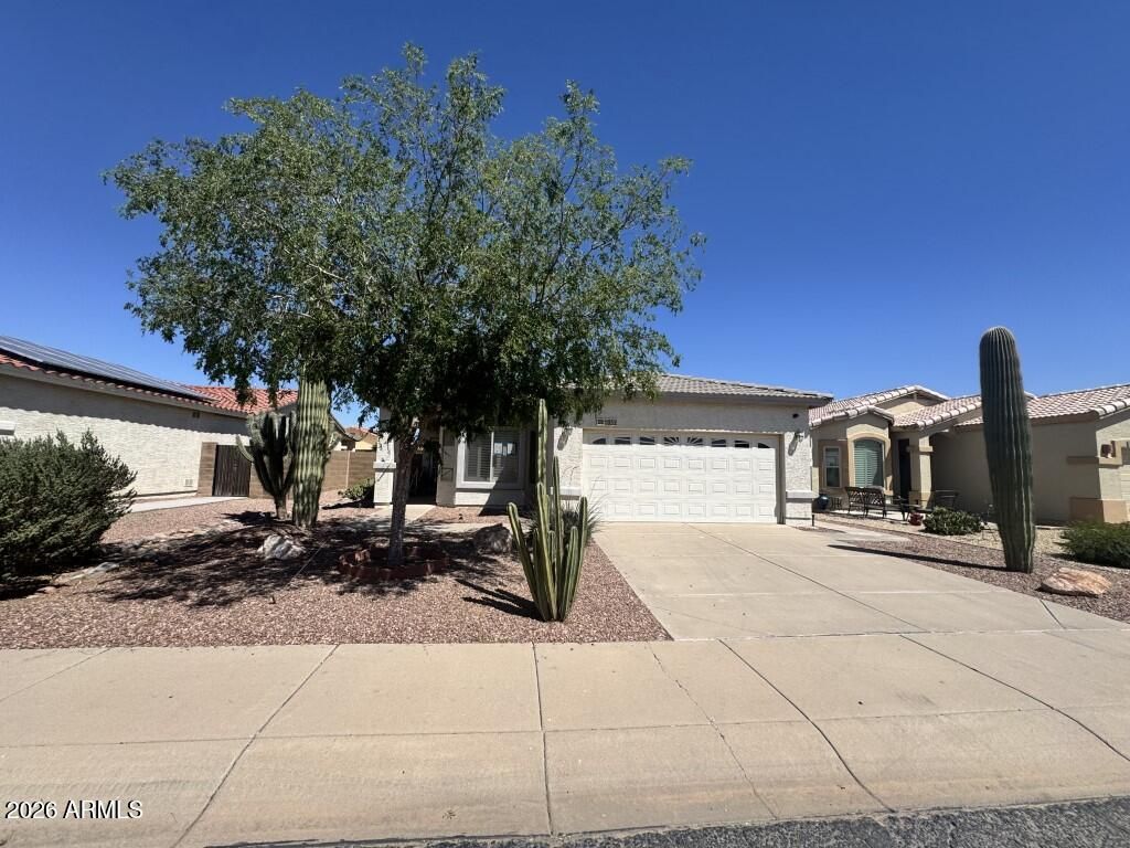 Discover easy living in this inviting single-story home nestled within the gated 55+ community of Villa De Jardines. Filled with natural light and vaulted ceilings, the open floor plan creates a warm and welcoming atmosphere perfect for both relaxing and entertaining. The kitchen offers generous cabinetry and a cozy dining nook, making everyday moments feel special. Retreat to the spacious primary suite featuring a walk-in closet and private bath designed for comfort. Step outside to a serene covered patio and low-maintenance desert landscaping ideal for enjoying Arizona's beautiful sunsets. Residents enjoy access to a heated pool, spa, and clubhouse, all conveniently located near golf, shopping, dining, and medical facilities. Experience the comfort and lifestyle you've been waiting for.