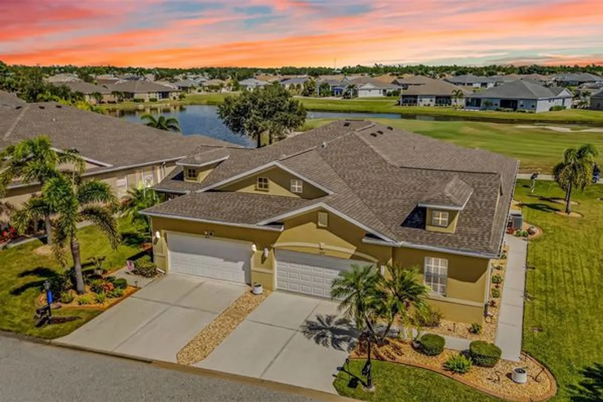 SENSATIONAL villa with majestic views of first hole, water/fountains and sunrise in the gated golf course/active resort of highly desirable Kings Gate, a 55+ community that is NOT in a flood zone and does NOT require flood insurance. This amazing villa (that includes GOLF CART) is loaded with updates - roof 2023, AC 2024, HWH 2023, impact windows throughout and accordion shutters for the ENCLOSED and EXTENDED under air lanai, LVP all throughout, ironstone quartz counters in kitchen and guest bath, SS appliances from 2021, epoxy floor in in garage and lanai, hang down storage in garage, plantation shutters on windows and lanai sliders and more!!! Talk about MOVE-IN ready - come live the Florida dream lifestyle with this amazing view. Step inside this villa and you'll notice the high ceilings - the built-in custom cabinet that can easily be used as a coffee station and/or bar. Open concept seamlessly combines kitchen with dining and living room - which opens up to the enclosed and under air lanai offering SPECTACULAR views of the first hole and water/fountains. Just off the dining room is the study/den. The master bedroom is in the back left of the villa with the guest bedroom in the front right - offering plenty of privacy for both you and your guests. In addition to the guest bath this villa also offers a 1/2 bath plus, large laundry room with extra cabinets. And if you haven't been to Kings Gate before - you're going to love the options for activity (Olympic size heated swimming pool and spa, tennis courts, pickle ball, lawn bowling, shuffle board, bocce, horseshoes, gym, billiards, library, euchre, bingo, bridge, Texas hold em, poker, mahjong and more). The onsite AND NEWLY REMODELED Lions Den restaurant and bar is super convenient and also offers Tuesday night Karaoke and monthly trivia contests. Many residents love the fact that they are just a golf cart ride away from the shopping plaza that provides you access to grocery store (ALDI), drug store, bank, restaurants and shopping. Want to explore outside of Kings Gate – you are minutes away from the restaurants and shops of downtown Punta Gorda and Fisherman's village. And if you want to explore more of Florida's fun spots you’re near I75 to quickly head north or south. An AWESOME villa with TONS of updates and a SENSATIONAL view in a PREMIER gated community needs to be experienced. Call today for a private showing and a golf cart tour of the community/amenities.