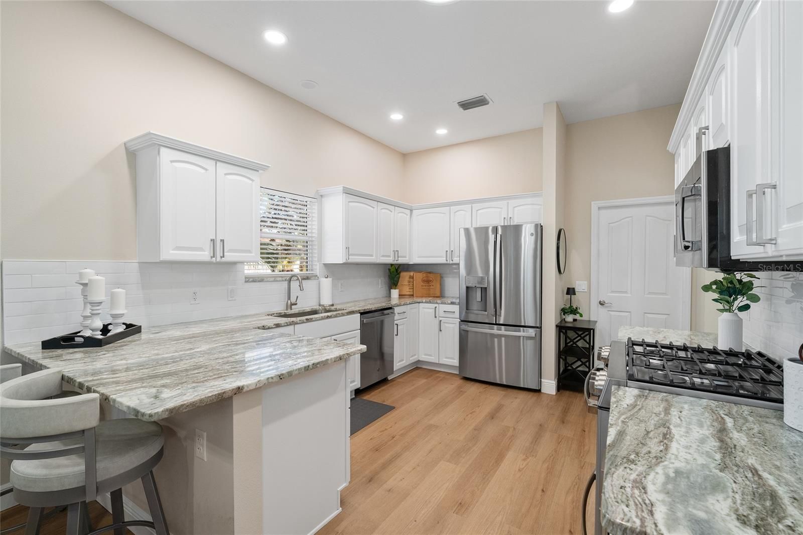 Fully Updated • Turnkey • Prime Location Near Lake Sumter Landing Enjoy move-in ready living in this beautifully upgraded, turnkey home in the highly desirable Village of Poinciana, just minutes from Lake Sumter Landing. Major system updates include a roof (2020), water heater (2025), HVAC coil (2022). The interior has been extensively improved in 2024–2025 with high-quality finishes and modern style, including luxury vinyl plank flooring throughout (no carpet), hand-troweled ceilings, granite countertops, stainless appliances with gas range, a tile backsplash, 5-inch baseboards, plantation shutters, updated lighting and ceiling fans, and four solar tubes. The stunning entry features a custom glass front door with sidelight, creating standout curb appeal and a bright, welcoming foyer. A bay window in the kitchen nook brings in abundant natural light. A whole-home water filtration system installed (2025). Storage and function are equally strong with pull-down attic stairs and a floored attic, gutters, epoxy-coated garage floor, and an oversized golf car garage. Outdoor living is a highlight with a peaceful backyard, expanded patio, and lanai. Offered turnkey with furnishings and décor included. This home is clean, stylish, and ready for immediate enjoyment. Just minutes away, Lake Sumter Landing offers nightly live music, waterfront dining, shopping, and entertainment, with Cane Garden Country Club, pools, and golf nearby.