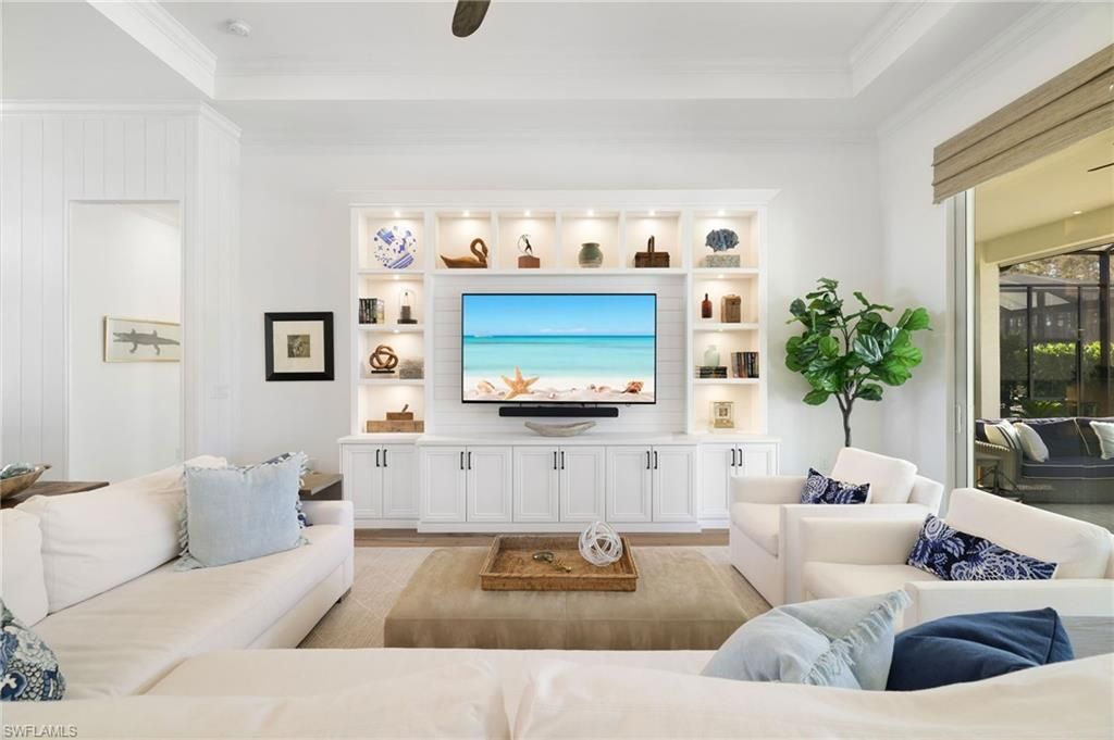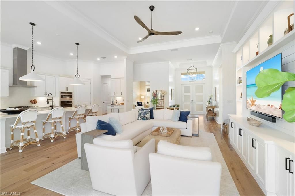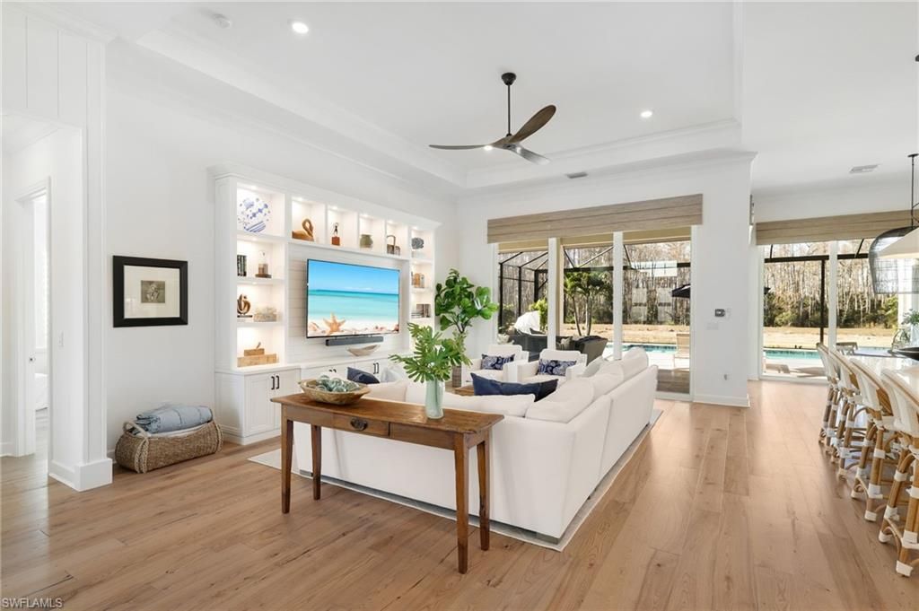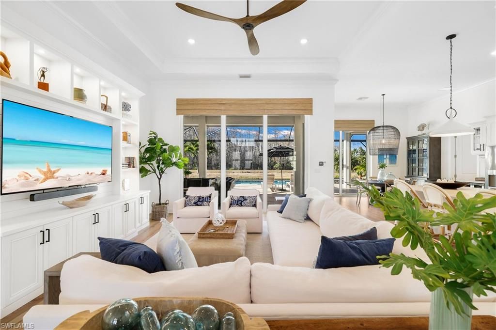 Coastal Elegance Meets Resort-Style Living in WildBlueExperience elevated Florida living in this extensively upgraded single-level Iris model, where coastal textures, custom finishes, and effortless indoor-outdoor design create a refined yet relaxed retreat. Light-filled living spaces flow seamlessly to a spectacular private lanai with pool, spa, outdoor kitchen, mounted TV, and hurricane-rated remote Kevlar screens—perfect for year-round enjoyment and entertaining.Inside, the home has been thoughtfully enhanced with a custom enclosed study featuring frosted glass and wood sliding doors, a built-in entertainment and display wall with LED lighting. The kitchen has been elevated with a dry bar and beverage refrigerator, complemented by custom storage solutions throughout every closet and pantry.Additional upgrades include plantation shutters on all interior windows, decorative cornices, designer lighting and fans, custom shiplap accents at the entry and study, upgraded laundry with LG front-load washer and dryer plus secondary washer, hurricane-rated frosted glass front entry doors, Bahama shutters, new front landscaping, dusk-to-dawn exterior lighting, impact-resistant sliders, and soaring 12–13 ft ceilings.Offering nearly 3,000 sq ft under air with 4 bedrooms and 3 baths, this home features wood flooring throughout the main living areas and bedrooms, a bright white quartz kitchen with GE Profile appliances, solid wood doors, and exceptional attention to detail throughout.Residents of WildBlue enjoy a premier resort lifestyle with a clubhouse, cabana bar, indoor dining, marina, pickleball and tennis courts, lap pool, staffed fitness center, spa, concert lawn, and more—just 15 minutes to RSW International Airport.