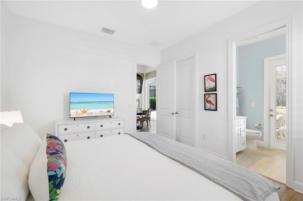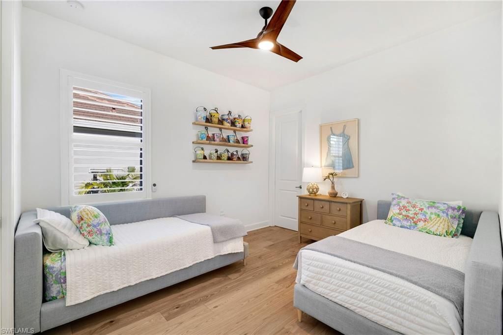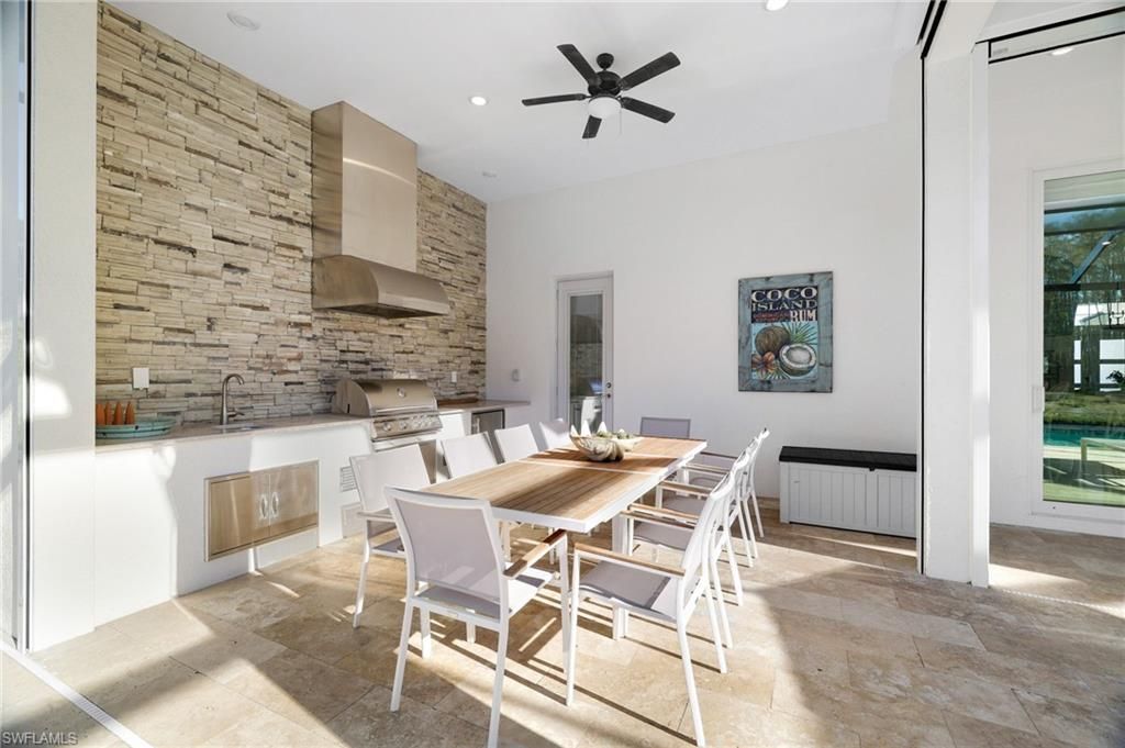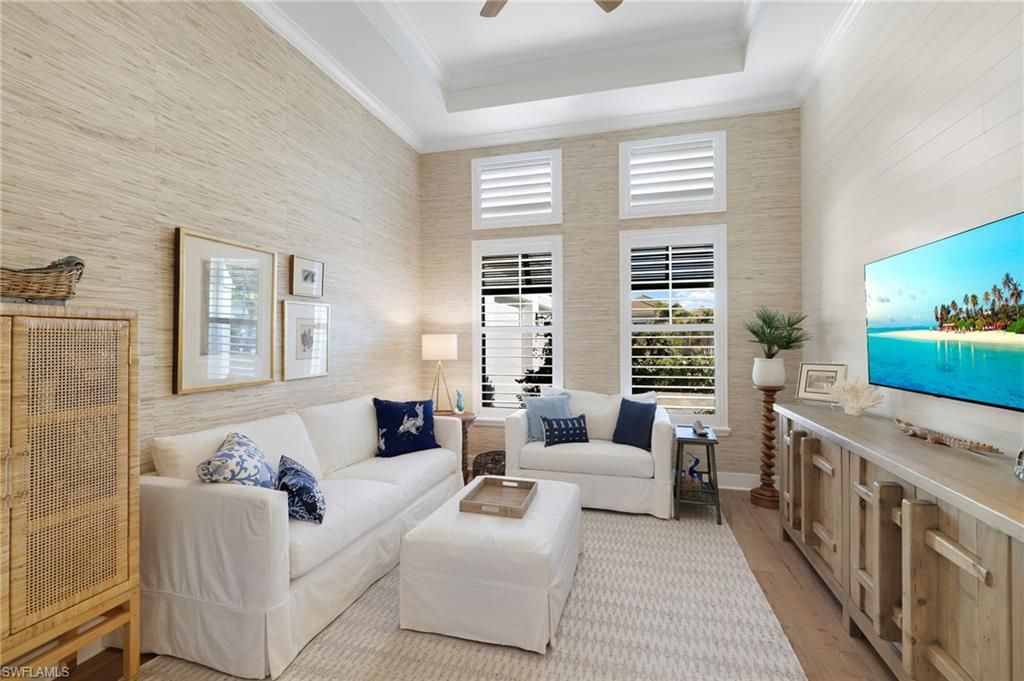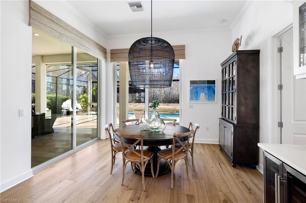 Coastal Elegance Meets Resort-Style Living in WildBlueExperience elevated Florida living in this extensively upgraded single-level Iris model, where coastal textures, custom finishes, and effortless indoor-outdoor design create a refined yet relaxed retreat. Light-filled living spaces flow seamlessly to a spectacular private lanai with pool, spa, outdoor kitchen, mounted TV, and hurricane-rated remote Kevlar screens—perfect for year-round enjoyment and entertaining.Inside, the home has been thoughtfully enhanced with a custom enclosed study featuring frosted glass and wood sliding doors, a built-in entertainment and display wall with LED lighting. The kitchen has been elevated with a dry bar and beverage refrigerator, complemented by custom storage solutions throughout every closet and pantry.Additional upgrades include plantation shutters on all interior windows, decorative cornices, designer lighting and fans, custom shiplap accents at the entry and study, upgraded laundry with LG front-load washer and dryer plus secondary washer, hurricane-rated frosted glass front entry doors, Bahama shutters, new front landscaping, dusk-to-dawn exterior lighting, impact-resistant sliders, and soaring 12–13 ft ceilings.Offering nearly 3,000 sq ft under air with 4 bedrooms and 3 baths, this home features wood flooring throughout the main living areas and bedrooms, a bright white quartz kitchen with GE Profile appliances, solid wood doors, and exceptional attention to detail throughout.Residents of WildBlue enjoy a premier resort lifestyle with a clubhouse, cabana bar, indoor dining, marina, pickleball and tennis courts, lap pool, staffed fitness center, spa, concert lawn, and more—just 15 minutes to RSW International Airport.