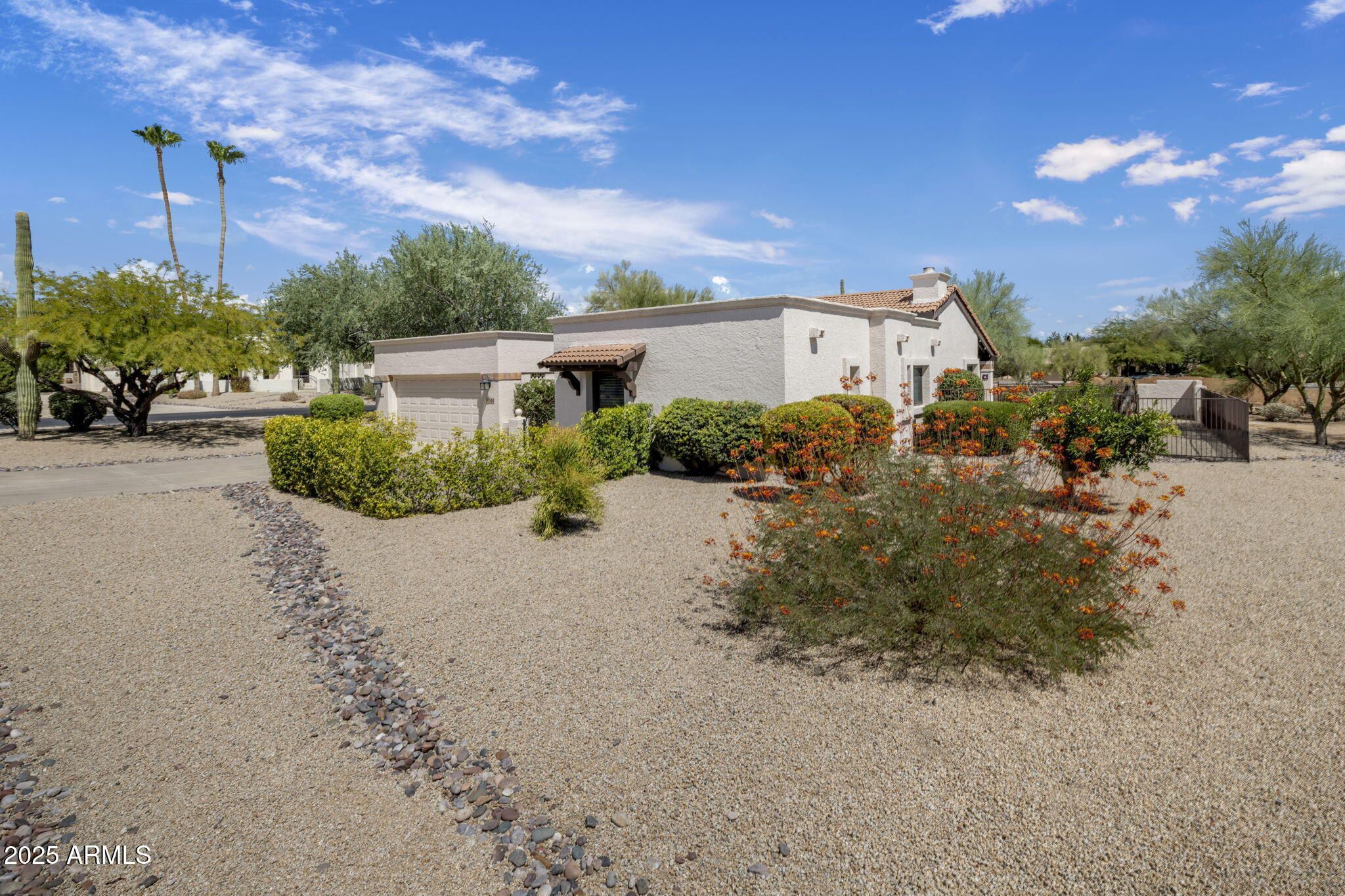 PRICE IMPROVEMENT, Move in Ready to this charming 2-bedroom, 2-bathroom home in the sought-after Rio Verde golf community. Perfectly situated on an oversized lot of nearly 16,000 sq. ft., this 1,408 sq. ft. residence offers comfort, space, and a light-filled floor plan. Cathedral ceilings and abundant windows create an airy feel throughout the living spaces, while the spacious primary suite provides a private retreat with room to relax. The kitchen and dining areas flow seamlessly for everyday living and entertaining. Step outside to the covered back patio and enjoy the expansive lot with endless potential for outdoor living. A 2-car garage adds convenience and storage. With its oversized lot, natural light, and welcoming design, this Rio Verde gem is ready to be enjoyed.