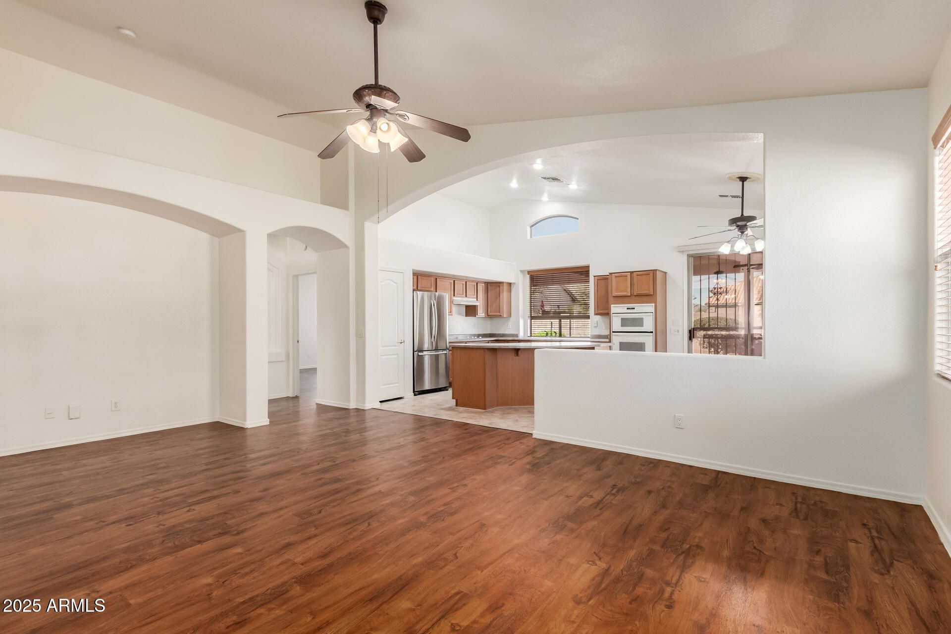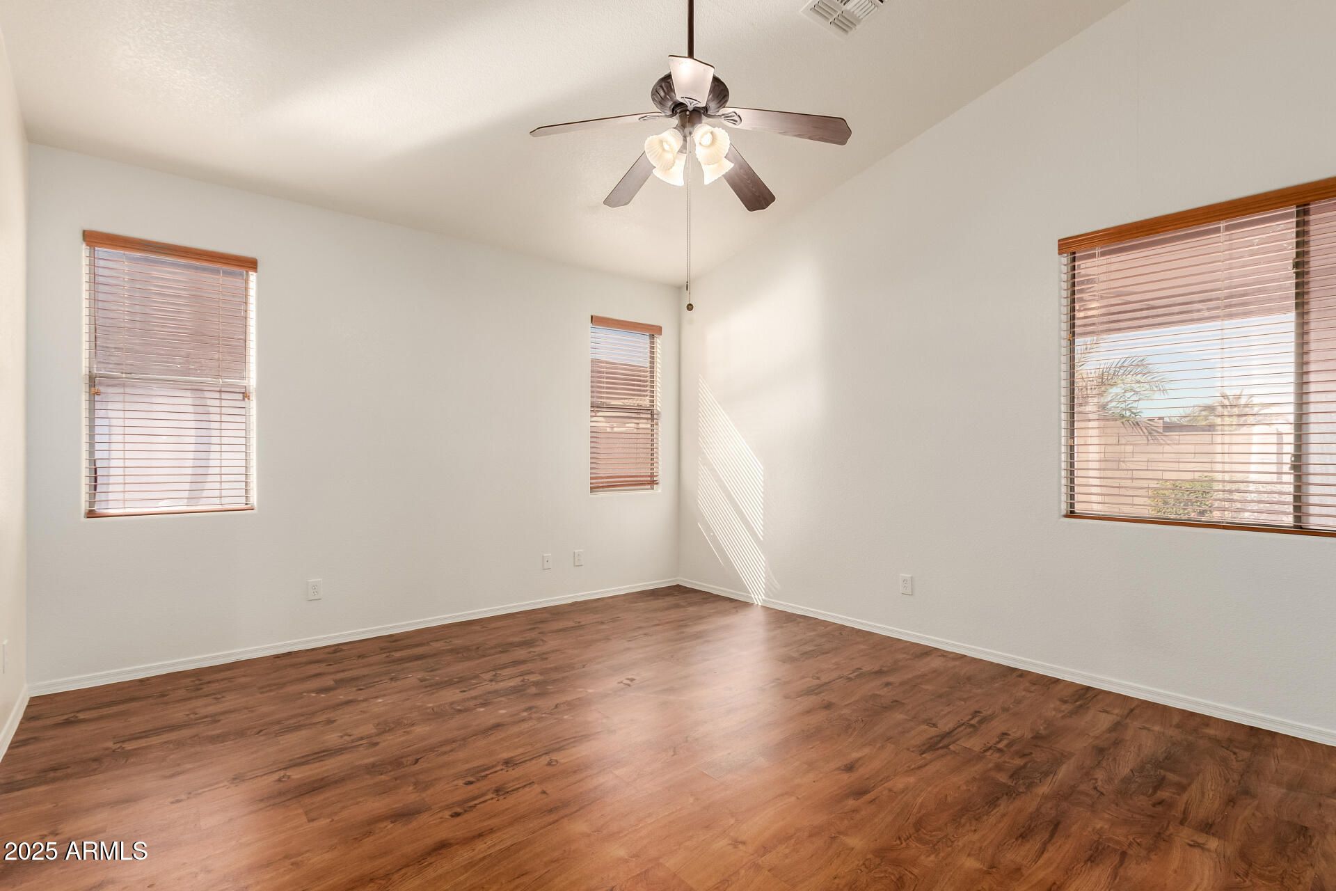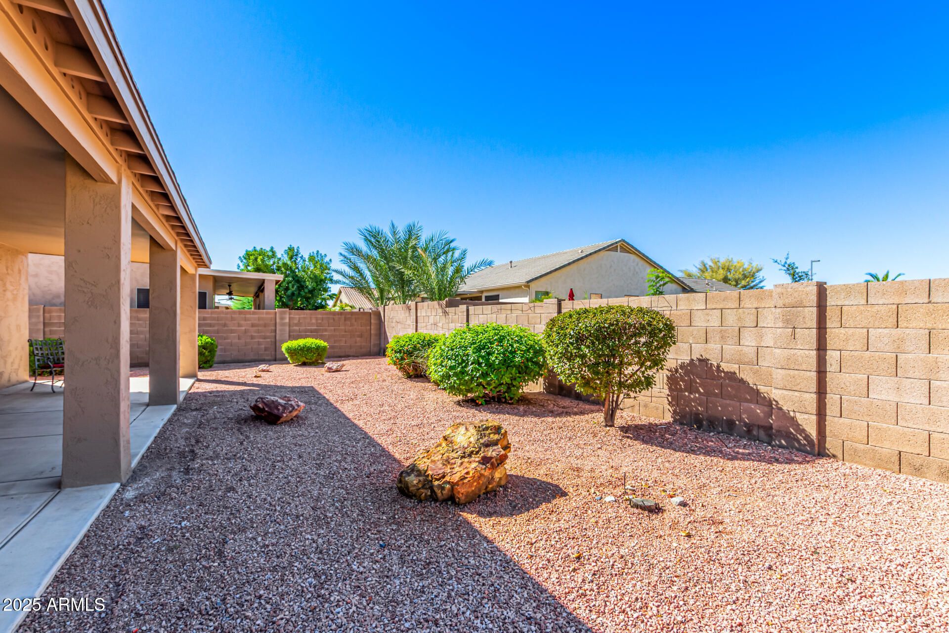 Welcome to your dream home in the vibrant 55+ community of Arizona Traditions! This charming 2-bedroom home with a den has been freshly painted inside and out, ready for you to make it your own.Step inside to find a bright and inviting living room with vaulted ceilings and beautiful wood-look flooring. The den is perfect for a home office or reading nook. The kitchen shines with built-in wall ovens, neutral cabinetry, a pantry, and a center island with a breakfast bar for casual dining.Retreat to the main bedroom, featuring a private bathroom with dual sinks and a walk-in closet. Enjoy relaxing moments in the backyard under the covered patio—perfect for morning coffee or evening unwinding.See more