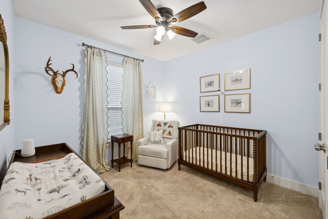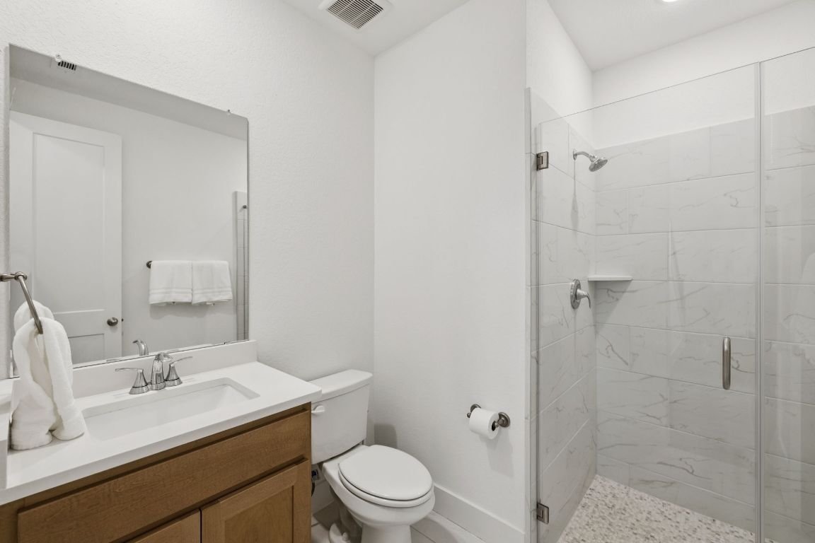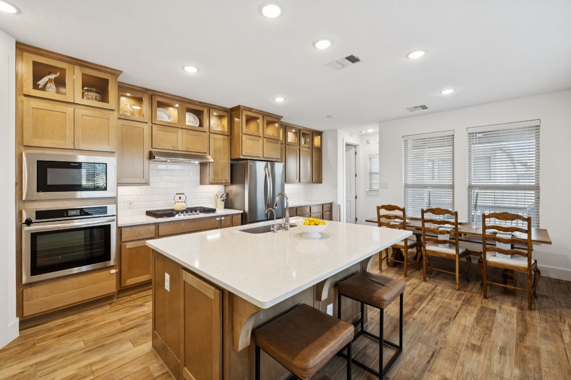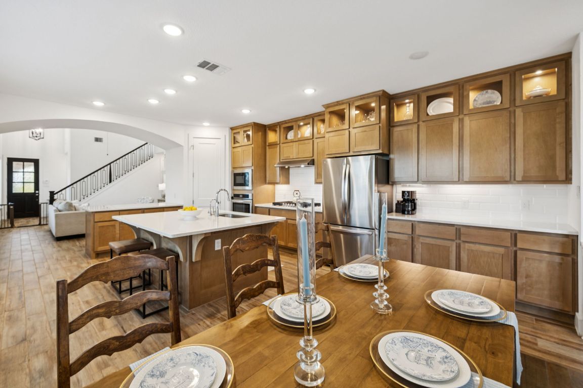 Welcome to Veramendi — New Braunfels living at its best! This corner-lot home blends privacy, style, and function, all while keeping you minutes from downtown, rivers, and the Hill Country. The neighborhood itself is a lifestyle upgrade with a resort-style pool, parks, and miles of jogging trails right outside your door. Step inside this 2023 build to a bright, open-concept layout where soaring ceilings and expansive windows fill the home with natural light. The living room centers around a fireplace, while the chef’s kitchen shines with quartz countertops, stylish backsplash, premium appliances, a walk-in pantry, and under-cabinet lighting. Perfect flow between kitchen, dining, and living makes entertaining effortless. The downstairs primary suite is a true retreat, complete with a large window seat and a fully remodeled en-suite bath boasting a marble double vanity with gold accents, standalone soaking tub, tiled walk-in shower, and an expansive walk-in closet with built-ins. Upstairs, a versatile loft pairs with spacious bedrooms, each with walk-in closets, and a full bath with quartz vanity. Additional features include wood tile flooring in main spaces, multiple storage closets, utility room with hanging rod, two tankless water heaters, reverse osmosis system, water softener, and security pre-wire. The covered back porch is ideal for relaxing, and the epoxy-floored garage with built-in shelving adds both function and style. Here in Veramendi, you’re not just buying a house — you’re stepping into the New Braunfels lifestyle.