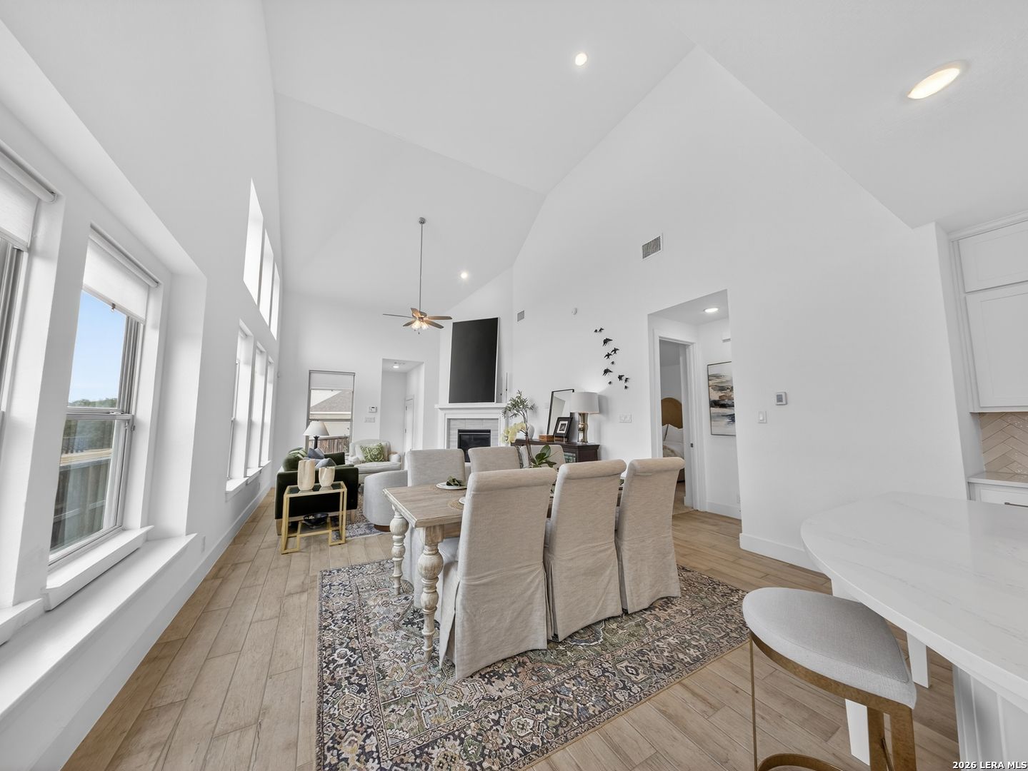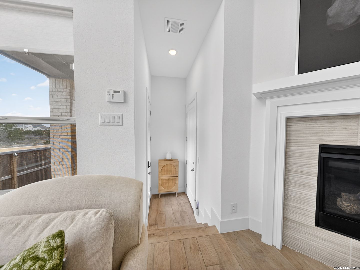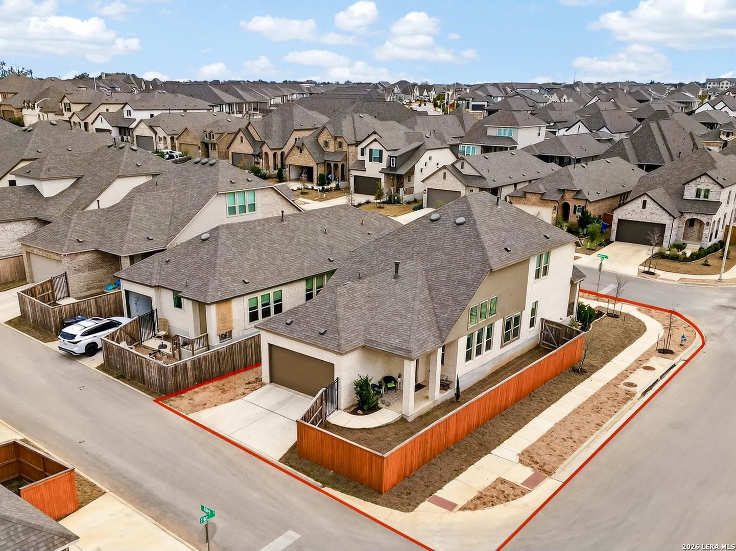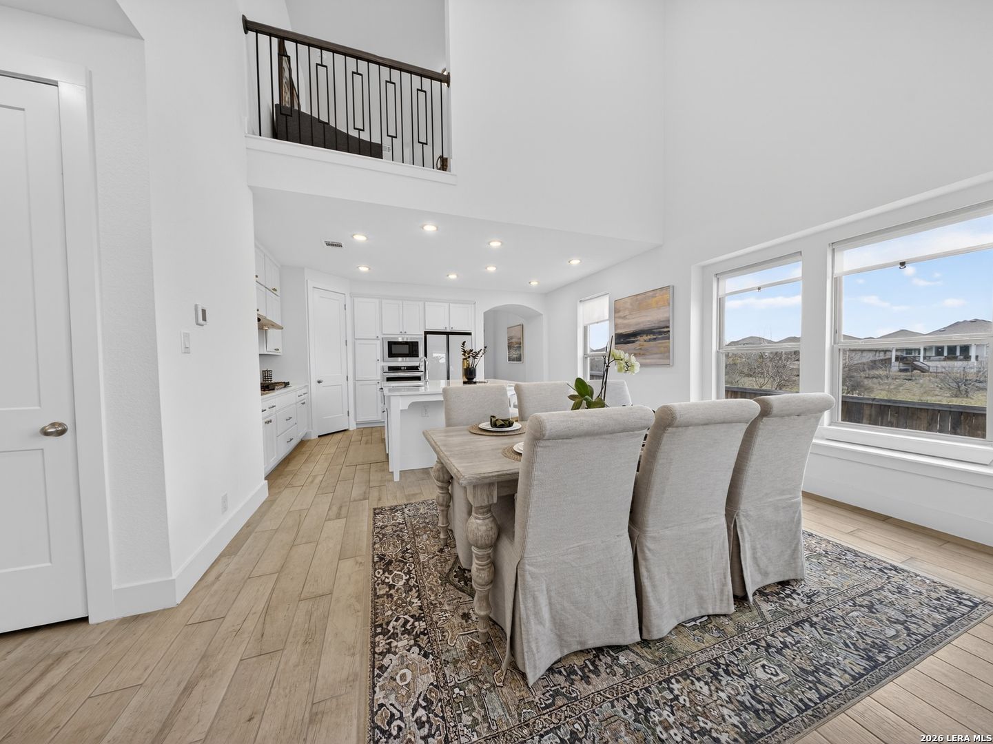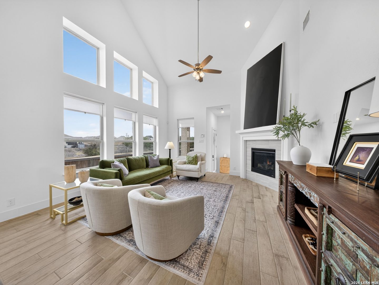 Premier corner lot in the highly sought after Veramendi community, this Highland Homes built residence delivers true luxury living with high end upgraded finishes, thoughtful design, and one of the most impressive sunset views in the neighborhood. Soaring 25' ceilings and dramatic floor to ceiling windows flood the home with natural light while showcasing unobstructed views of the adjacent green space and expansive Texas skies. The open concept main level features upgraded wood like tile flooring, a gas fireplace, a chef inspired kitchen highlighted by abundant quartz countertops, an extra large upgraded quartz island, floor to ceiling built in cabinetry, a stainless steel gas cooktop, built in microwave, dishwasher, upgraded herringbone porcelain tile backsplash, and a Samsung glass front refrigerator, creating a refined yet functional space for entertaining and everyday living. The primary suite is conveniently located on the main level and offers a spa like retreat with a standalone soaking tub, frameless glass shower, and a generous walk in closet, while a secondary bedroom and full bath are also located on the main level, ideal for guests or multi generational living. An iron staircase leads upstairs to a spacious loft overlooking the main living area and is complemented by additional bedrooms 3 & 4: plus, a 3rd full bath, all with walk in closets and abundant storage throughout. Additional features include a covered back patio, exclusive rear parking with an attached oversized 2 car garage, attic storage, privacy fence, tankless water heater, water softener, in ground drip irrigation system, keyless entry, dual programmable heating and cooling, and programmable motion detection security. Only half a block from neighborhood parks and scenic walking trails, with access to the community pool, clubhouse, and just a short walk to top rated schools within and near Veramendi, this home offers an elevated lifestyle with convenience. Quick access to SH 46, Loop 337, near I-35, Landa Park, the Comal and Guadalupe Rivers, Gruene Historic District, Gruene Hall, and an easy commute to San Antonio & Austin, opportunities like this are rare. Select furniture pieces are available for purchase, schedule your private showing today and bring your offer before this exceptional home is gone!