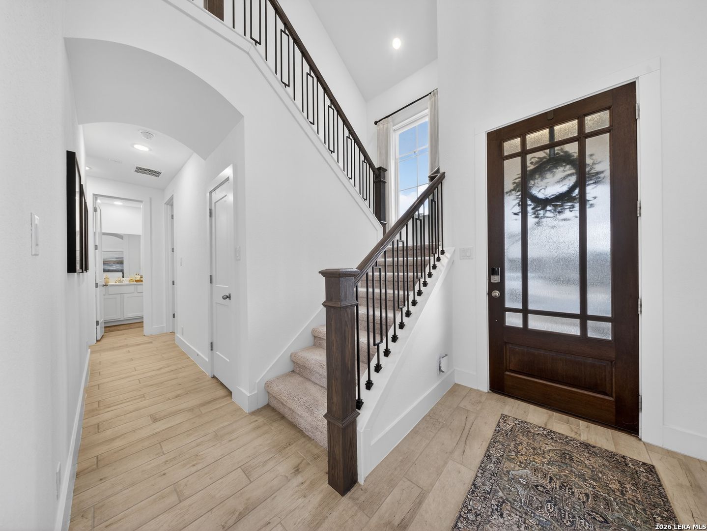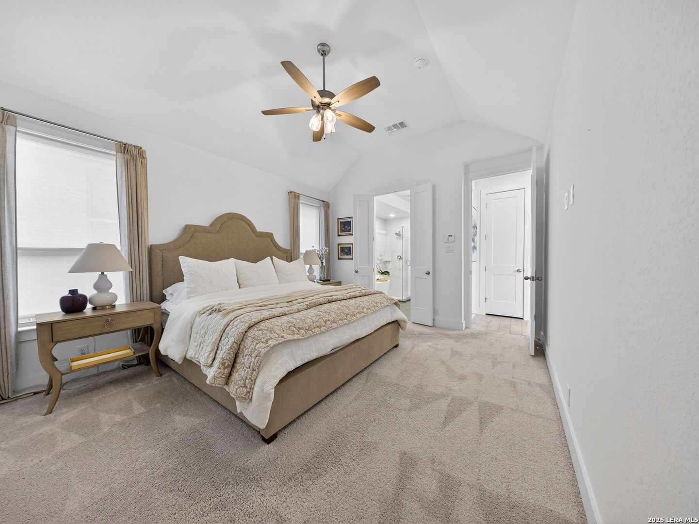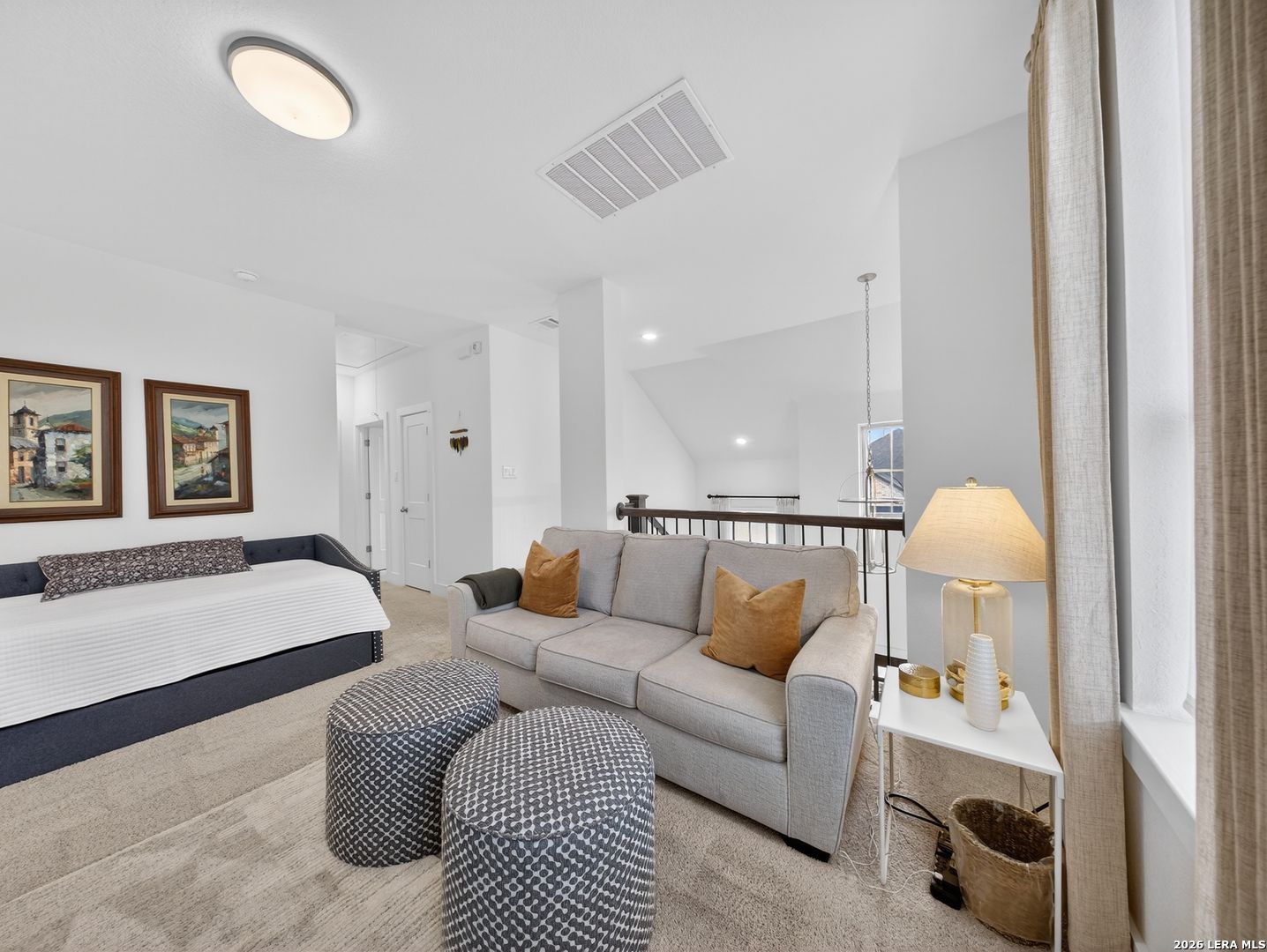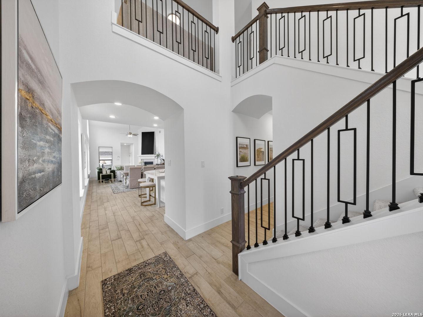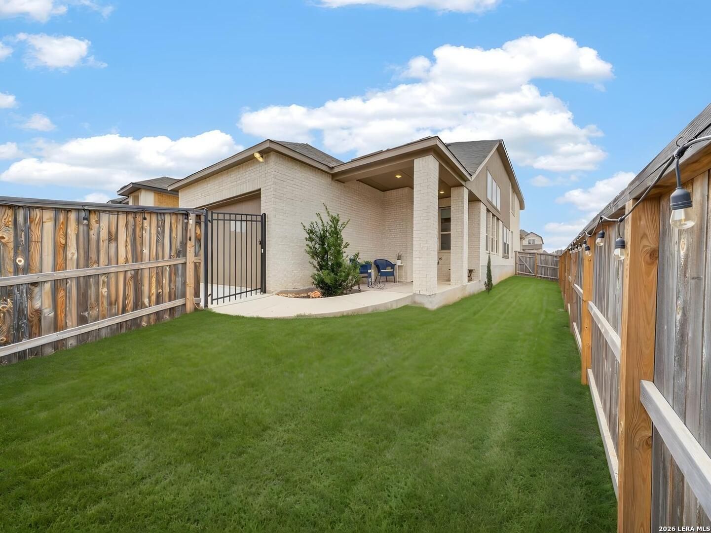 Premier corner lot in the highly sought after Veramendi community, this Highland Homes built residence delivers true luxury living with high end upgraded finishes, thoughtful design, and one of the most impressive sunset views in the neighborhood. Soaring 25' ceilings and dramatic floor to ceiling windows flood the home with natural light while showcasing unobstructed views of the adjacent green space and expansive Texas skies. The open concept main level features upgraded wood like tile flooring, a gas fireplace, a chef inspired kitchen highlighted by abundant quartz countertops, an extra large upgraded quartz island, floor to ceiling built in cabinetry, a stainless steel gas cooktop, built in microwave, dishwasher, upgraded herringbone porcelain tile backsplash, and a Samsung glass front refrigerator, creating a refined yet functional space for entertaining and everyday living. The primary suite is conveniently located on the main level and offers a spa like retreat with a standalone soaking tub, frameless glass shower, and a generous walk in closet, while a secondary bedroom and full bath are also located on the main level, ideal for guests or multi generational living. An iron staircase leads upstairs to a spacious loft overlooking the main living area and is complemented by additional bedrooms 3 & 4: plus, a 3rd full bath, all with walk in closets and abundant storage throughout. Additional features include a covered back patio, exclusive rear parking with an attached oversized 2 car garage, attic storage, privacy fence, tankless water heater, water softener, in ground drip irrigation system, keyless entry, dual programmable heating and cooling, and programmable motion detection security. Only half a block from neighborhood parks and scenic walking trails, with access to the community pool, clubhouse, and just a short walk to top rated schools within and near Veramendi, this home offers an elevated lifestyle with convenience. Quick access to SH 46, Loop 337, near I-35, Landa Park, the Comal and Guadalupe Rivers, Gruene Historic District, Gruene Hall, and an easy commute to San Antonio & Austin, opportunities like this are rare. Select furniture pieces are available for purchase, schedule your private showing today and bring your offer before this exceptional home is gone!