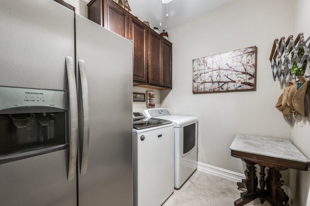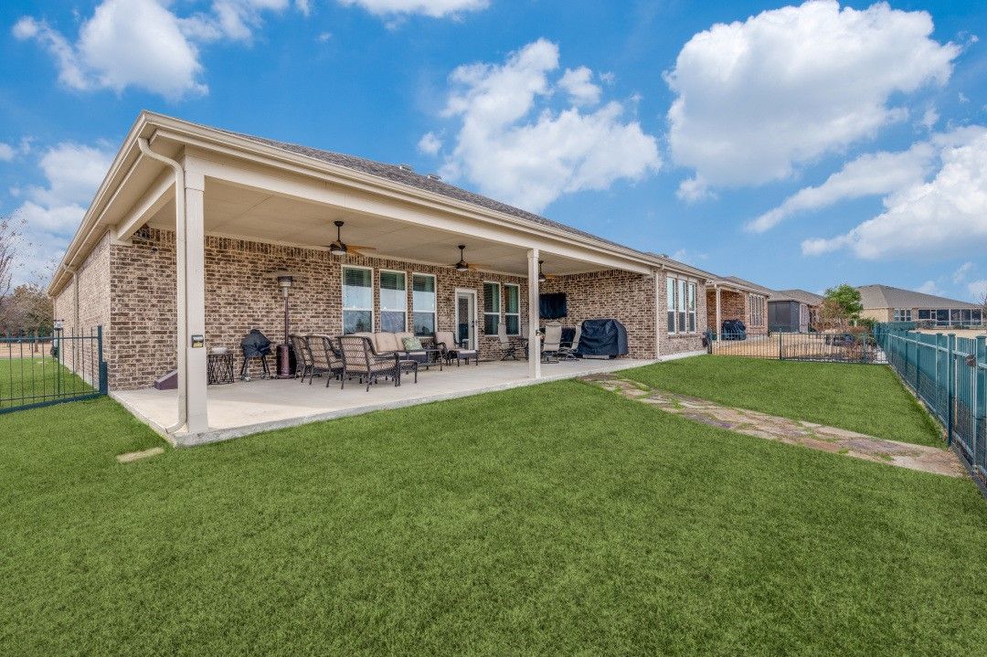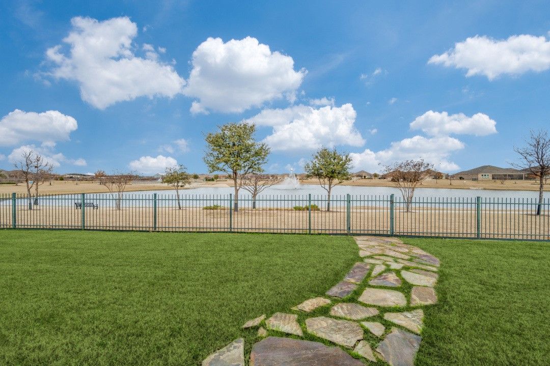Welcome to exceptional lakefront living in the highly sought-after 55+ community of Frisco Lakes by Del Webb. This beautifully maintained 2018 single-story home offers 2,595 sq ft of thoughtfully designed living space on a premium waterfront lot with breathtaking backyard views. Step inside to an open-concept floorplan featuring rich engineered wood flooring, granite countertops, decorative lighting, and abundant natural light. The spacious living area flows seamlessly into a chef’s kitchen complete with a large island, built-in gas appliances, double ovens, walk-in pantry, and generous cabinet space, perfect for entertaining or everyday comfort. Designed with flexibility in mind, this home features two bedrooms, 2.5 baths, that includes a versatile second primary-in-law suite layout ideal for guests. The oversized primary suite includes dual sinks, separate shower, and large walk-in closet. The utility room includes an added water line for a second refrigerator—an excellent bonus for additional storage and entertaining needs. The true showstopper is the extended covered patio overlooking the tranquil lake. Enjoy peaceful mornings and evenings with unobstructed water views behind wrought iron fencing—your own private retreat. Located in an amenity-rich golf community offering clubhouse, fitness center, pools, pickleball, tennis, walking trails, and more. This is the waterfront lifestyle opportunity buyers wait for.