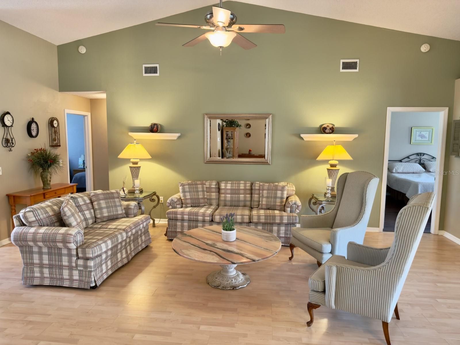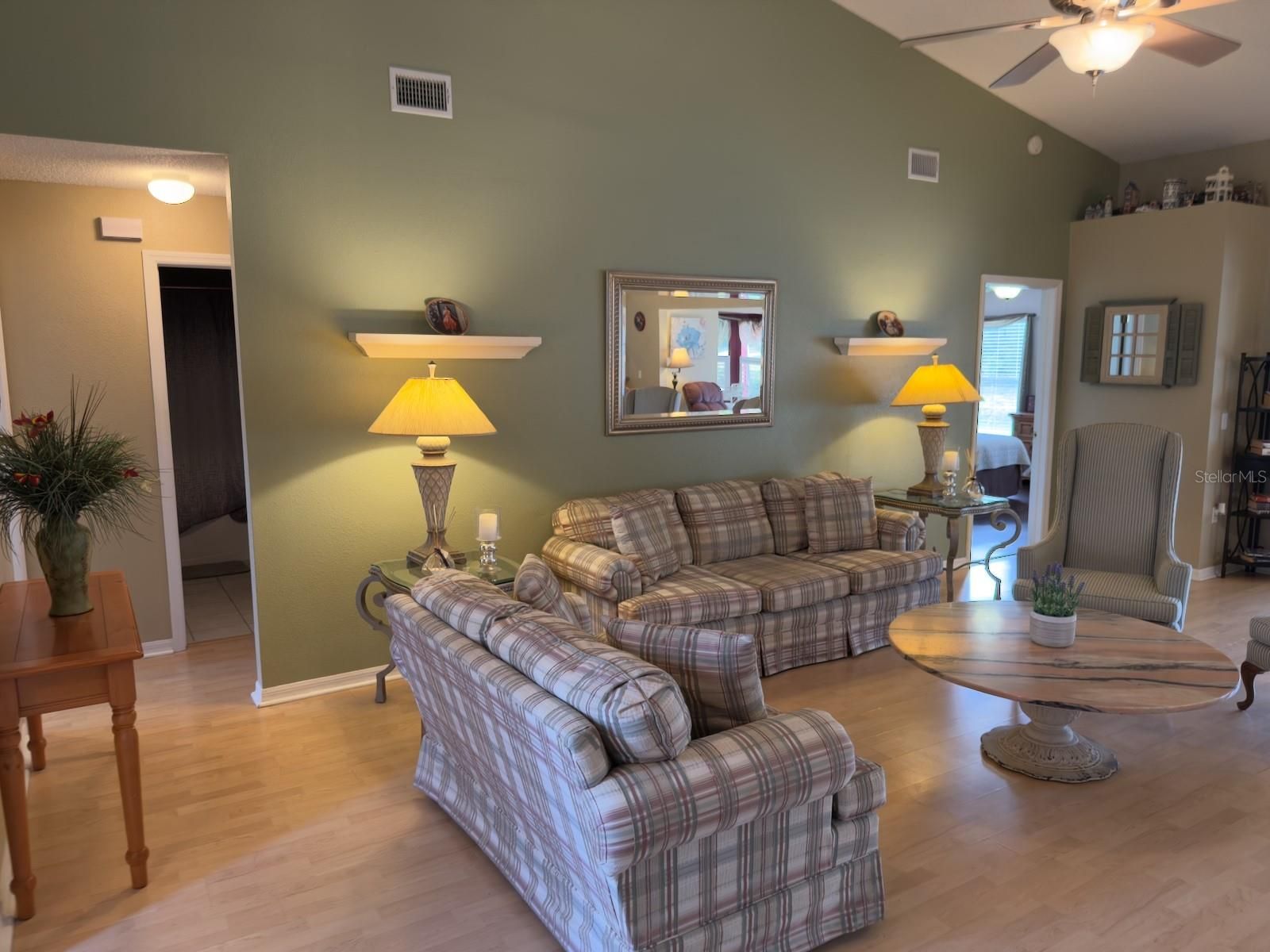 - Cathedral Ceiling(s), Ceiling Fan(s), Eat-in Kitchen, Living/Dining Room, Open Floorplan, Split Bedrooms, Stone Counters, Walk-In Closet(s)