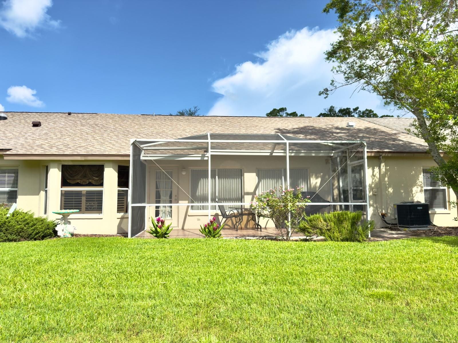 Welcome to your new turnkey villa in the highly sought-after Heritage Pines 55+ Golf Community. This beautifully maintained 2-bedroom, 2-bathroom villa offers a spacious and open split-bedroom floor plan with soaring ceilings that create a spacious feel. The open-concept layout seamlessly connects the family room, living room, and dining area—perfect for both everyday living and entertaining guests. The remodeled kitchen features granite countertops, updated cabinetry, a closet pantry, a breakfast bar, and a cozy dinette area. The primary suite boasts LVP flooring, dual walk-in closets, and a private en-suite bathroom complete with a walk-in shower, large vanity, and built-in makeup desk. The guest bedroom offers newer carpeting and its own spacious walk-in closet. Enjoy the convenience of an indoor laundry room, complete with built-in cabinets, a utility sink, and a washer and dryer included. Step outside to a screened-in patio overlooking a peaceful greenbelt—offering privacy and no rear neighbors. Major updates provide peace of mind, including a brand-new roof (June 2025), new HVAC system (2023), and water heater (2019). The exterior was just freshly painted too. The foundation was professionally remediated and reinforced in 2024 and comes with a transferable lifetime warranty—fully insurable. Offered mostly furnished included (with the option to clear out upon request). Heritage Pines is a gated, amenity-rich community featuring a private 18-hole championship golf course, a heated pool and spa, clubhouse, fitness center, restaurant and bar, and courts for tennis, pickleball, bocce, and much more. HOA fees cover cable, internet, lawn care, irrigation, and exterior painting—making for a low-maintenance lifestyle. Be sure to check out the 3D virtual tour and schedule your private showing today.