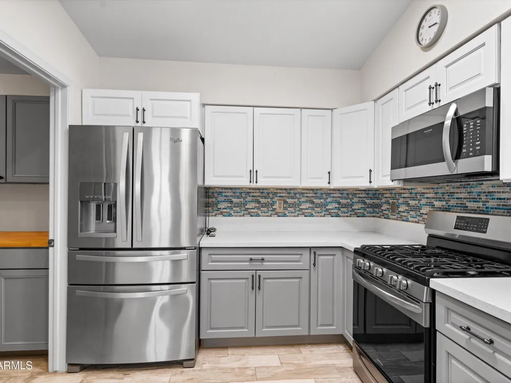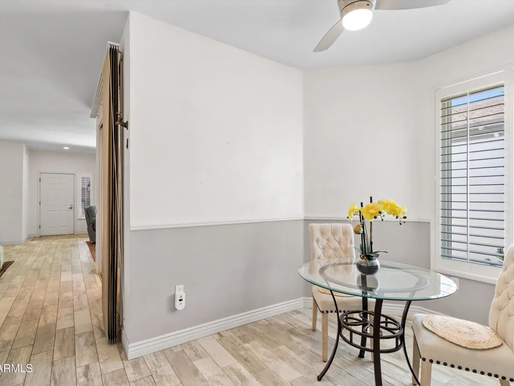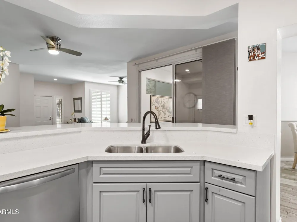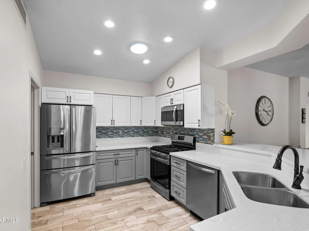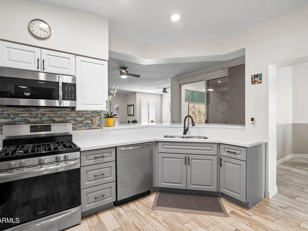 Stunning owner-remodel in Sun City West 55+ community—quality upgrades, not a flip! Gorgeous 6''x24'' plank tile floors flow throughout, complemented by quartz counters, new appliances, and a freshly remodeled bath. Natural light fills the spacious layout, enhanced by recessed lighting and a versatile den (~100 sq. ft.) created from an enclosed patio. Entertain or relax outdoors on the expansive covered patio, useful and roomy 2-car garage with ample storage cabinets throughout. Pride of ownership shines inside and out, with some furnishings available outside escrow. Ideally located near shopping, dining, and everyday essentials—this home truly lives like a model!