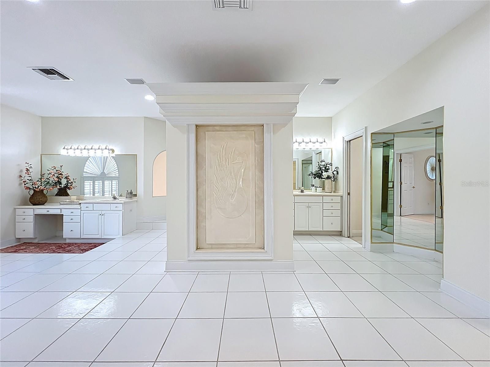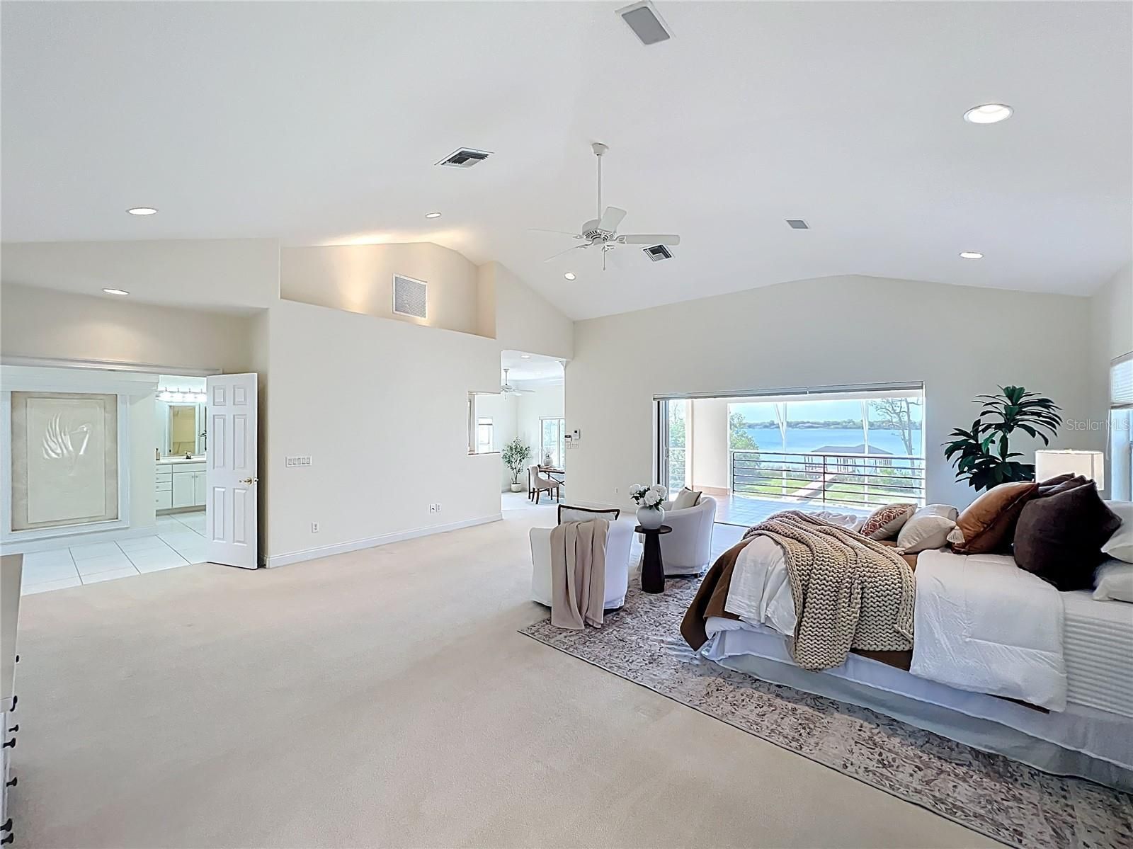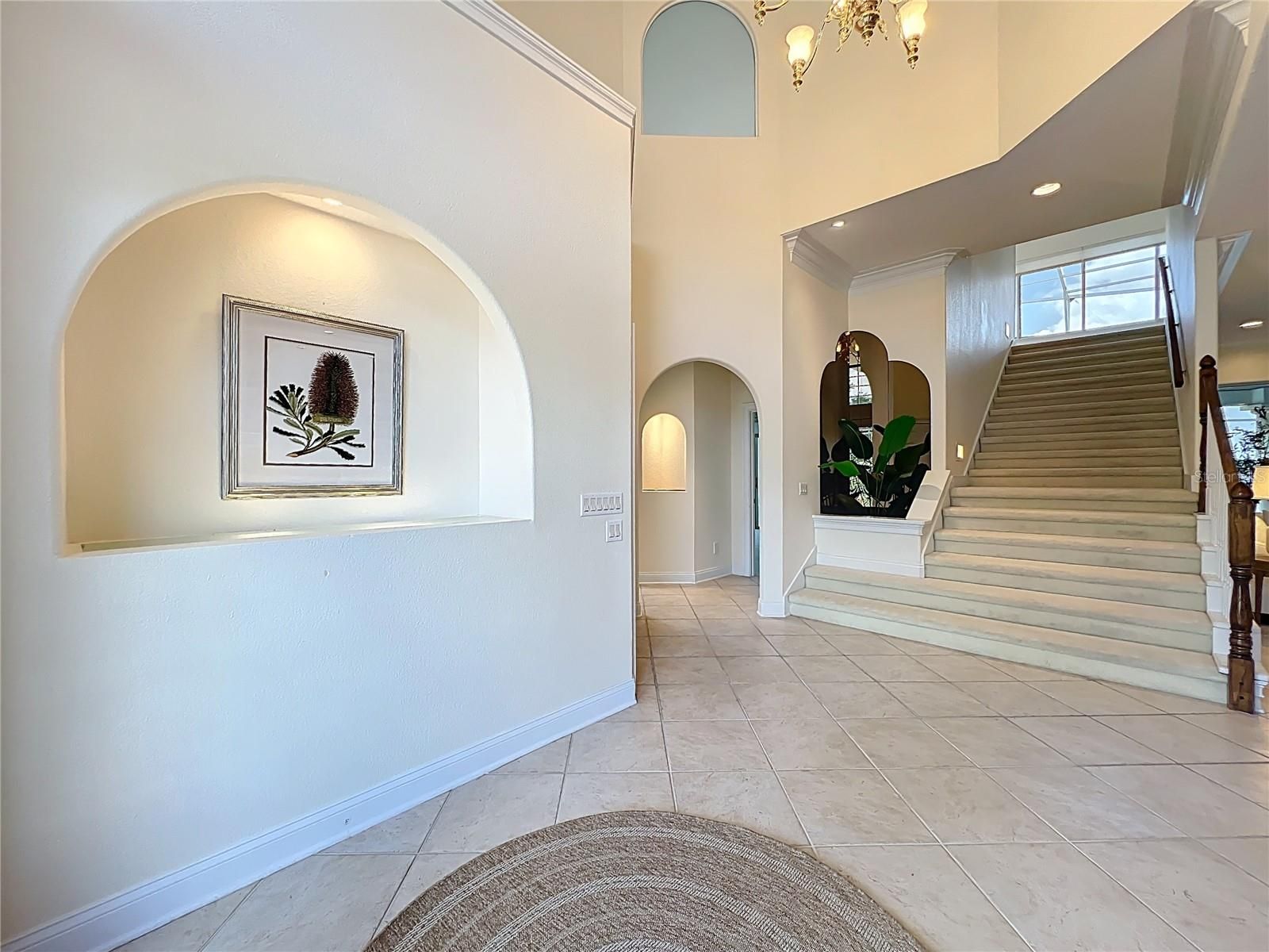 - Built-in Features, Cathedral Ceiling(s), Ceiling Fan(s), Crown Molding, Eat-in Kitchen, High Ceilings, Kitchen/Family Room Combo, Upper Level Primary, Solid Surface Counters, Split Bedrooms, Thermostat, Walk-In Closet(s), Wet Bar, Window Treatments