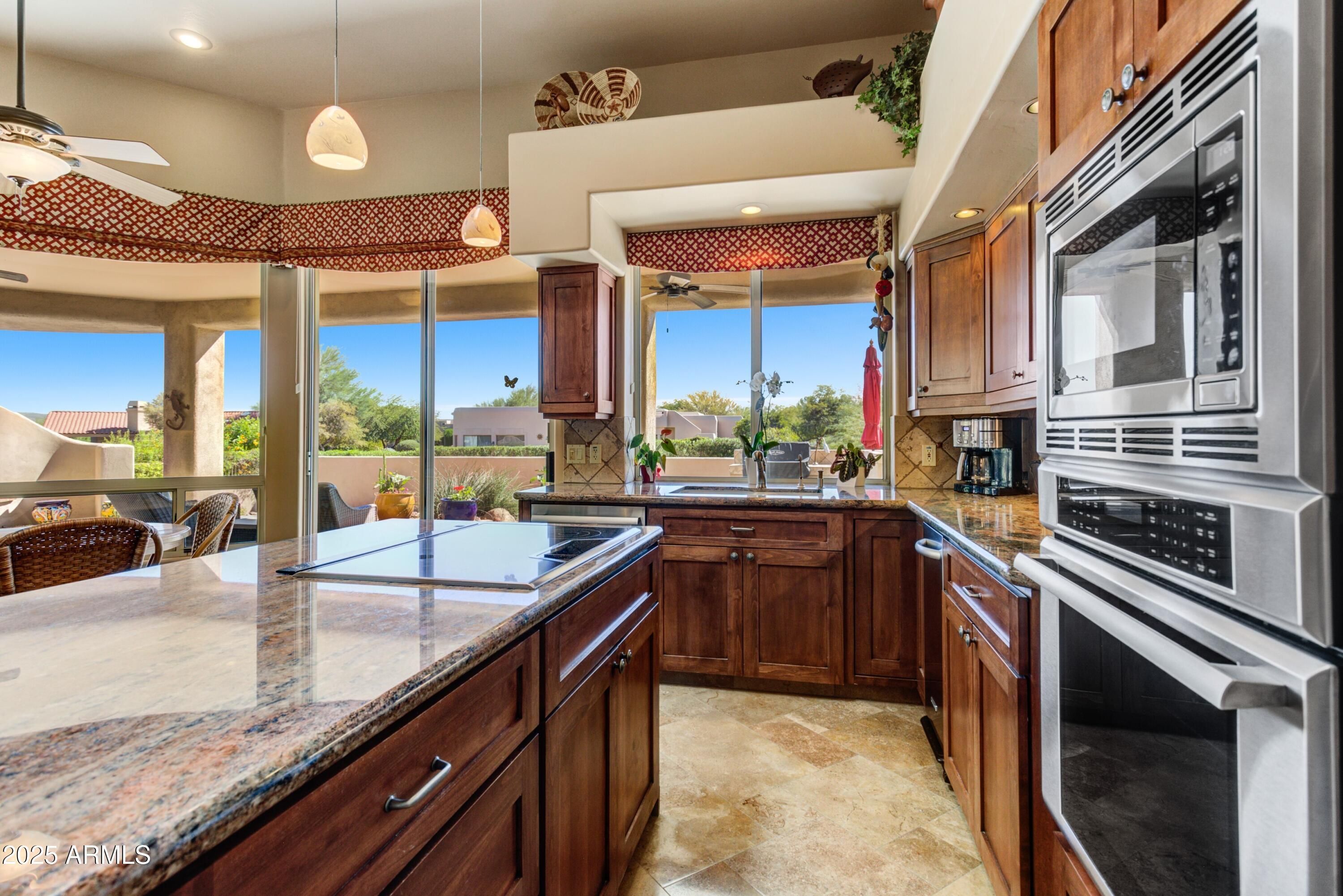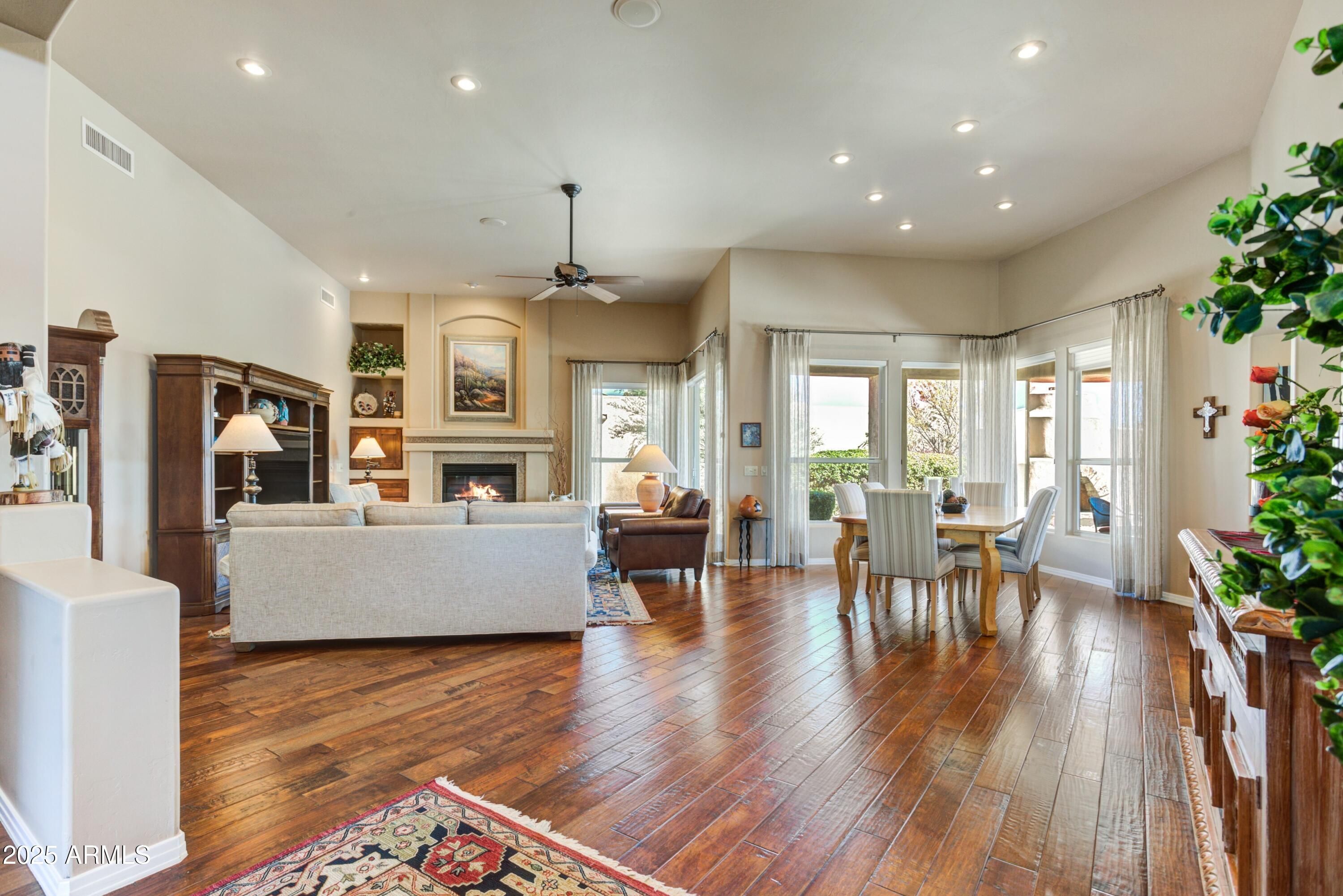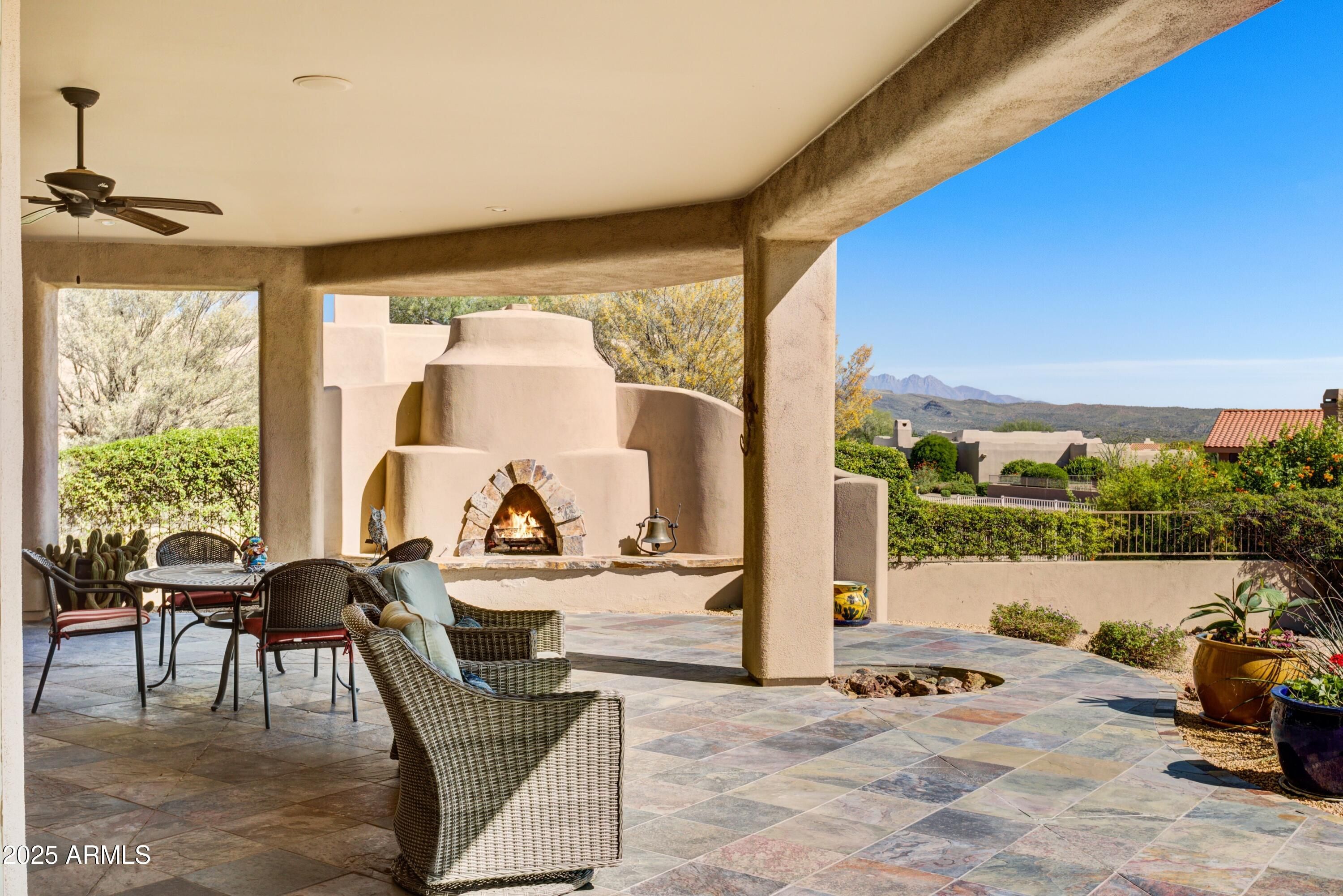 Inviting and well-maintained south facing home in the Active Adult Golf Community of Tonto Verde. This floorplan feature 3 bedrooms and 2 baths, office space, hardwood floors, travertine and tile. Great room with propane fireplace, formal dining near kitchen with a buffet divider. Kitchen with casual dining, patio access, Thermador appliances, granite counters and center island. Alder cabinets with ample storage, pantry and wine cooler. Spacious covered patio for entertaining, fireplace, built in bbq. Views of Four Peaks from the patio. Backyard has plenty of space to add a pool or spa. 2 car garage with golf cart and storage. Furniture available! Come and see this gem.