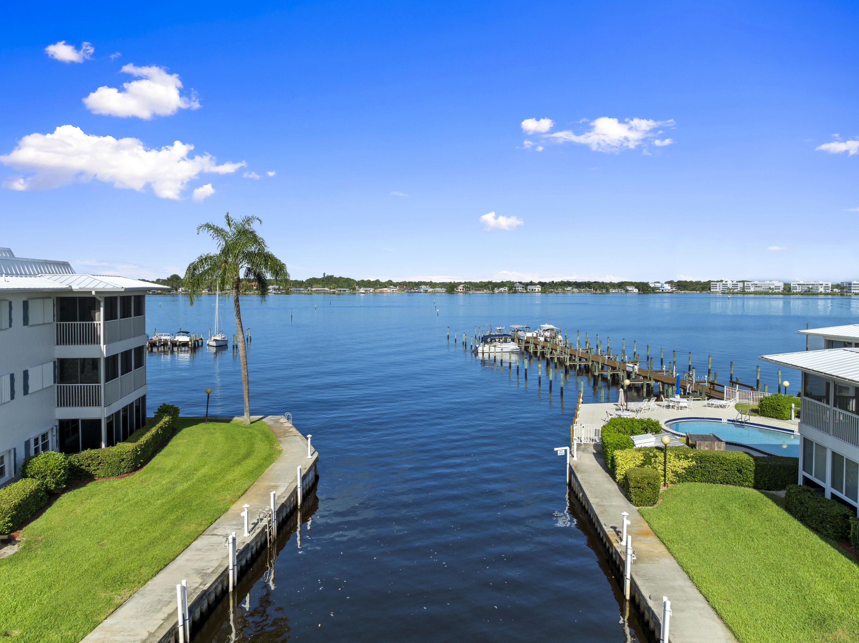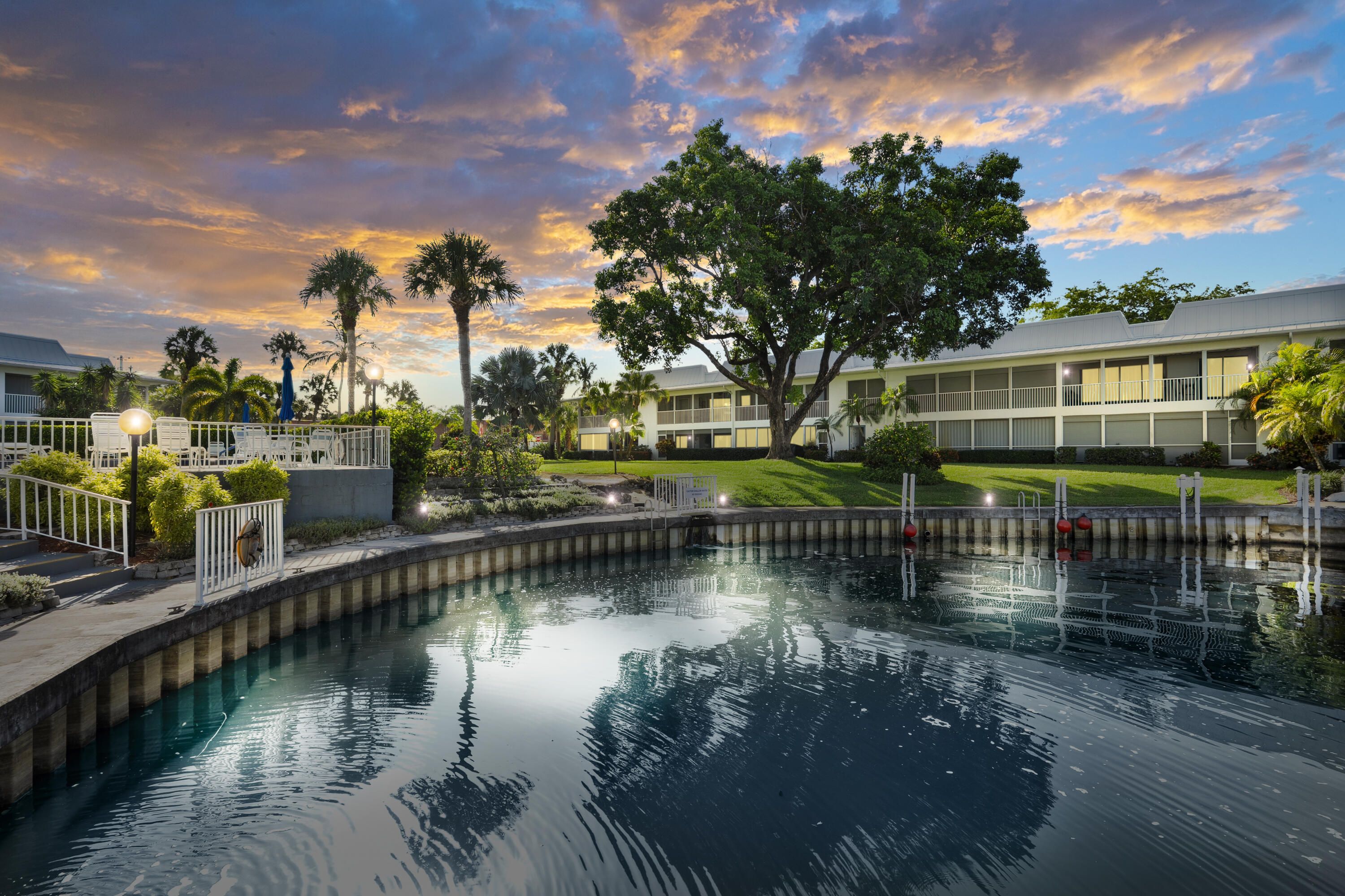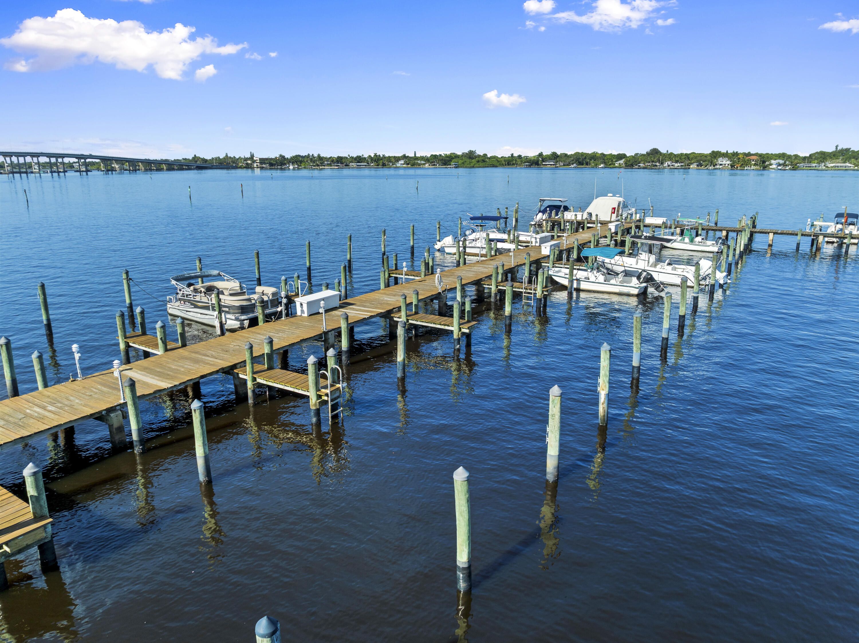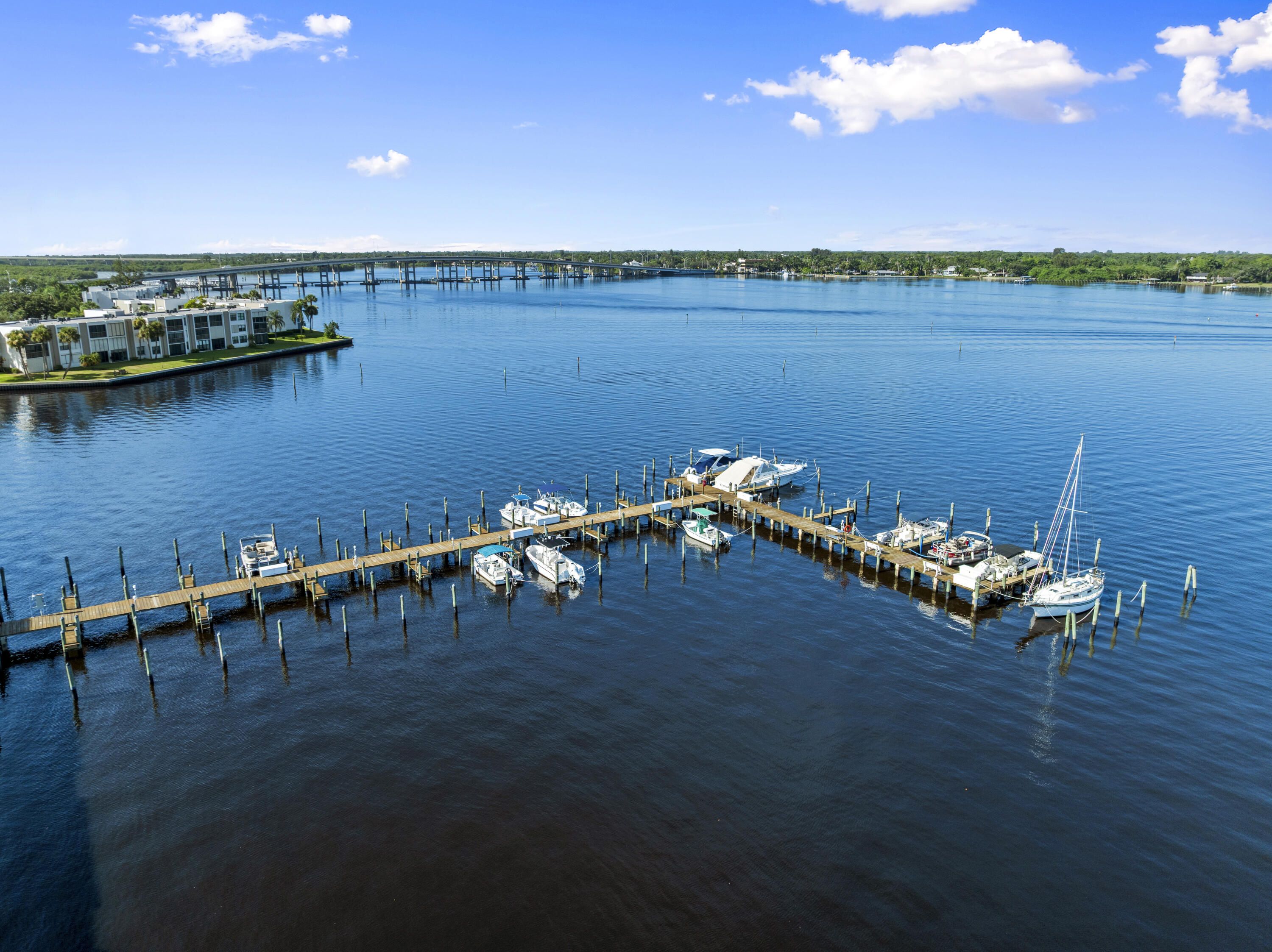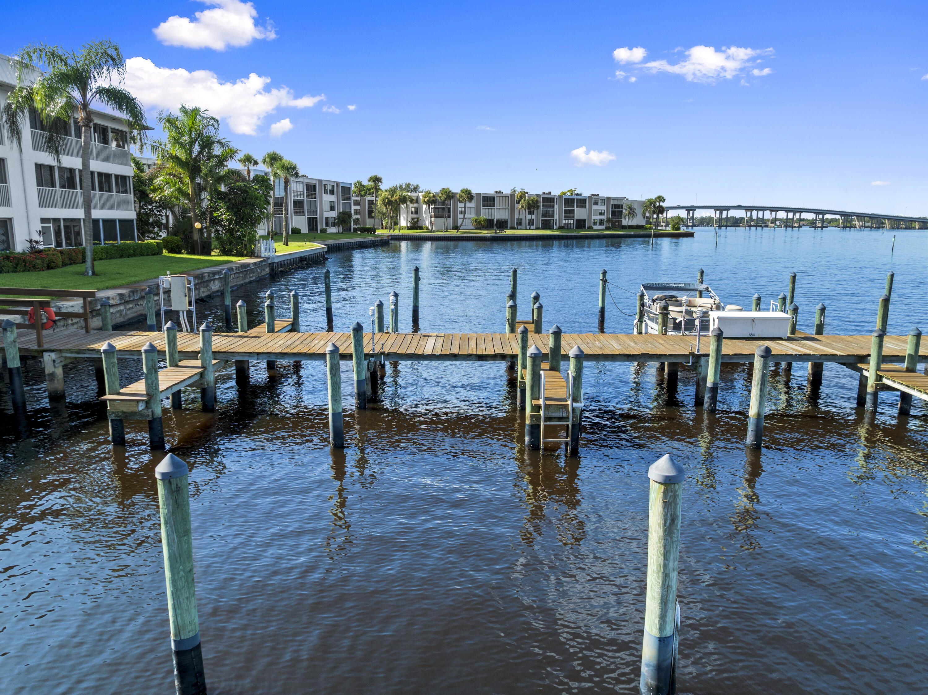 Waterfront 2Bed 2Bath corner condo in Windjammer with 30' Boat Dock (Slip #119). Windjammer offers Community Marina, Clubhouse & 3 Heated Swimming Pools. Kitchen features 30'' White cabinets with Corian counters with waterfall edge, spacious breakfast bar. Updated insulated windows with accordion hurricane shutters. Master bedroom has sliding glass doors to screen porch & large walk-in closet. Master bath features dual sinks & tub/shower combination. Large guest bedroom has 2 closets. 2nd bath has separate shower with glass doors. Large screen patio with tile floors, storage closet & roll down shutters. Additional storage closet in laundry room. Water Heater was replaced in 2008 & A/C is 2004. Windjammer is a 55+ Adult community. Conveniently located near historic downtown Stuart.