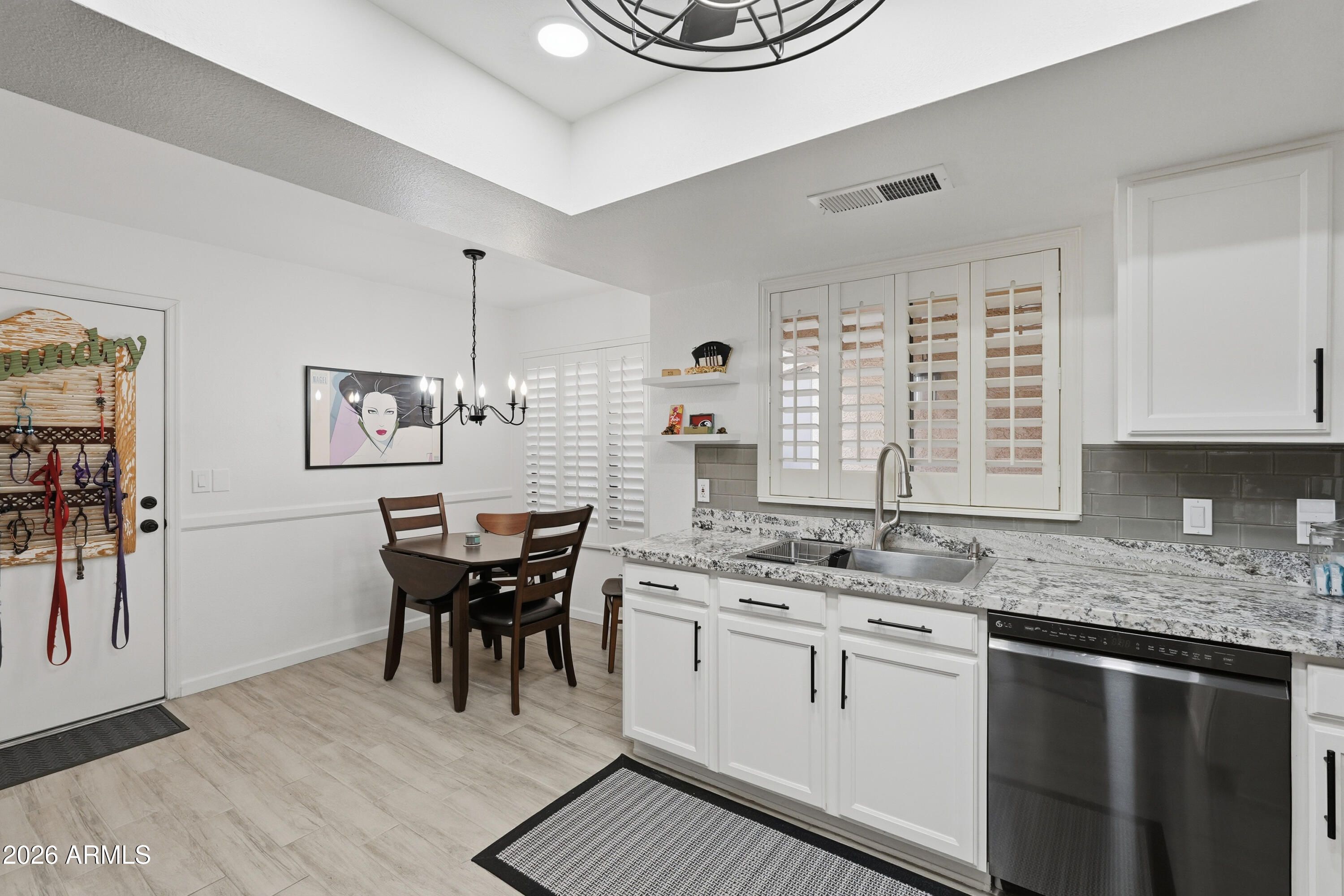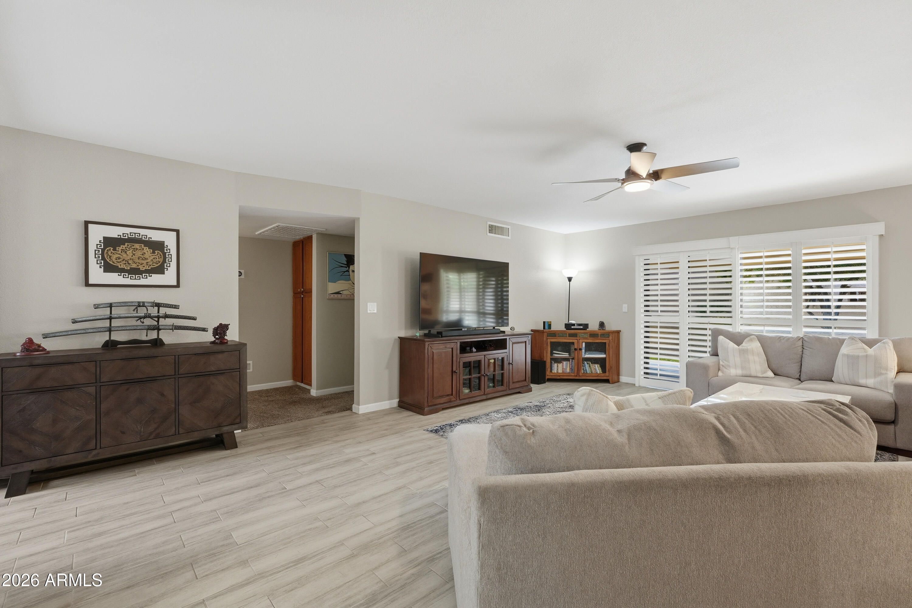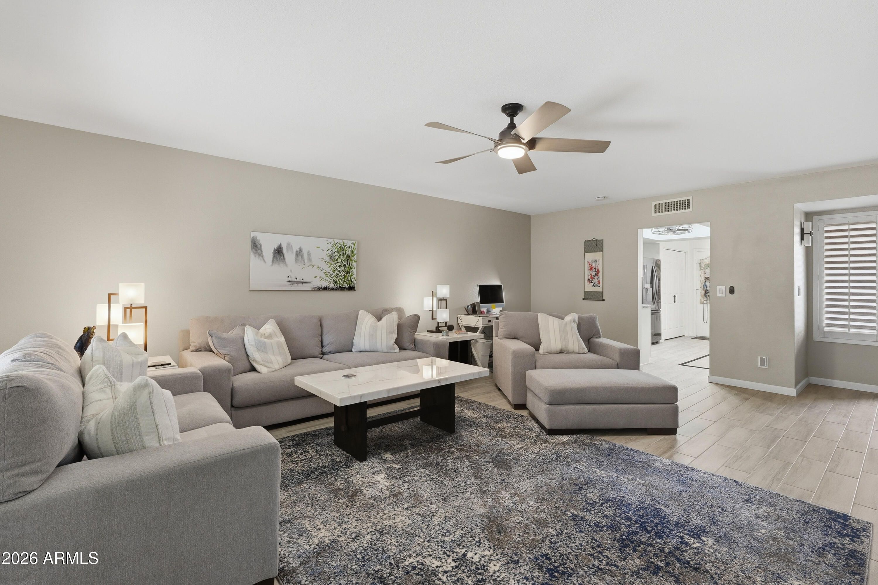 You won't be disappointed when you see this beautiful, recent remodel with pool view that features a spacious kitchen with granite countertops and tile backsplash, matching stainless steel appliances, white cabinets, R/O system, and upgraded kitchen sink. Spacious primary suite features a shiplap accent wall in white and a fully remodeled bathroom complete with granite countertops, tiled walk-in shower, and walk-in closet with a modern barn door. Other upgrades include new HVAC w/Nest thermostat in 2025, plantation shutters throughout, custom tile floors, lights, fans, fixtures, baseboards, raised counters, and toilets. There is a covered patio off the large living area along with a smaller patio off the master suite featuring a view of the pool within walking distance. Other features include a newer garage door opener, sunscreens, and garage cabinets. Beautifully maintained community with an abundance of green grass, amenities, and golf. Close to the 101 freeway and lots of shopping at Arrowhead!