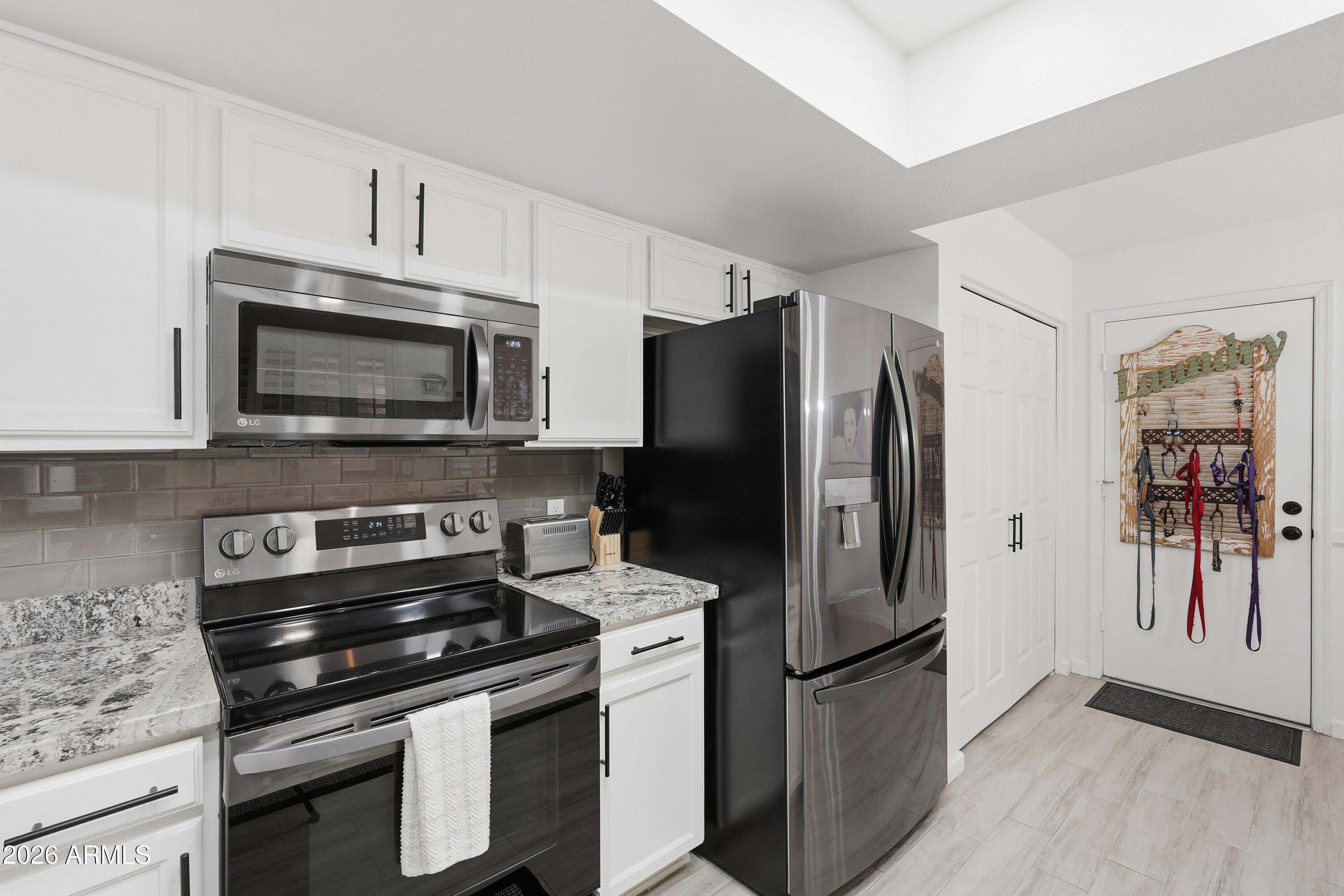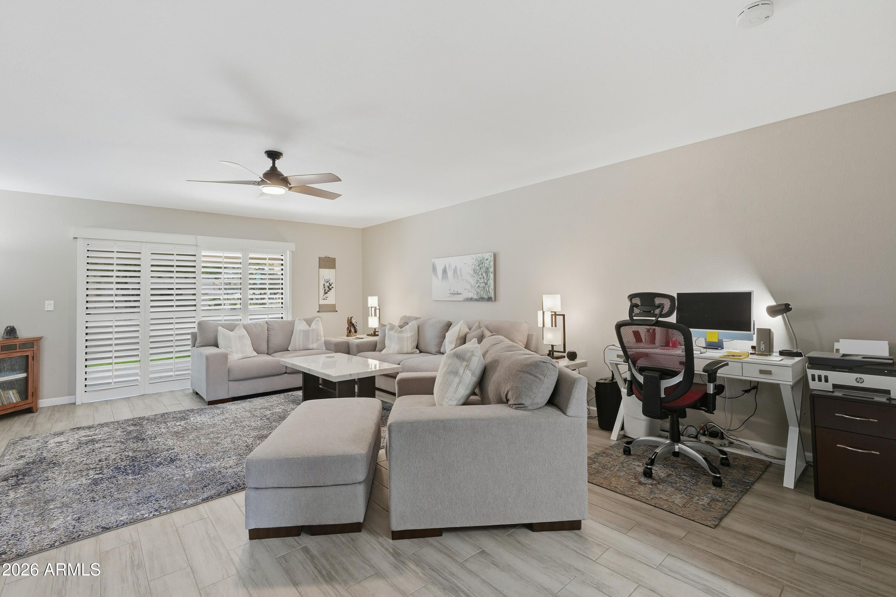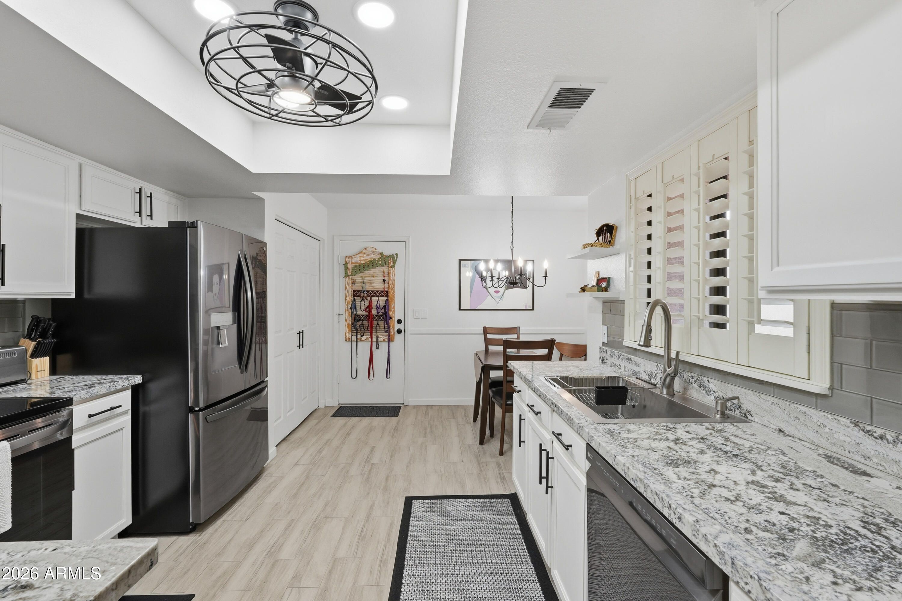 You won't be disappointed when you see this beautiful, recent remodel with pool view that features a spacious kitchen with granite countertops and tile backsplash, matching stainless steel appliances, white cabinets, R/O system, and upgraded kitchen sink. Spacious primary suite features a shiplap accent wall in white and a fully remodeled bathroom complete with granite countertops, tiled walk-in shower, and walk-in closet with a modern barn door. Other upgrades include new HVAC w/Nest thermostat in 2025, plantation shutters throughout, custom tile floors, lights, fans, fixtures, baseboards, raised counters, and toilets. There is a covered patio off the large living area along with a smaller patio off the master suite featuring a view of the pool within walking distance. Other features include a newer garage door opener, sunscreens, and garage cabinets. Beautifully maintained community with an abundance of green grass, amenities, and golf. Close to the 101 freeway and lots of shopping at Arrowhead!
