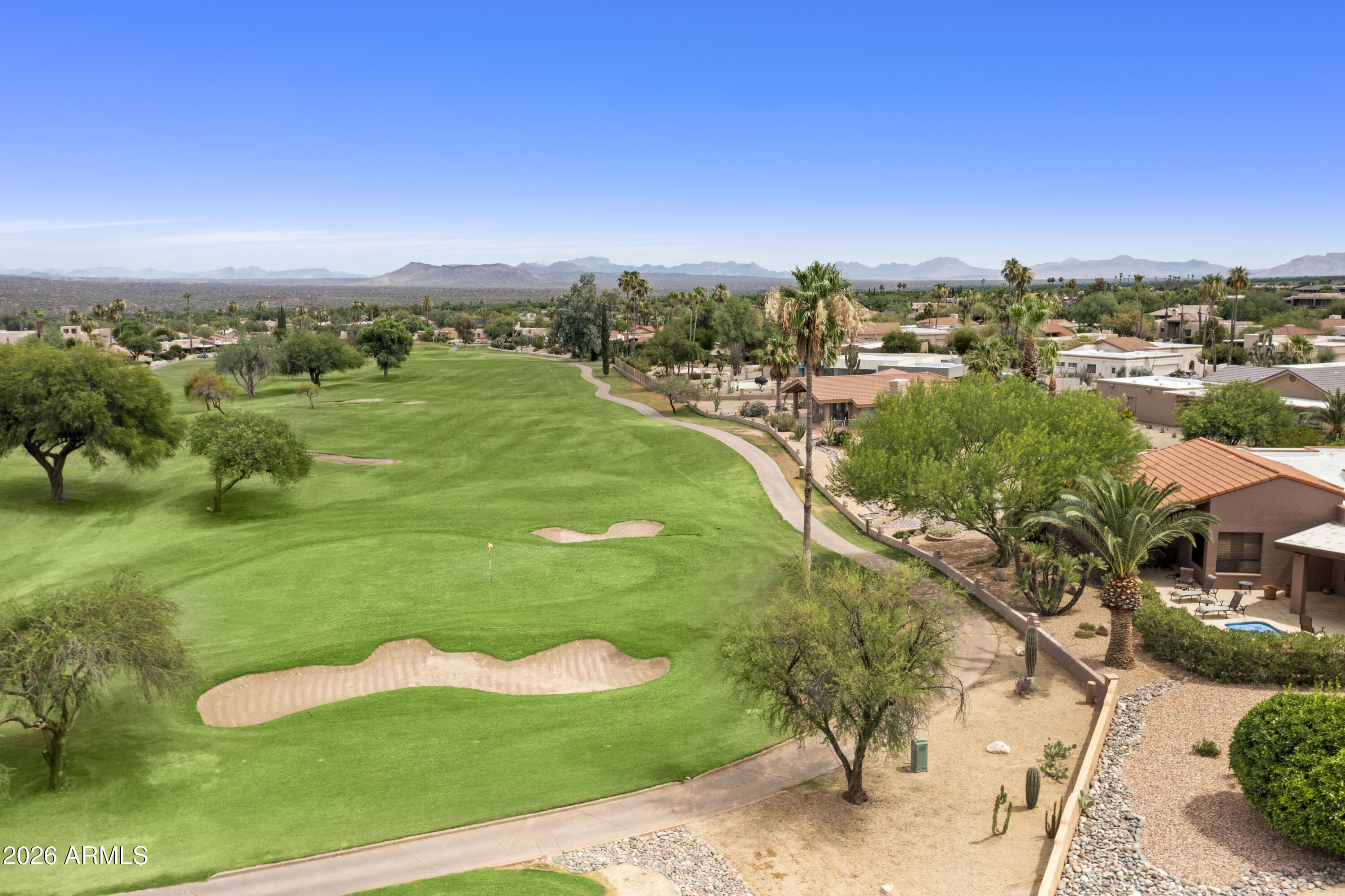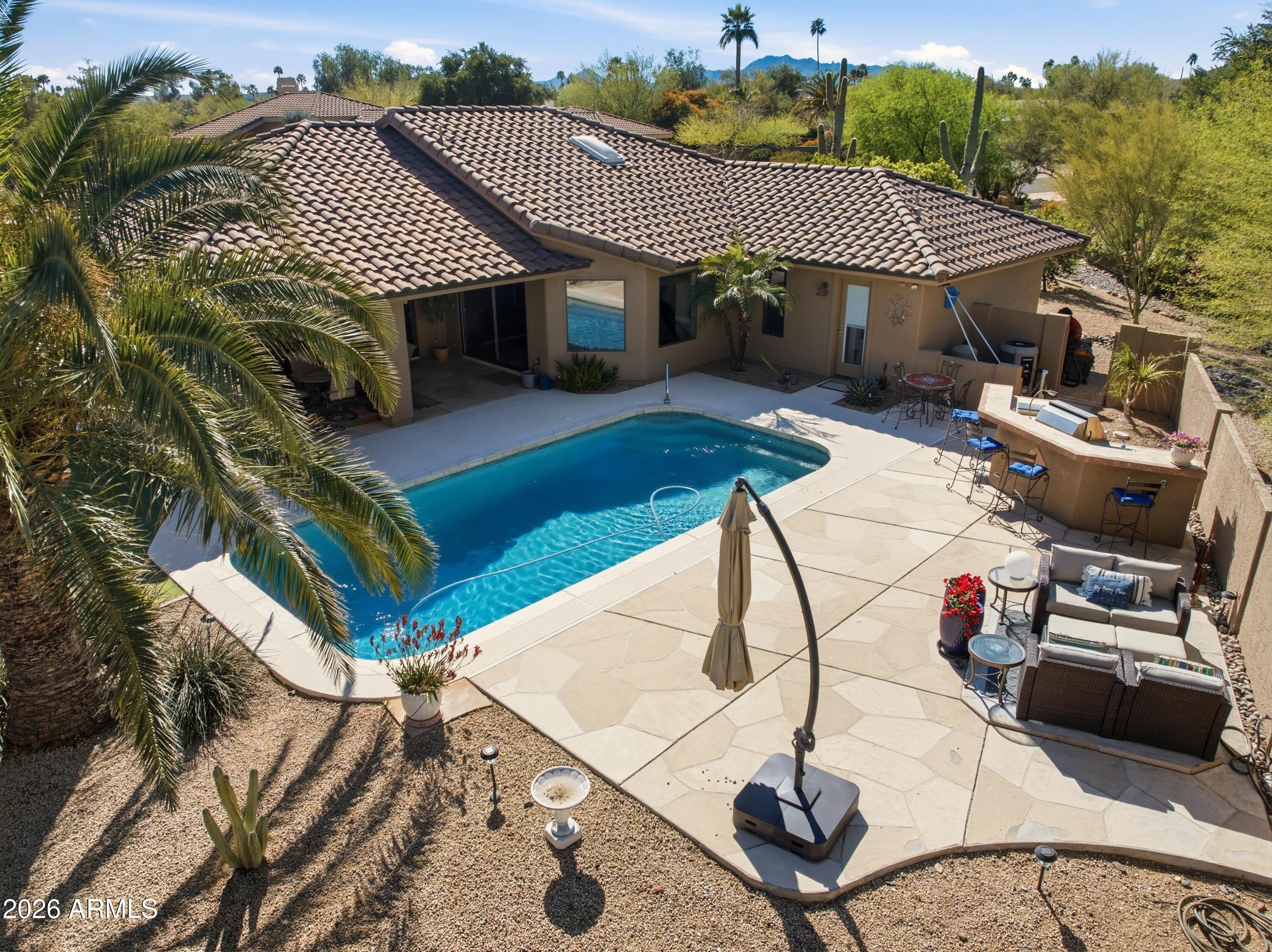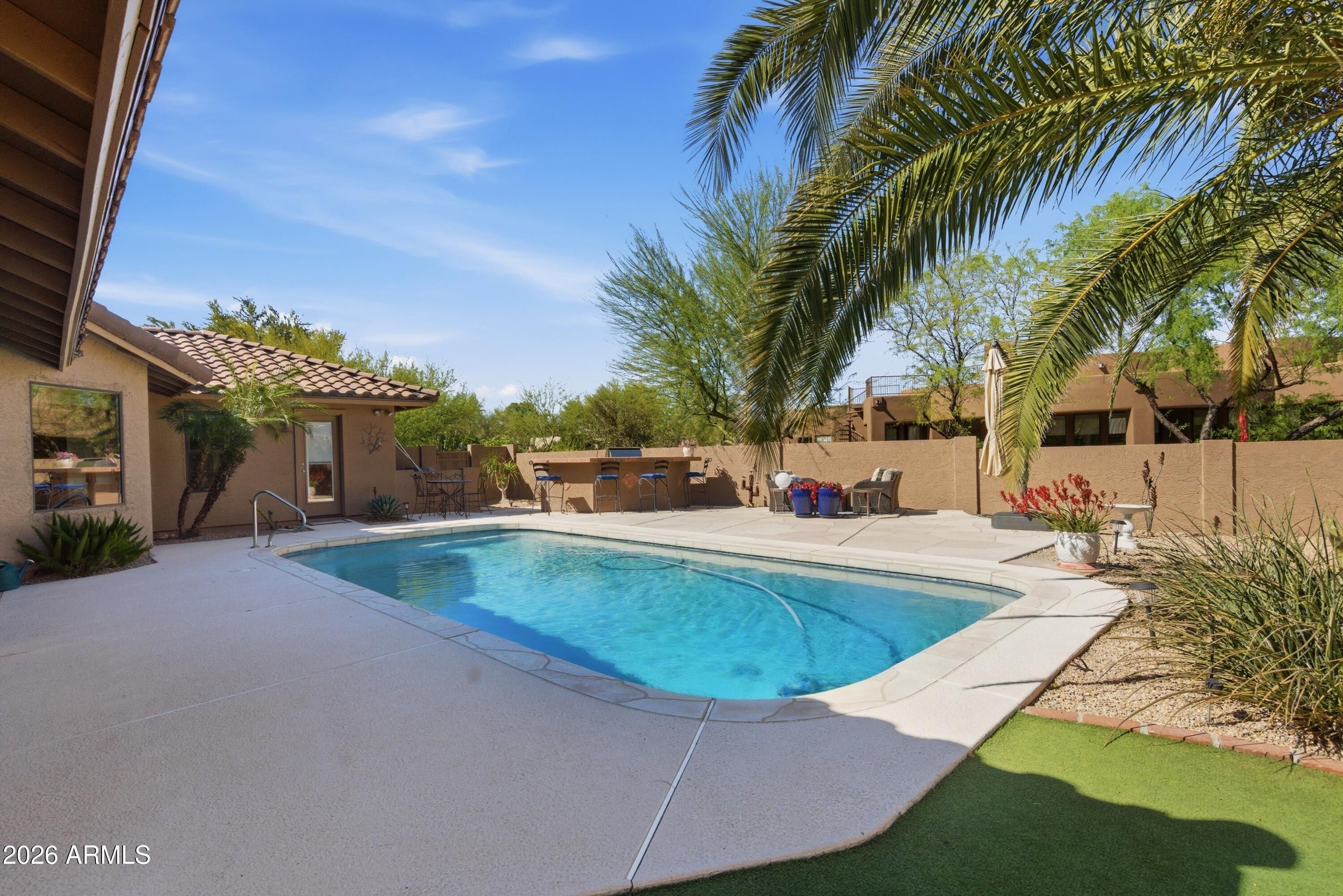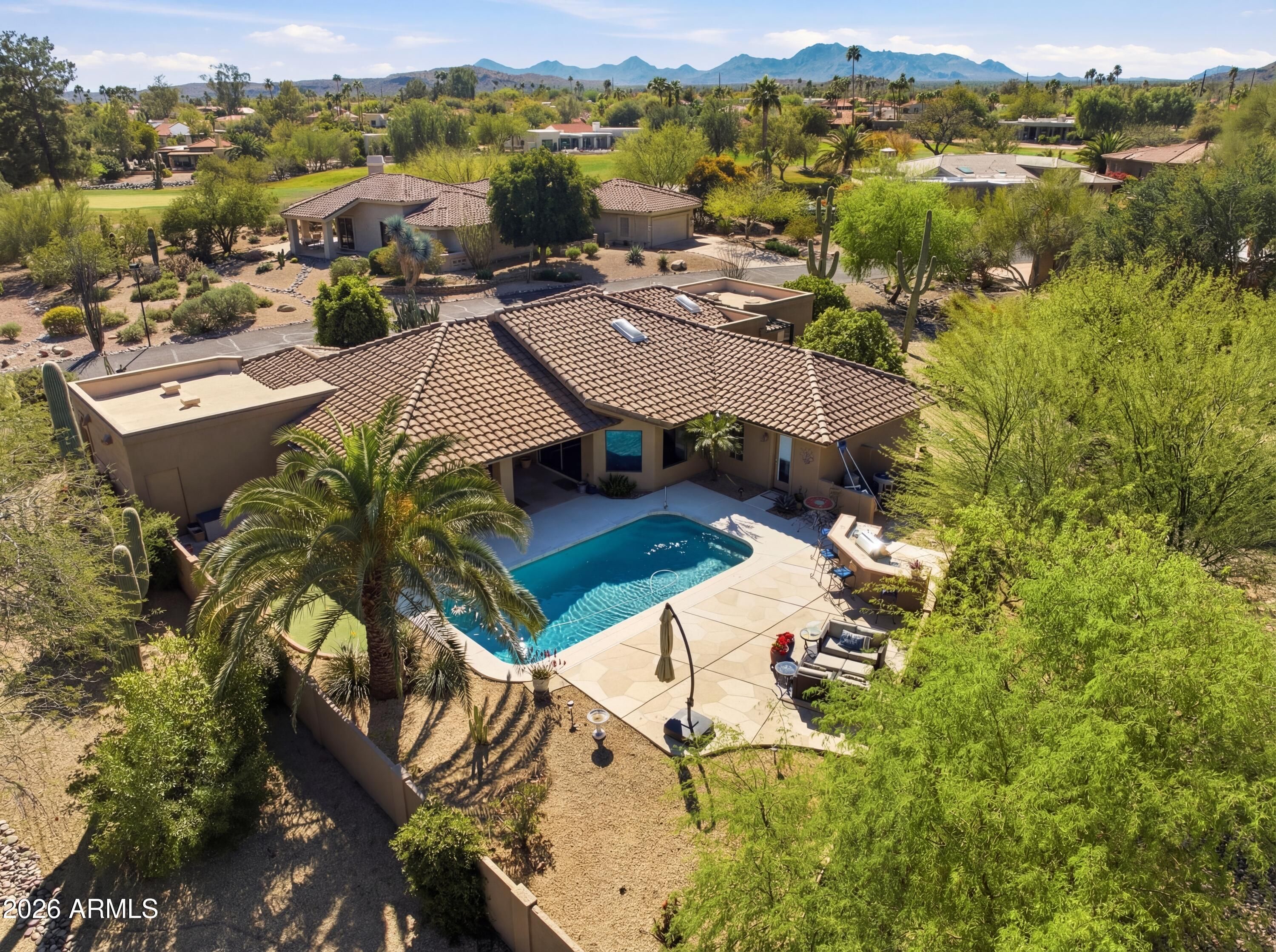 Escape to tranquility in this beautifully crafted single-level custom home in Rio Verde, where natural beauty, privacy, and Arizona lifestyle come together. Tucked on a quiet street with mountain views and serene desert surroundings, this 3-bedroom home plus a large bonus room off the primary suite offers spacious living and effortless comfort. Enjoy your own backyard oasis with a private pool, putting green, outdoor kitchen, and expansive covered patio on a generous 0.4-acre low maintenance lot. Large rooms and a 3++ car garage add everyday convenience. Less than a mile to the clubhouse golf, pickleball, fitness center, dining, and more nearby. Plus the Verde River, Tonto National Forest and McDowell Mountain Regional Park are all 1-2 miles away to add to your exploration and enjoyment.
