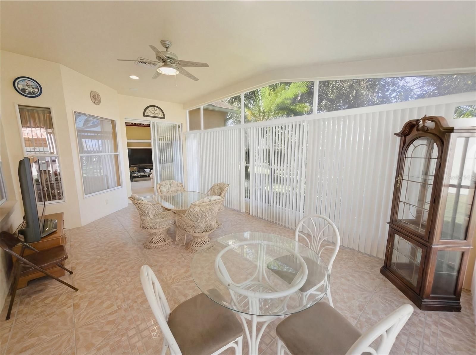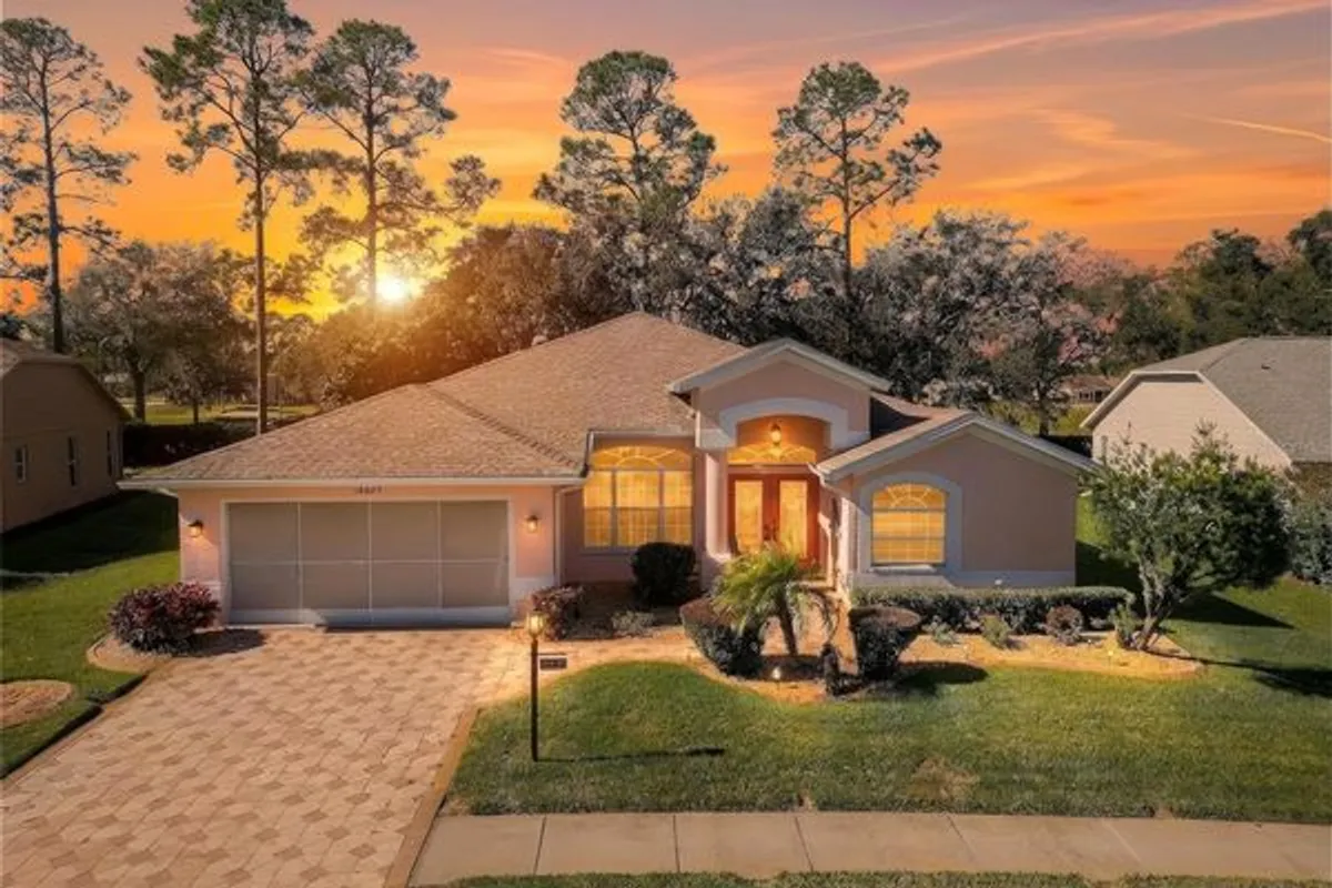 This partially turnkey 3-bedroom, 2-bath home, offered by its original owners, welcomes you with a paver driveway, screened garage door, and a double leaded glass entry doors. Inside, the formal living and dining areas feature wood laminate flooring that continues throughout most of the home. The centrally located kitchen offers ceramic tile, real wood cabinetry with pull-out drawers, granite countertops, stylish backsplash, built-in oven and countertop cooktop, closet pantry, and a kitchen island with breakfast bar overlooking the dinette and family room, all enhanced by solar tube lighting. The split-bedroom layout provides privacy, with a spacious primary suite featuring sliding doors to the lanai, dual California closets, and an updated en suite bath with dual granite vanity with built-in desk, and a remodeled walk-in shower with custom glass doors and grab bars. Two guest bedrooms, both with California closets, share a refreshed guest bath with newer shower tile and glass doors. The enclosed lanai is peaceful with no rear neighbors, removable vinyl windows, and added air ducting, bringing the home’s total heated and cooled space to over 2,200 square feet. Additional highlights include a built-in ceiling speaker system throughout the home and lanai with included audio receiver, a laundry room with cabinetry and washer and dryer, garage storage cabinets, and epoxied garage floors. Most furniture and contents are included at no additional cost, or can be removed if preferred. Major updates include a roof (2020), AC (2015), water heater (2021), and water softener, and the home was professionally remediated in 2012 and is fully insurable. Located in the gated, amenity-rich, and pet-friendly Heritage Pines community, residents enjoy a championship 18-hole golf course, clubhouse with restaurant and bar, fitness center, heated pool and spa, and courts for tennis, pickleball, and bocce, and so much more. HOA fees include cable, internet, lawn care, and irrigation for a truly low-maintenance lifestyle. Schedule your private showing today and seller says please don't mind the cluter as they are in process of moving out.