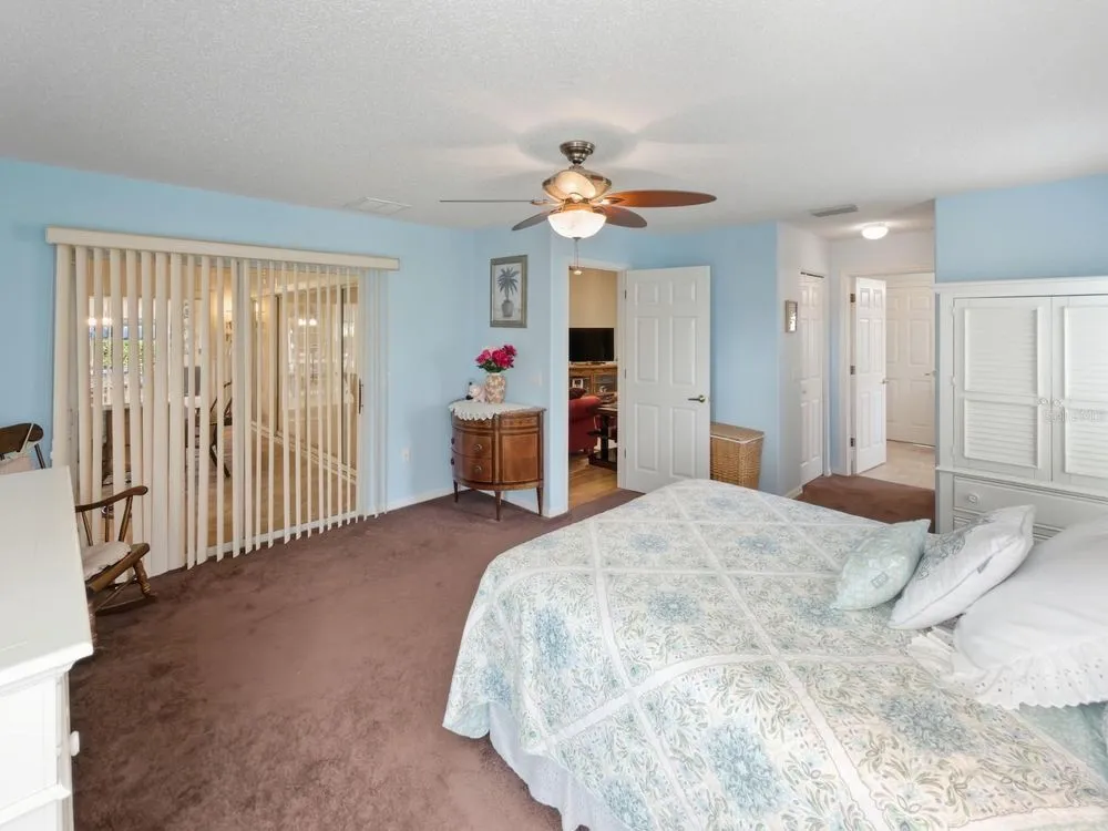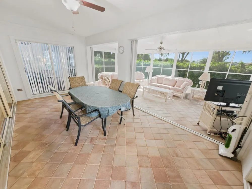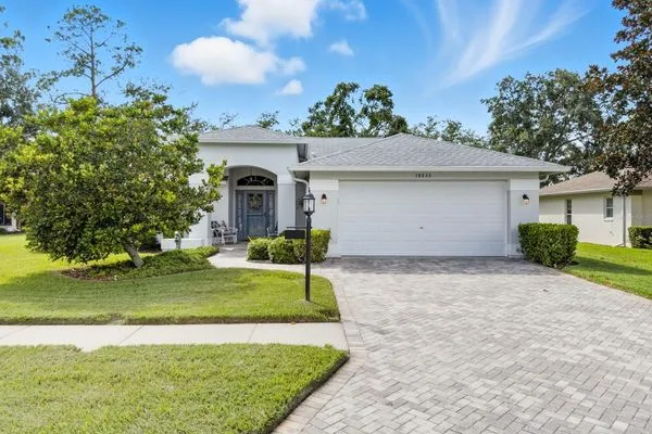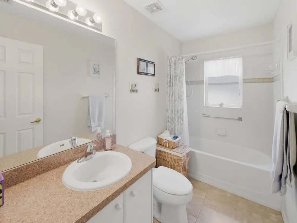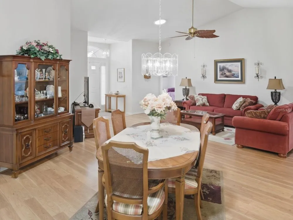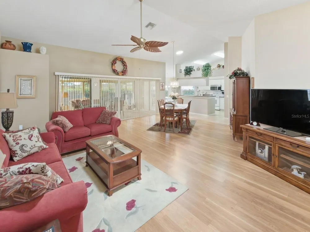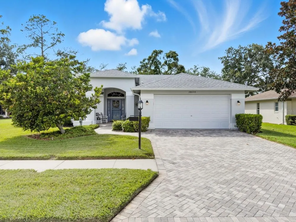 Welcome to this beautifully maintained residence in the highly desirable Heritage Pines 55+ Golf Community. Offered by its original owners, this 3-bedroom, 2-bath home comes optionally turn-key—fully furnished with all contents and even a golf cart included. The paver driveway sets the tone with an inviting curb appeal. Inside, cathedral ceilings enhanced by dual solar tube lighting create a bright and spacious atmosphere. The open living and dining area flows seamlessly into the kitchen, which features a center island with breakfast bar, closet pantry, and a cozy dinette area. The split-bedroom layout has the primary suite at the back of the home, offering dual walk-in closets and direct access to the shared Jack-and-Jill style bath with dual sinks, a walk-in shower with built-in bench, and connects to the front guest bedroom—also boasting a large walk-in closet. A third bedroom and second full bath are located on the opposite side of the home. Additional features include an indoor laundry room with cabinetry, storage closet, and washer and dryer included. Enjoy the extended enclosed lanai with paver flooring, ceiling fans, and tinted removable windows. Major updates include a newer roof (2020), AC (2015), water heater (2022), and completed, fully insurable settlement remediation (2012). Heritage Pines is a gated, amenity-rich, and pet-friendly community, featuring an 18-hole championship golf course, clubhouse with restaurant and bar, fitness center, heated pool and spa, and courts for tennis, pickleball, bocce, and more. HOA fees include cable, internet, lawn care, and irrigation, ensuring a worry-free lifestyle. Don’t miss the chance to call this home yours—explore the 3D virtual tour and schedule your private showing today!