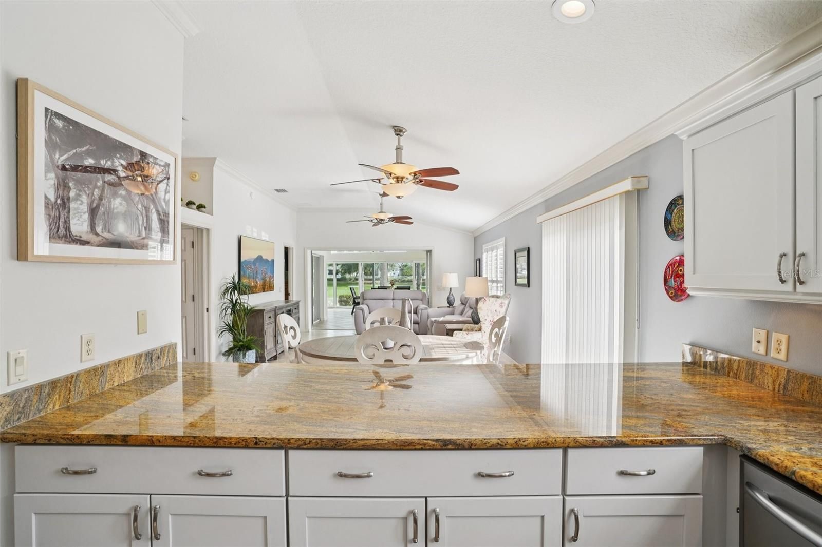 - Built-in Features, Ceiling Fan(s), High Ceilings, Living/Dining Room, Main Level Primary, Stone Counters, Walk-In Closet(s), Window Treatments