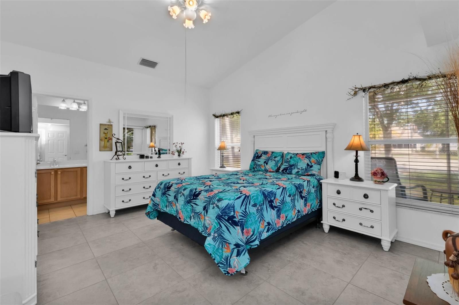 - Cathedral Ceiling(s), Ceiling Fan(s), Eat-in Kitchen, High Ceilings, Open Floorplan, Main Level Primary, Walk-In Closet(s), Window Treatments