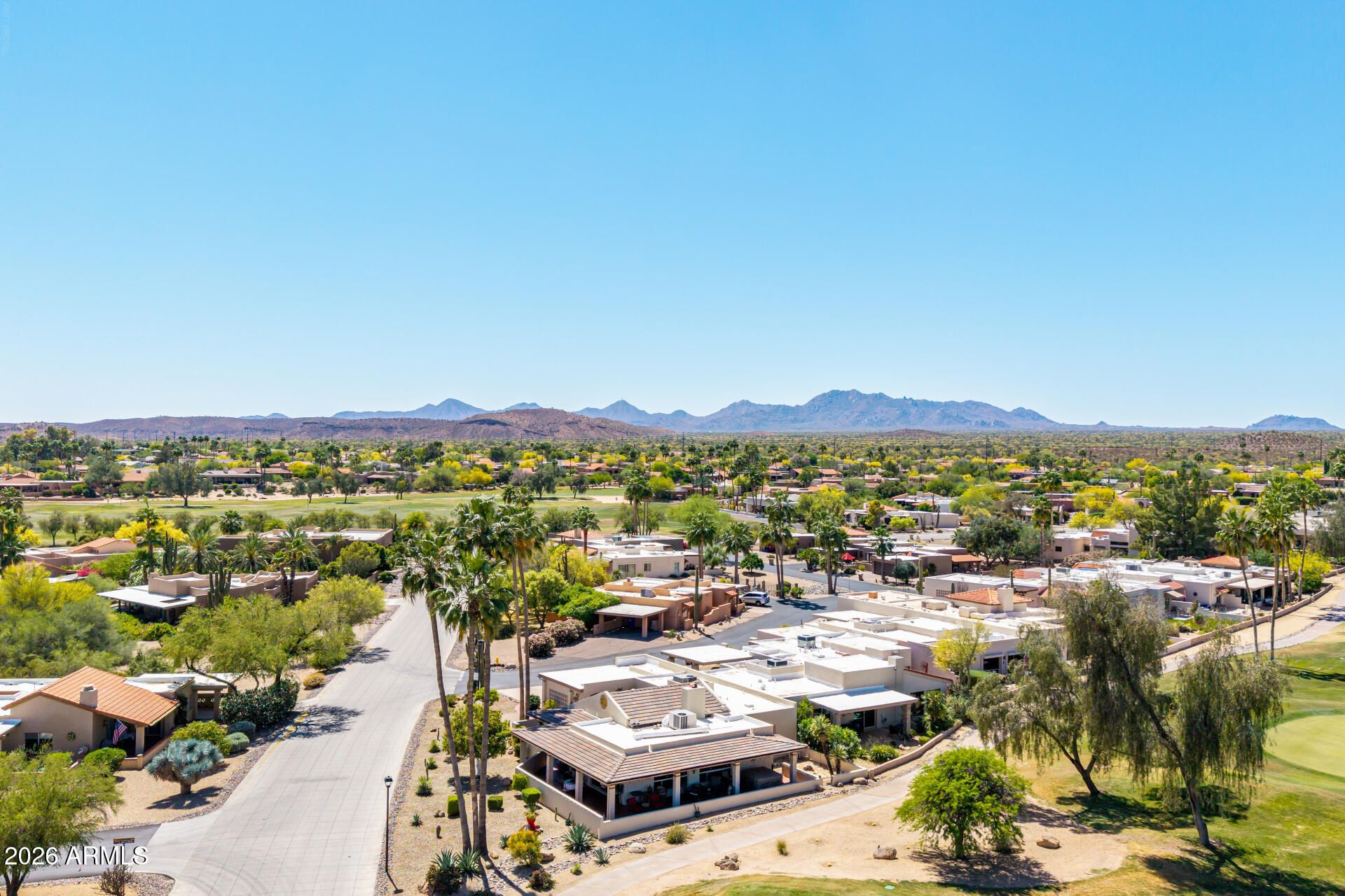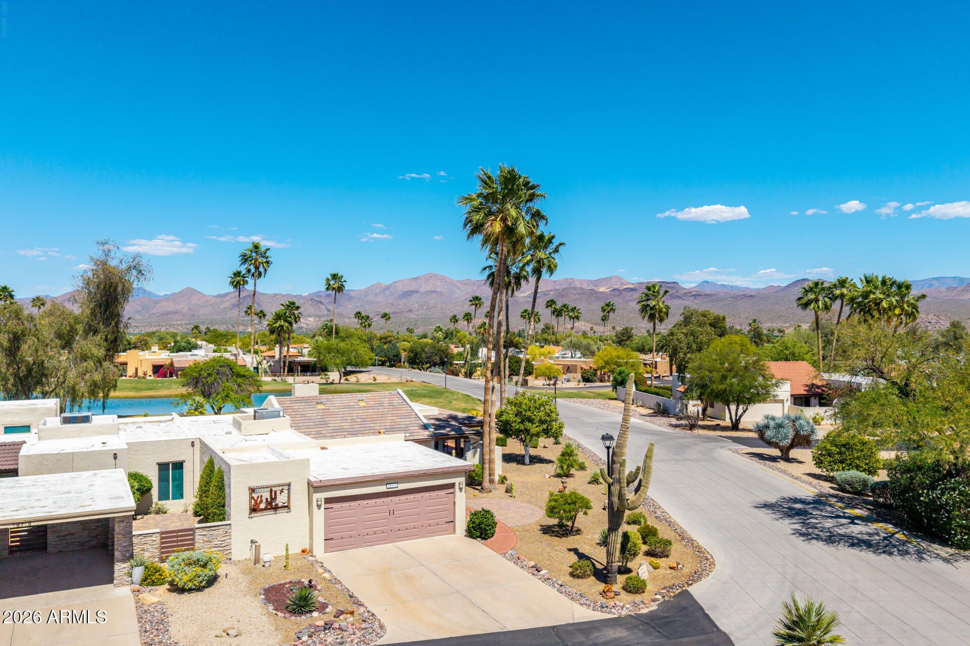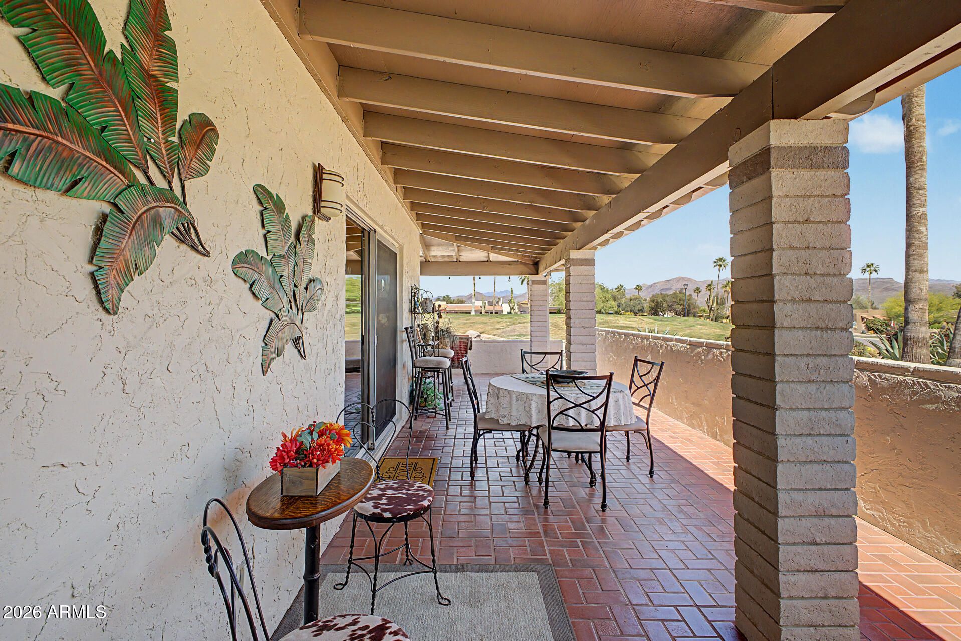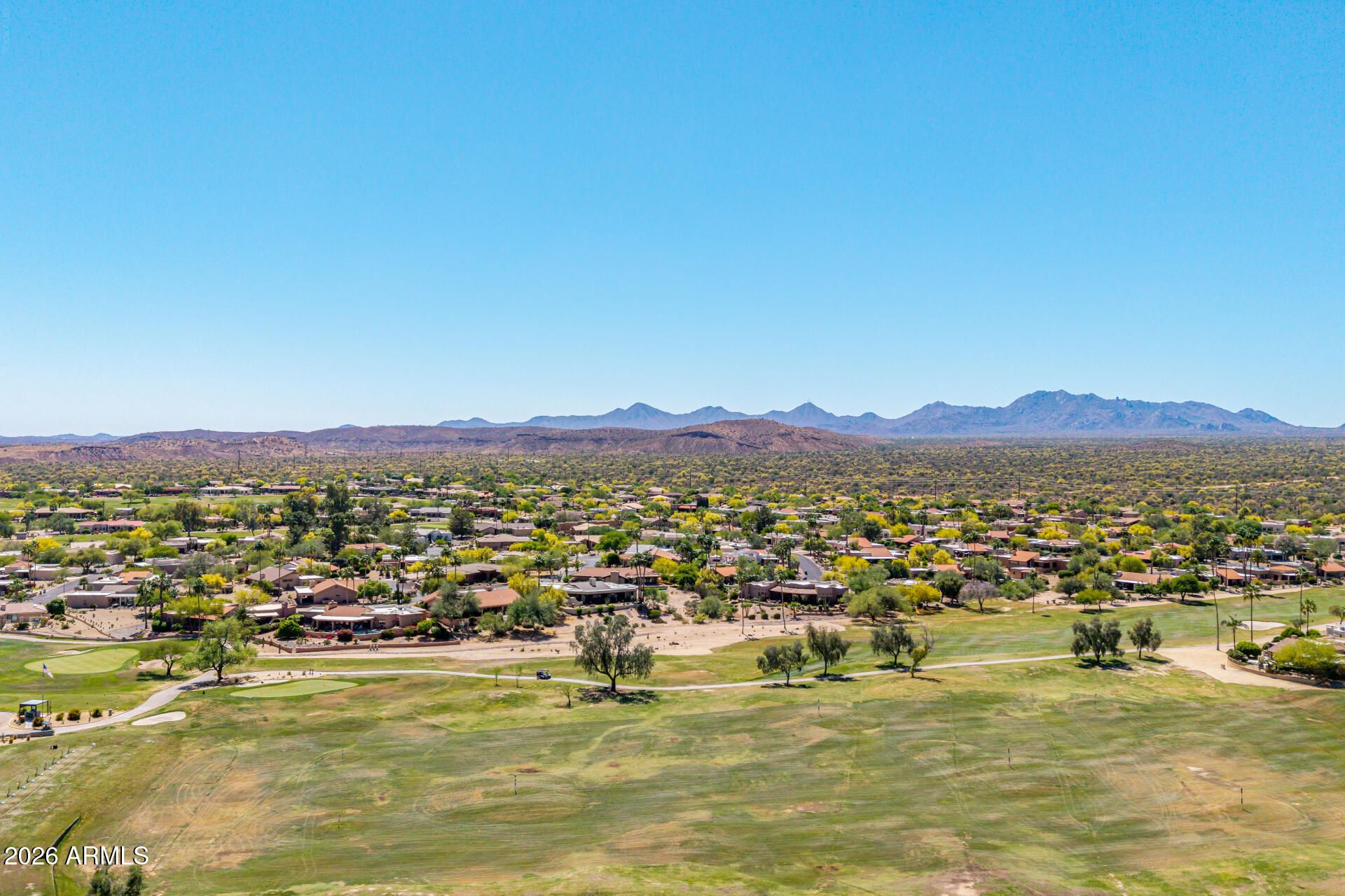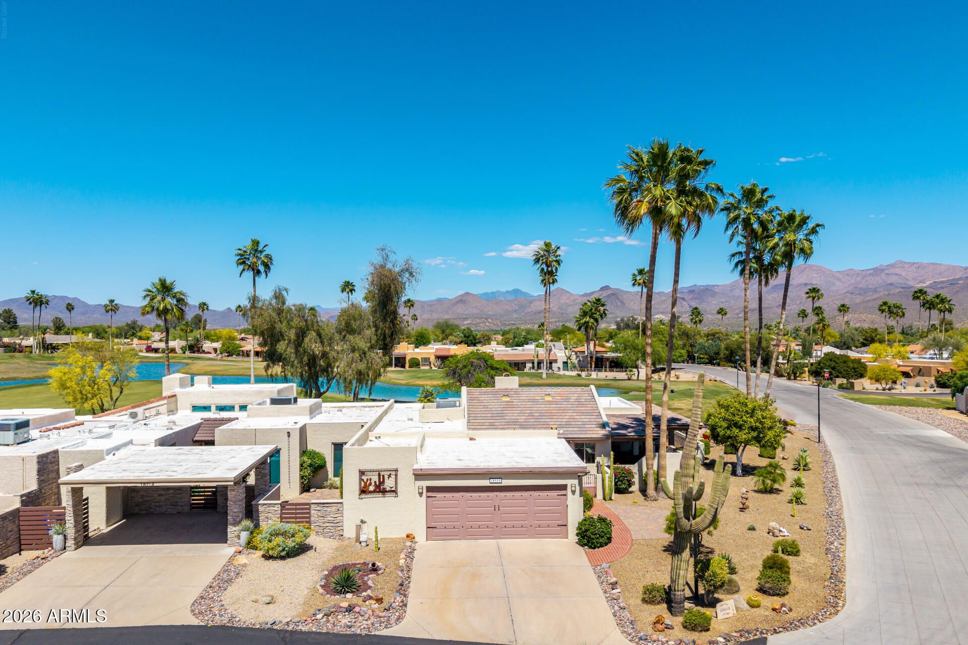 Breathtaking mountain & golf course views. Overlooking golf holes 3, 4, & 5 on Quail Run golf course. It doesn't get any better than this. You don't want to miss this stunning golf-course home in Rio Verde! Nestled in a desirable corner lot, this gem welcomes you with a beautifully landscaped front yard, an inviting courtyard, and a 2-car + golf cart garage. Explore the sizable living spaces perfect for entertaining and comfortable everyday living, showcasing wood-look floors, vaulted ceilings with exposed beams to add character, a fireplace perfect for chilly evenings, and a soothing palette that makes you want to stay. The impeccable kitchen is complete with plentiful storage cabinetry, tile backsplash, ample counter space, SS appliances, and a pass-through window with a breakfast bar. Get a good night's rest in the main bedroom, offering an elegant bathroom with double sinks. Outside, the wraparound patio offers spectacularmountain views that you don't want to miss, providing the perfect spot for relaxing with a refreshing drink or enjoying outdoor dining. Hurry up, this gem won't last!