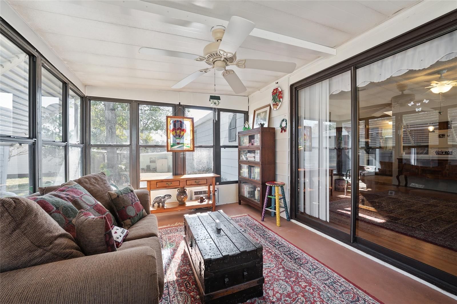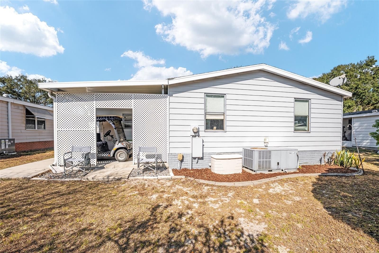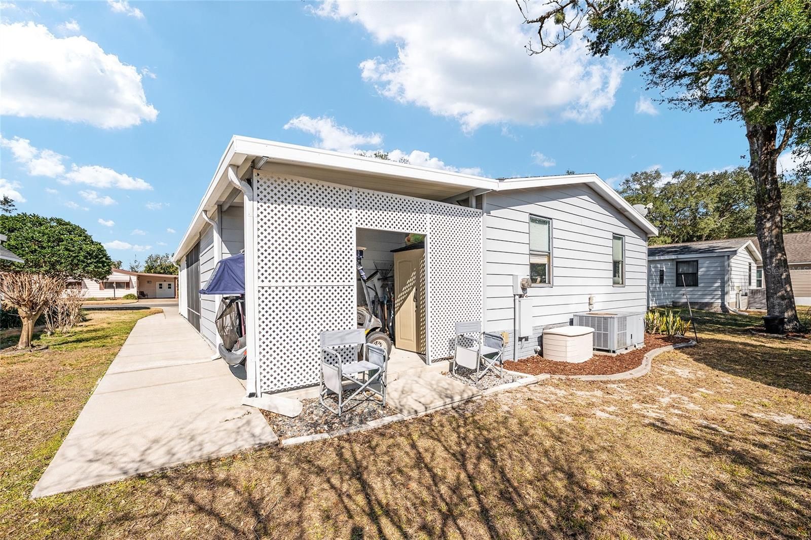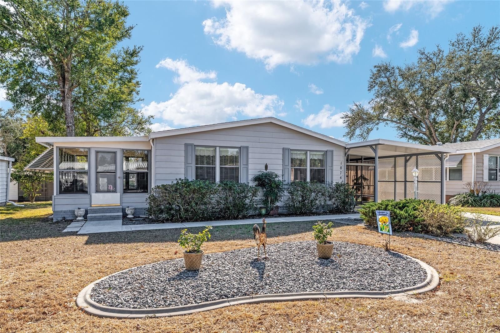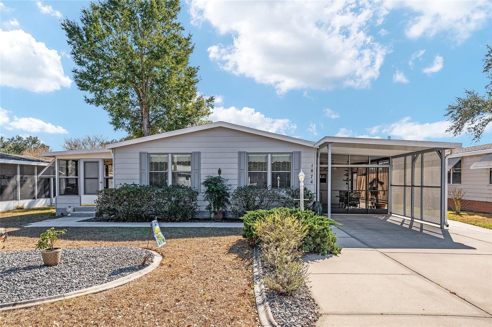 NO BOND OR CDD! This well-maintained 2 Bedroom, 2 Bathroom home with a golf cart garage is located in the desirable Village of Orange Blossom Gardens in The Villages, Florida. The home features a spacious kitchen with ample cabinetry and a separate dining area, ideal for everyday living and entertaining. The open living room flows seamlessly into the enclosed lanai, filled with windows that provide abundant natural light and additional living space. The primary bedroom suite is generously sized and includes a large walk-in closet and en suite bathroom. A comfortable guest bedroom with built-in closet is conveniently located near the guest bathroom, making it perfect for visitors. Additional highlights include a screened carport that can be used for outdoor living, storage, or hobbies, a dedicated laundry room with workshop space, built-in tools, and ample shelving. The home has been recently painted and is move-in ready. Major updates include Roof (2015), HVAC (2011), and Hot Water Heater (2023). Enjoy close proximity to the community pool and championship golf courses, all just steps away. Plus, this home is only a 5-minute golf cart ride to Spanish Springs Town Center, offering shopping, dining, nightly entertainment, and recreation.