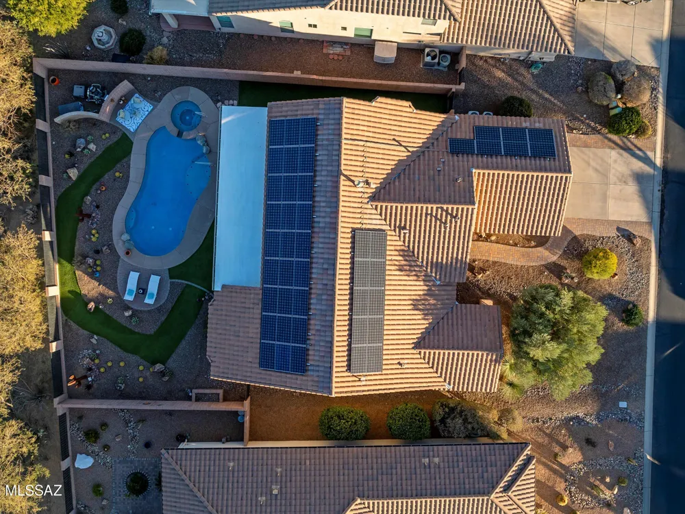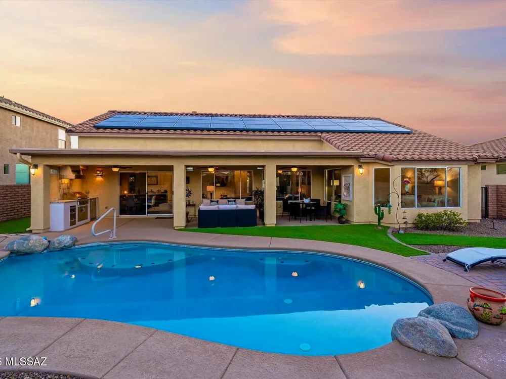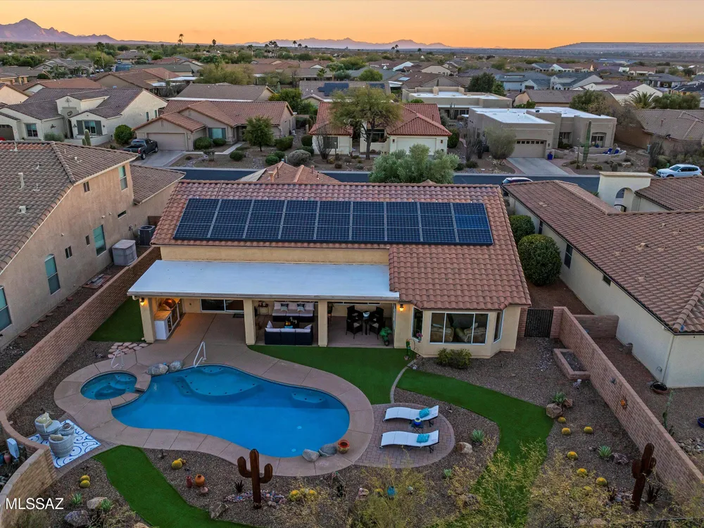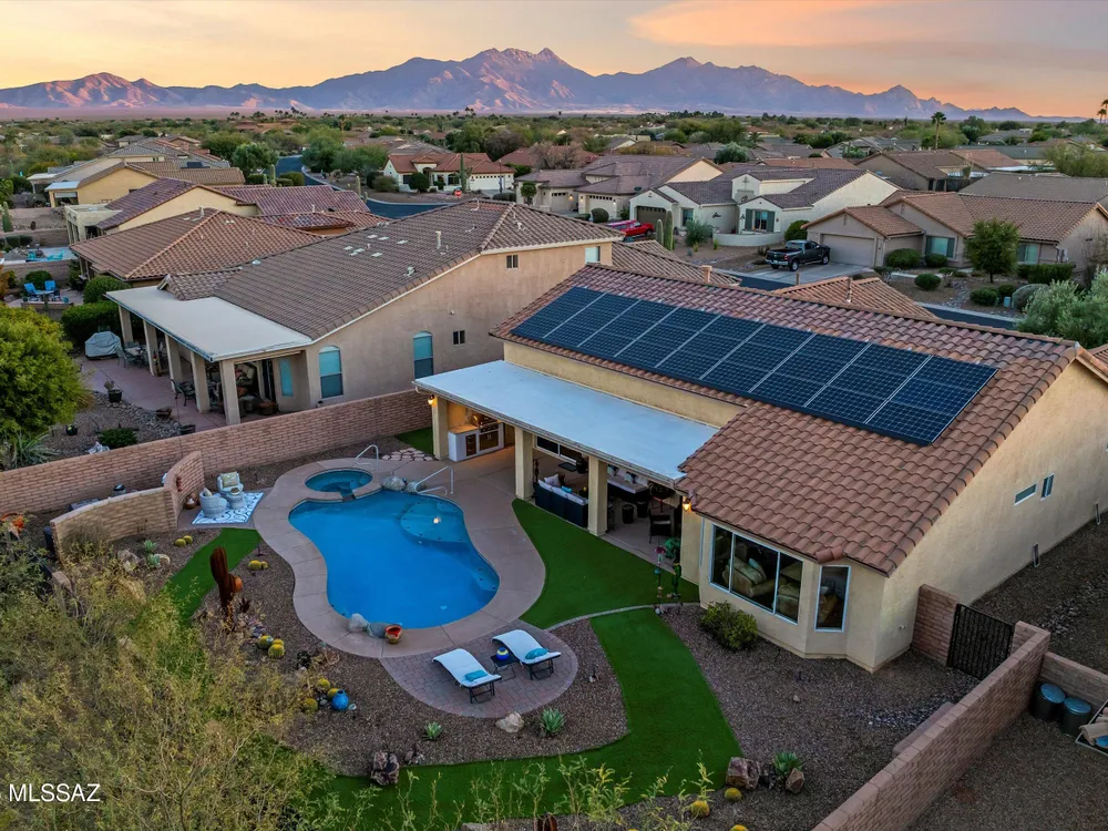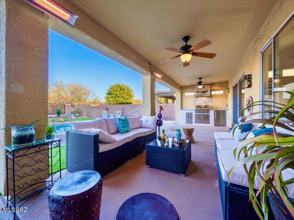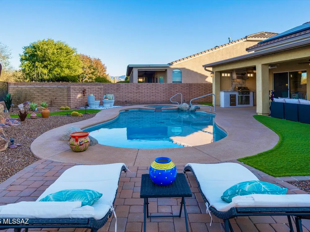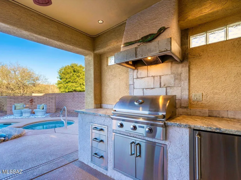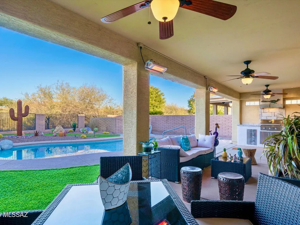 Welcome Home to your own personal desert oasis in the highly sought after Quail Creek master planned community. Whether taking a dip in the sparkling heated pool and spa or making a tee time at your choice of community golf courses, this home doesn't disappoint. Enjoy the outdoor built-in grill/kitchen custom Volt lighting illuminating your backyard, built-in patio heaters. Interior features: Quartz kitchen countertops, custom backsplash, SS appliances, whole house water purification system (2018), on-demand water heater (2019), interior painted (9/2020), upgraded bathrooms, newer bedroom carpeting, walls of windows overlooking backyard oasis. New Roof (1/21) by PDR Roofing, water softener and leased solar. Your desert Oasis awaits!!