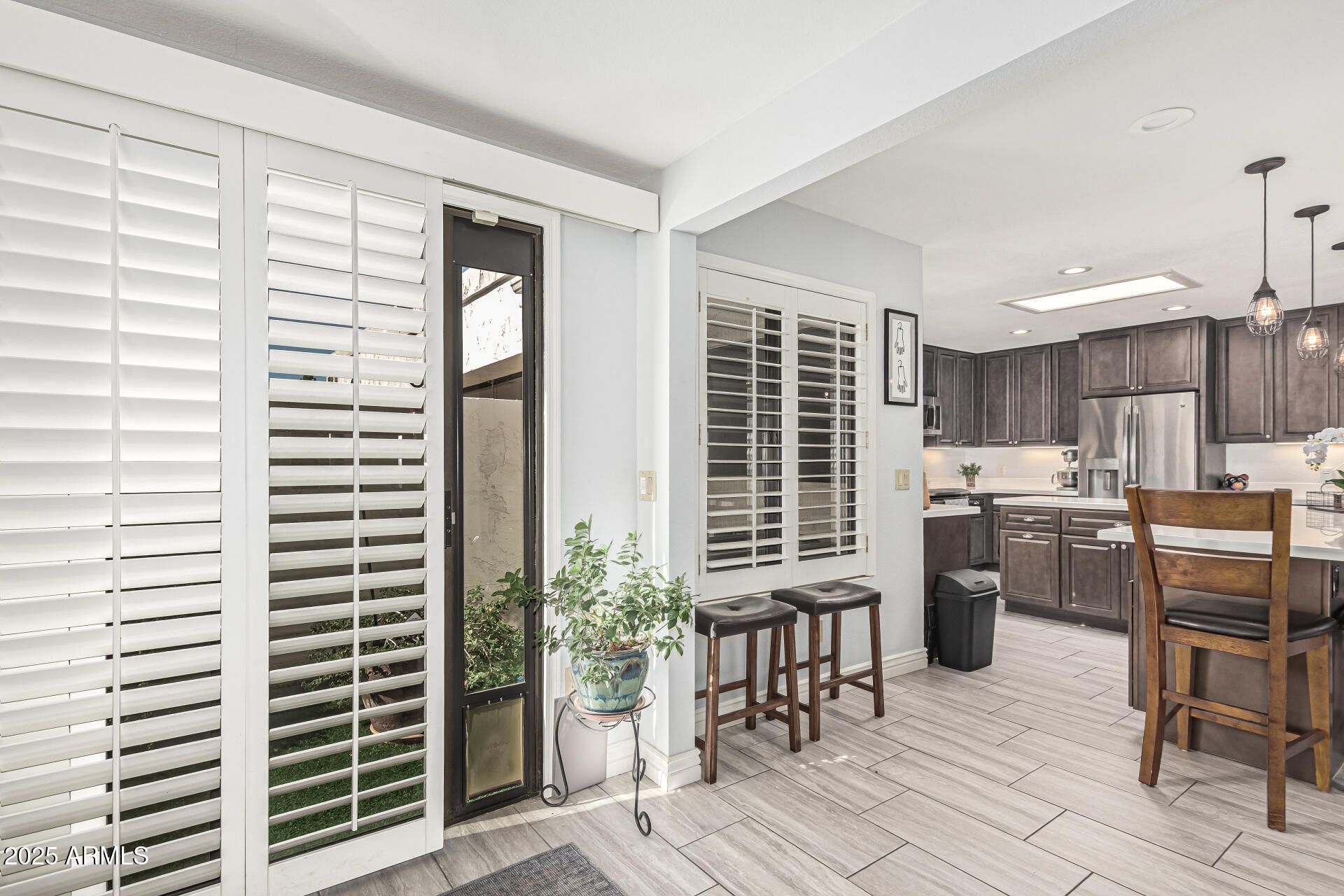 Stunning single level patio home has been beautifully updated. Very open floorplan with very large center island in kitchen. Stainess appliances and granite countertop.Bonus room off the kitchen could be den or craft room. Kitchen, baths and flooring all done in 2016 to perfection. A/C new in 2023. Wide louvered shutters throughout. Refrigerator included. Very light and bright. You will love it. 6 foot by 4 foot storage closet.