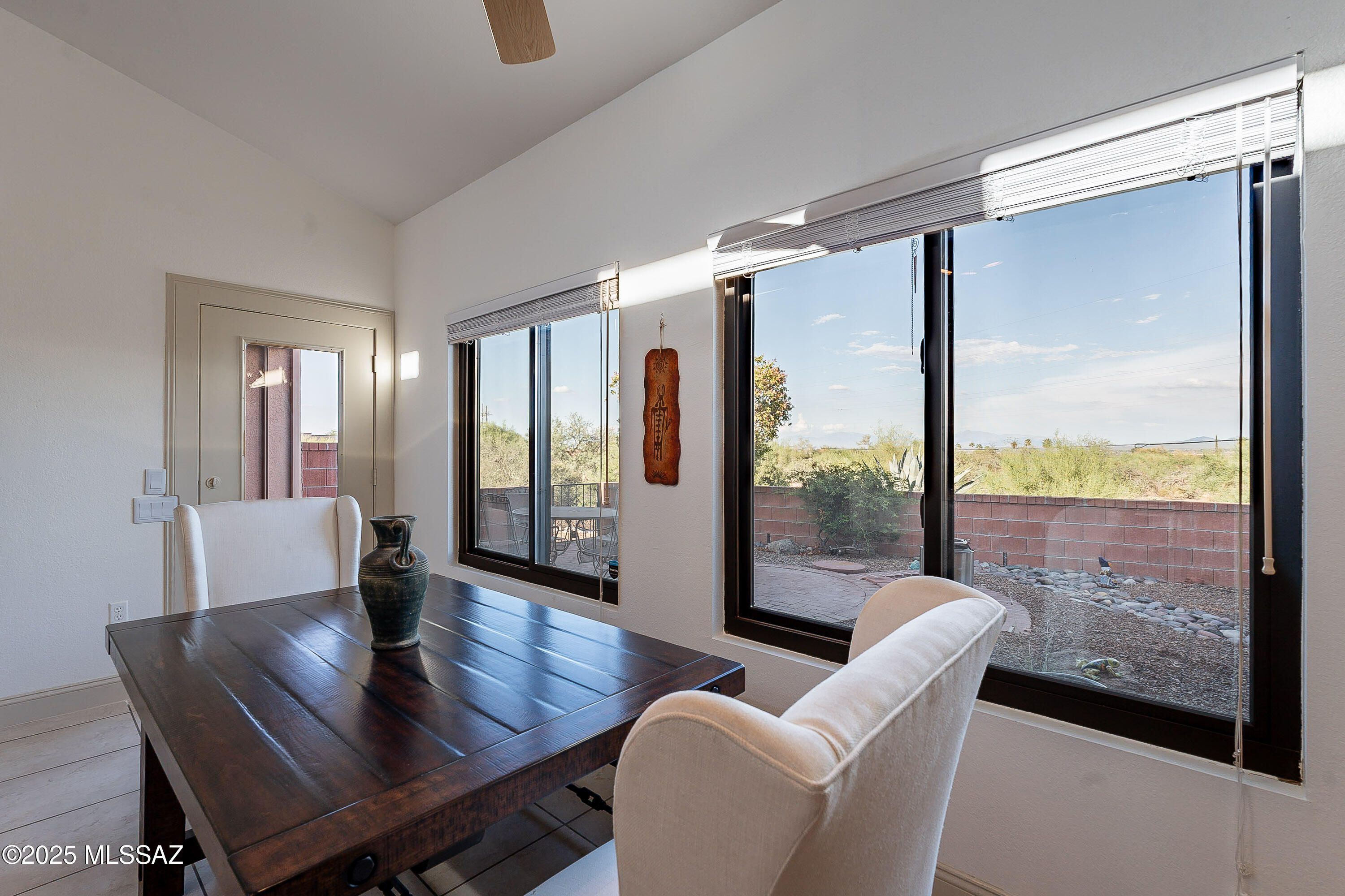 Soaring ceilings, mountain views, and a flexible floor plan in the heart of Green Valley. Just steps from the Las Campanas Green Valley Recreation Center, this townhome offers resort-style living with an Olympic pool, fitness center, and endless activities right at your doorstep. Inside, 18-ft cathedral ceilings and expansive windows flood the space with natural light and frame stunning Santa Rita Mountain views. The flexible layout features a spacious primary bedroom with Murphy bed/office option, plus a remodeled guest bath with walk-in shower, premium soaking tub, and smart toilet. With no carpet--tile and laminate throughout--and easy-care desert landscaping, this home is the perfect full-time residence or lock-and-leave retreat.