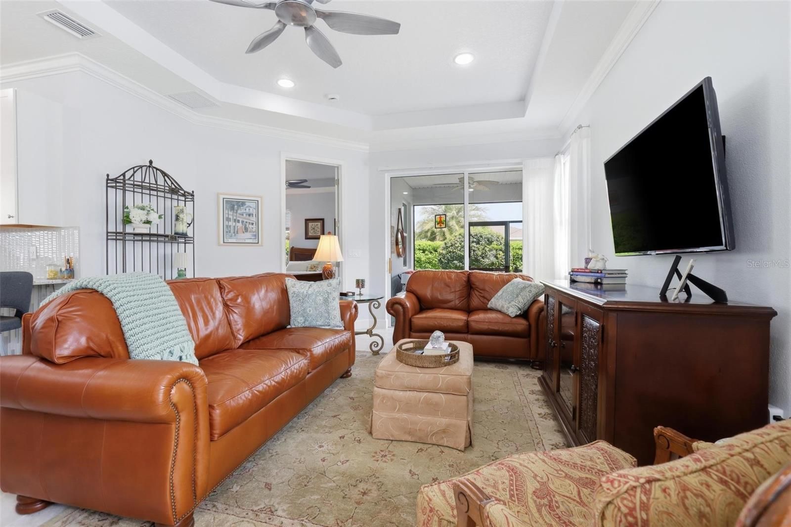 Welcome to this light, bright, and airy Azalea Model, move-in ready and located in the highly sought-after Victoria Gardens 55+, GATED community. This beautifully maintained home features crown molding, tile flooring throughout the main living areas, and new plush carpeting in both the primary and secondary bedrooms, creating a comfortable and elegant living space. The kitchen is designed for both functionality and style, offering a breakfast bar, beautiful pendant lights, granite countertops, top-of-the-line stainless steel appliances, 42-inch white shaker cabinets, upgraded tile backsplash, including tile on the kitchen island, convenient pull-outs, and a large walk-in pantry. The spacious owners suite has TWO walk-in closets offering CALIFORNIA CLOSETS, and a generous en suite bathroom featuring a walk in shower with ungraded tile. The guest bedroom closet has CALIFORNIA CLOSETS as well. Additional upgrades include new ceiling fans, updated lighting, with blinds on all double-pane windows, providing both comfort and energy efficiency. Enjoy Florida lliving year-round from the screened-in lanai, complete with an extended paver patio, surrounded by the beautiful wrought iron fence and high privacy hedge, you will hardly know you have neighbors, perfect for backyard barbecues, relaxing evenings, or entertaining guests. Victoria Gardens offers an EXCEPTIONAL LIFESTYLE LIVING with a private clubhouse featuring: On-site dining and bar, card rooms and billiards, fitness center, Resort-style heated pool and spa, lighted clay tennis courts & pickleball courts, Bocce ball courts, Library, crafts, travel clubs, and ballroom activities. The Victoria Hills Golf Course is conveniently located just across the street, and you are only minutes from the quaint and historic Downtown DeLand, offering charming boutiques, dining, and everyday shopping, the Publix Shopping center that is just 5 minutes away. Across the street are local restaurant, medical facilities, dry cleaners, dentist and dog grooming for your convenience. This home combines comfort, convenience, and an active lifestyle in one of DeLand’s premier 55+ communities. ????
