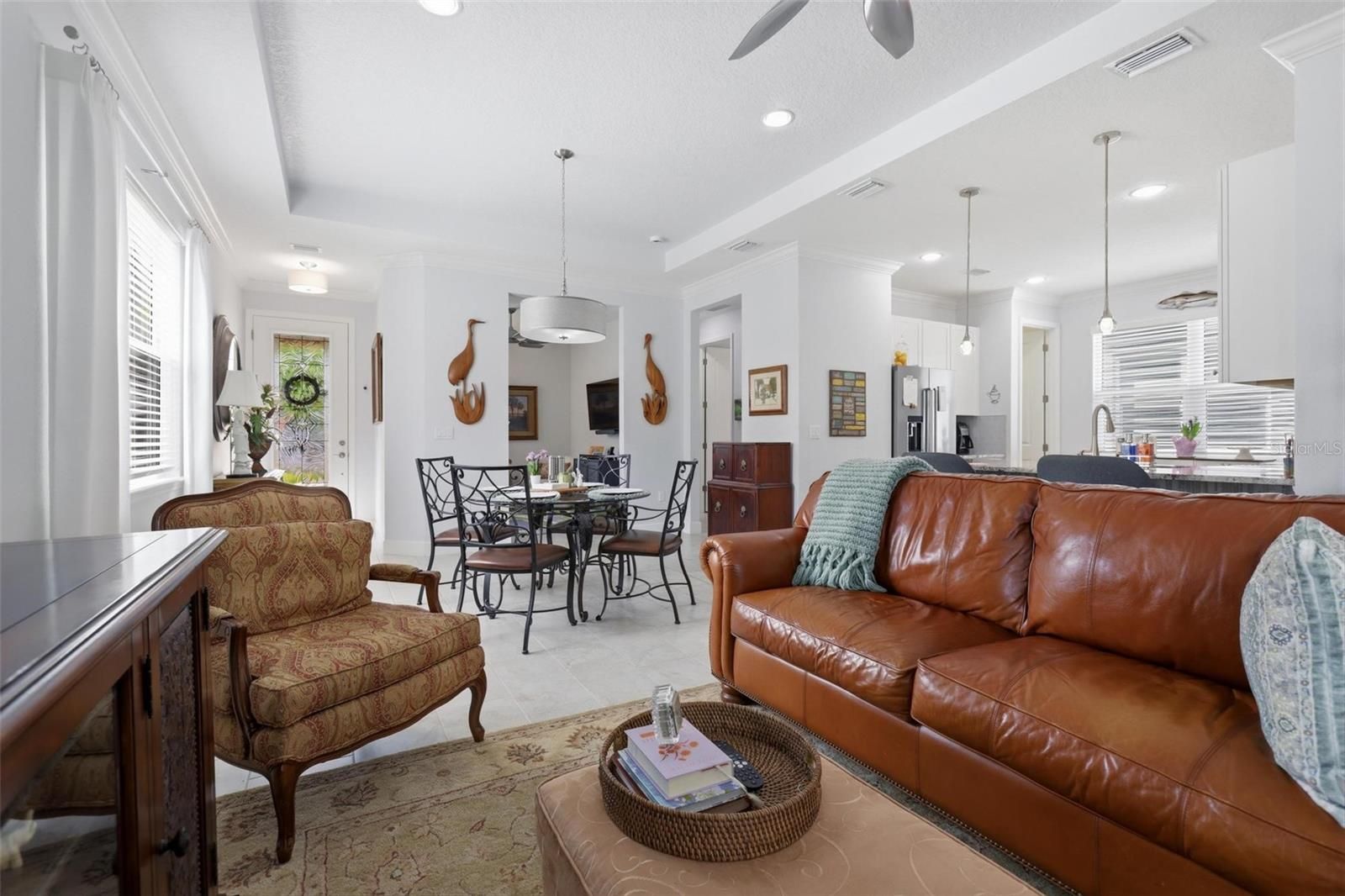 - Ceiling Fan(s), Crown Molding, High Ceilings, Kitchen/Family Room Combo, Living/Dining Room, Open Floorplan, Main Level Primary, Solid Surface Counters, Solid-Wood Cabinets, Split Bedrooms, Thermostat, Tray Ceiling(s), Walk-In Closet(s)