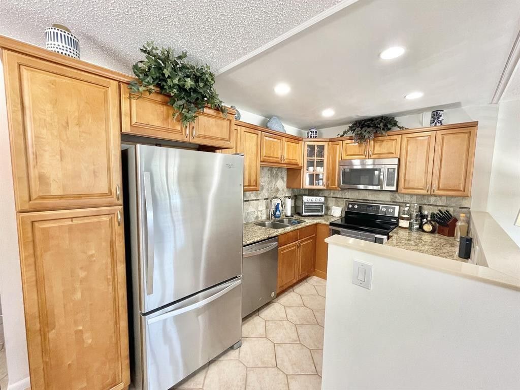 BEAUTIFULLY REMODELED 1 bedroom, 1.5 bath condo on the 2nd flr featuring an OPEN-CONCEPT FLR PLAN. The lt & bright liv space has plantation shutters, IMPACT WINDOWS & tile flrs thru-out. Unit is UNFURNISHED (photos for staging only). The upgraded kit offers granite cntr tops, ss appl, recessed ltg, generous counter space, & a pantry. Primary bath is stylishly updated w/a shower stall & glass shower doors. Enjoy a tranquil garden view from encl patio. Bldg. has a NEW ROOF! Ideally located walking dist to the plaza & pool! This vibrant 55+ gated community offers RESORT STYLE LIVING at its finest w/full amenities, community buses, clubhouse, pools, pickleball, tennis, putting green, gym, billiards & more! Only 10 min from the beach & close to shopping! Your paradise awaits. ASSOC. CLAIMS 55+