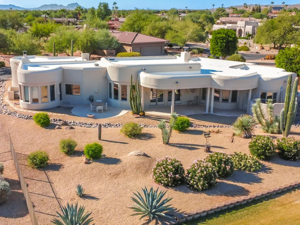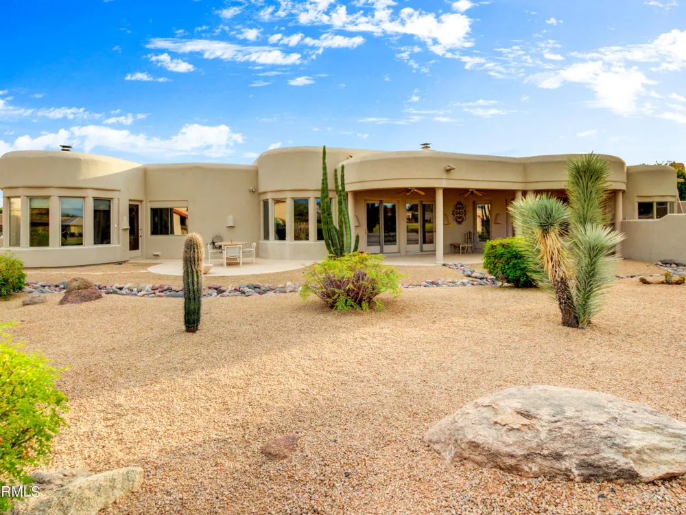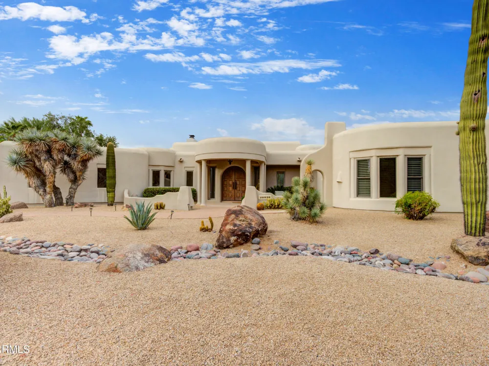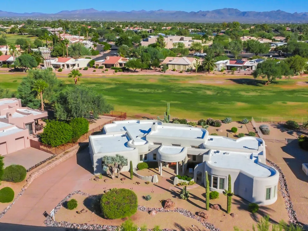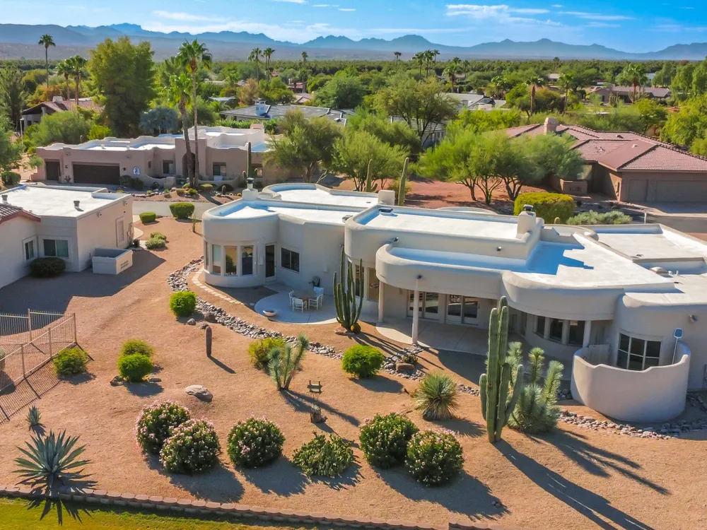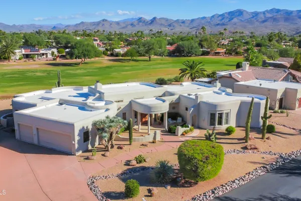 Well built custom Southwest style home on the golf course in Rio Verde. Views to the NE mountains. Formal and Casual Dining. Built in wetbar in great room. Spacious Primary Suite with access to patio and private inground hot tub, bath w/dual vanities and separate closets. Ensuite Guest room on opposite side of the home with front courtyard access. Cozy den/office with niches. Kitchen has plenty of storage, large island with cooktop, Subzero fridge. Sitting area by fireplace adjoins kitchen. Covered back patio and plenty of space to entertain. Beautiful carved solid wood front door and interior doors are ruff hewn solid wood. Flagstone flooring all around except for hardwood in primary suite. 2 car plus golf cart garage. Come and see this special home bordering White Wing #2!