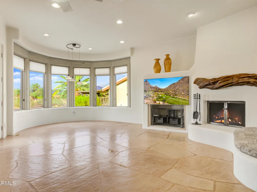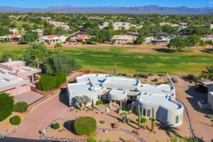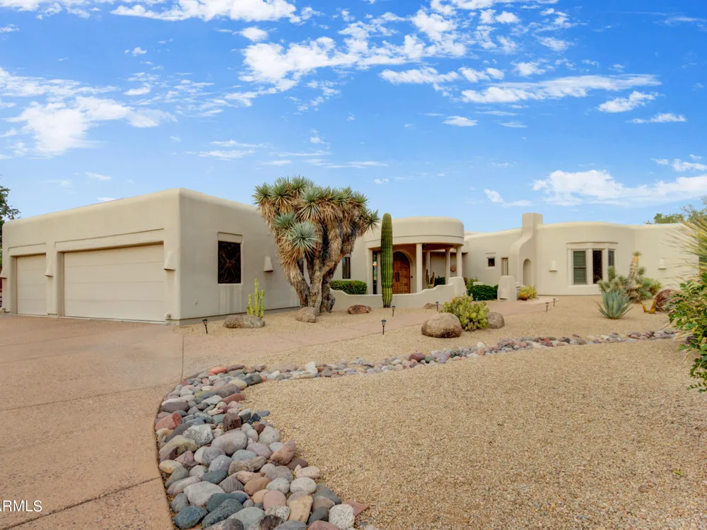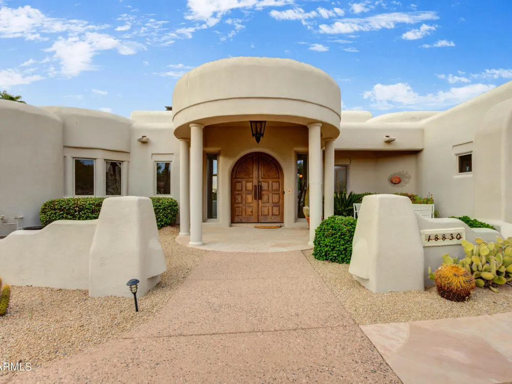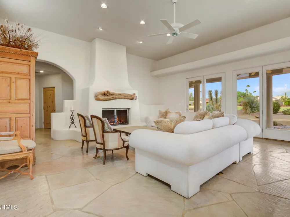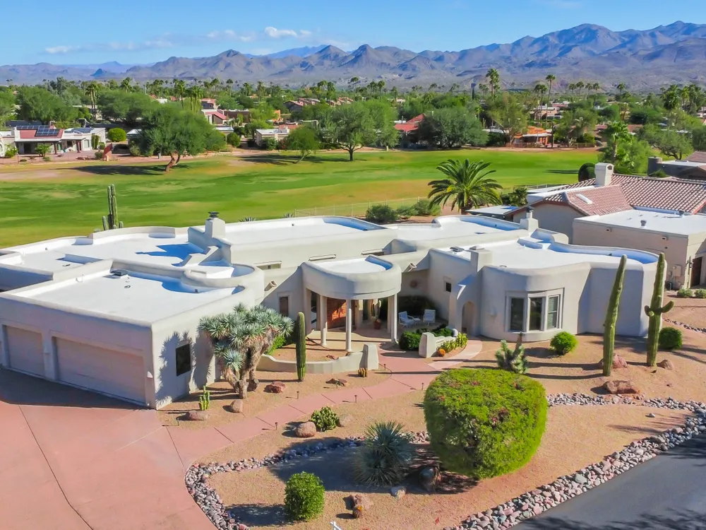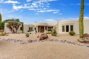 Well built custom Southwest style home on the golf course in Rio Verde. Views to the NE mountains. Formal and Casual Dining. Built in wetbar in great room. Spacious Primary Suite with access to patio and private inground hot tub, bath w/dual vanities and separate closets. Ensuite Guest room on opposite side of the home with front courtyard access. Cozy den/office with niches. Kitchen has plenty of storage, large island with cooktop, Subzero fridge. Sitting area by fireplace adjoins kitchen. Covered back patio and plenty of space to entertain. Beautiful carved solid wood front door and interior doors are ruff hewn solid wood. Flagstone flooring all around except for hardwood in primary suite. 2 car plus golf cart garage. Come and see this special home bordering White Wing #2!
