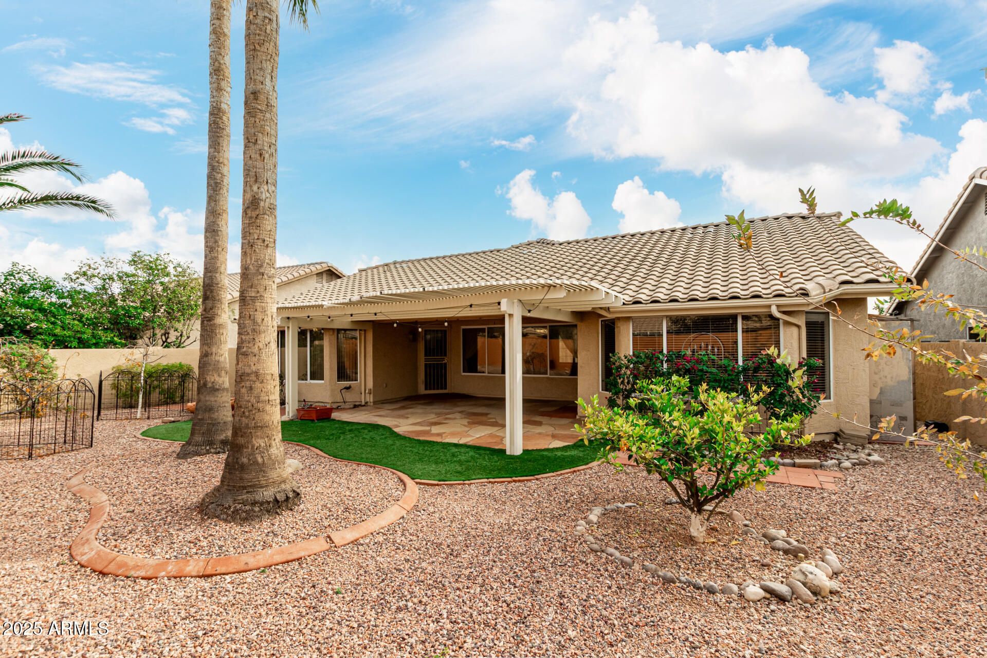 Charming single-story home in the desirable 55+ Westbrook Village! Manicured landscaping, two-car garage, & solar panels for energy efficiency! Inside, an open layout offers vaulted ceilings enhanced by neutral paint, plantation shutters, wood-style flooring, & lovely bay windows in the right areas. The inviting kitchen features SS appliances, crisp white cabinetry, a convenient breakfast bar, Corian counters, & a classic tile backsplash. The main bedroom has private access to the backyard, a mirrored door walk-in closet, & a well-appointed ensuite with dual sinks, grab bars, & a separate tub/shower. Enjoy a peaceful desert-style backyard complete with a covered patio, misting system, & extended Ramada. Easy living in one of the area's most sought-after active adult communities! Hurry!