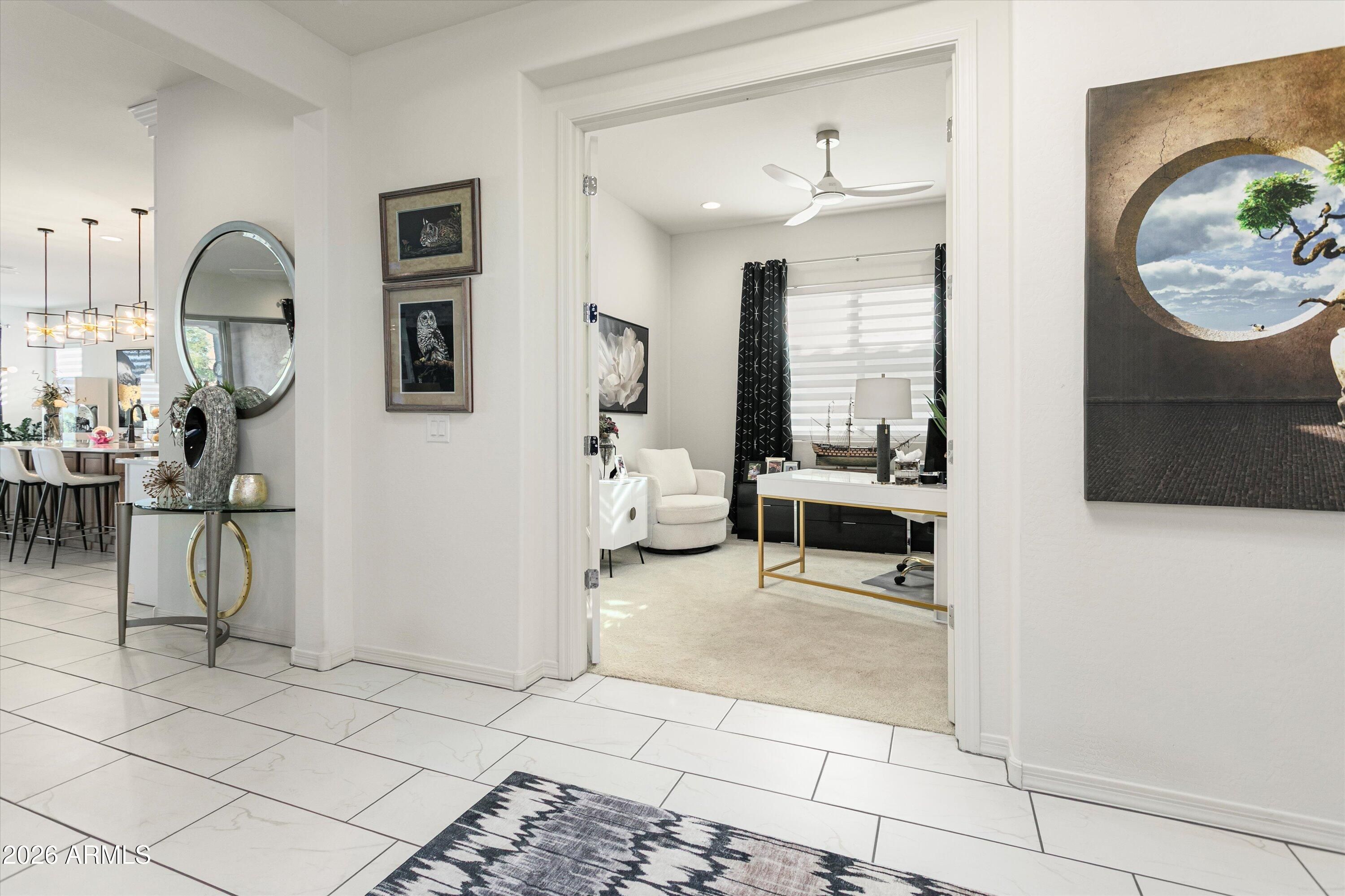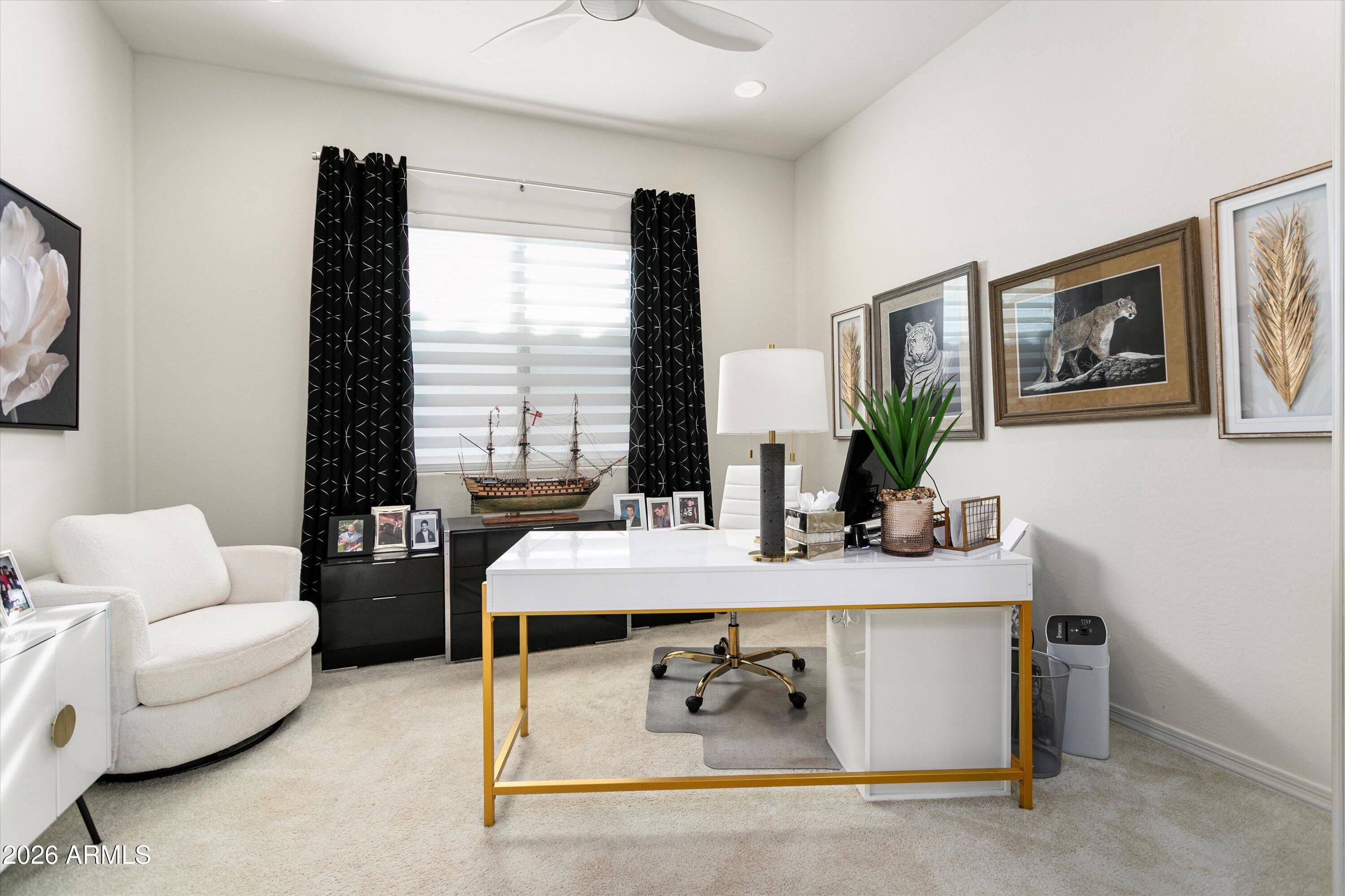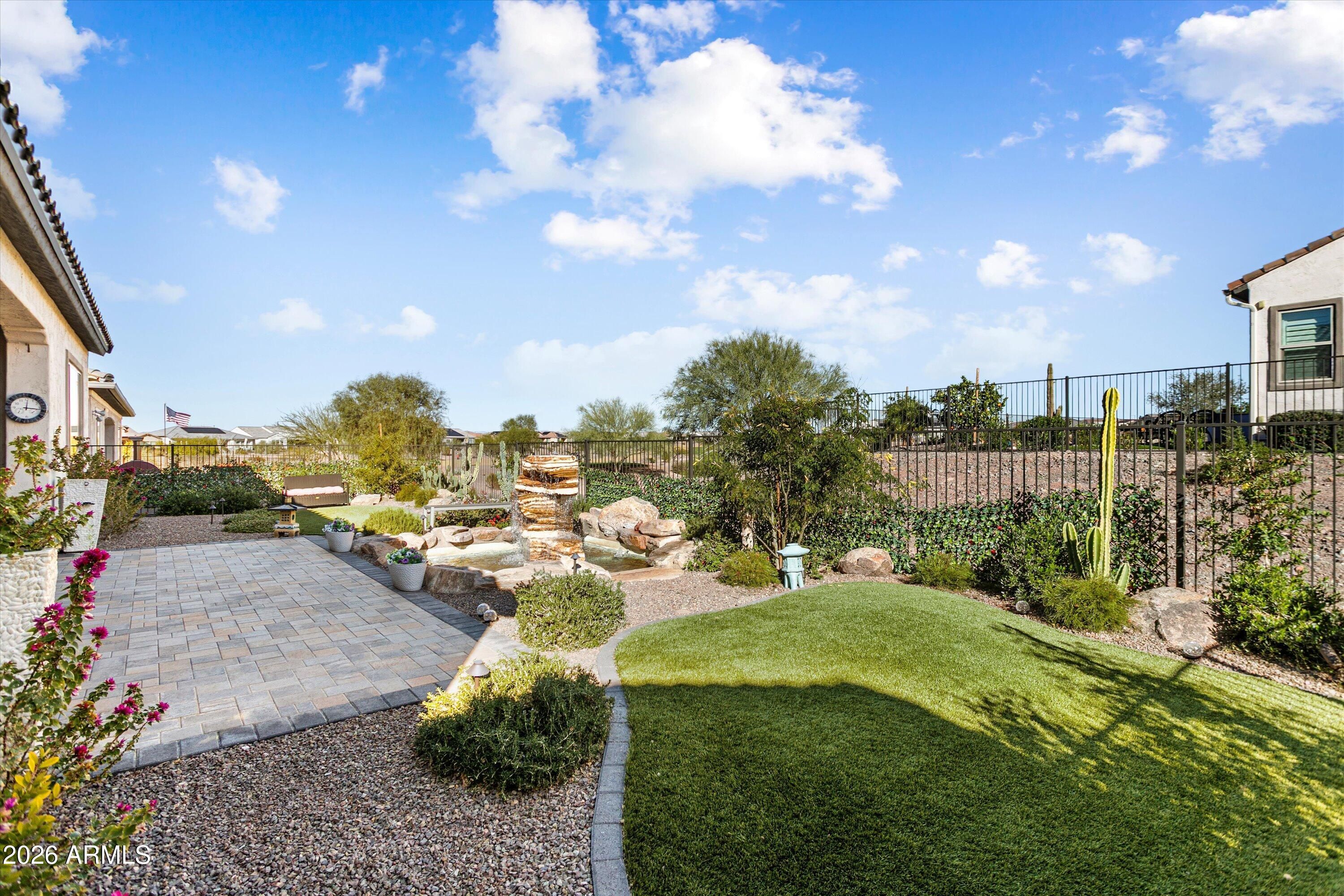 Welcome to a remarkable home located in Sun City Festival, offering breathtaking golf course and mountain views. This rare 2 Year Young, ''Better Than New'' Voyage Model is a spacious 3-bedroom property with 3-car garage, designed to fulfill your dream home aspirations. Boasting numerous builder upgrades along with $80,000 in homeowner improvements, this unique desert sanctuary truly has it all. Step inside to discover an impeccably maintained residence and enjoy luxury living at its best. The home features a 2.5-foot extension, expanding the layout to 2,736 sq ft and providing enhanced comfort & functionality, ideal for entertaining guests. The elevated lot includes a custom acrylic driveway, paver walkways & CUSTOM iron gate leading to a spacious and welcoming private courtyard. Inside designer tile flows throughout key areas, complemented by a stylish media wall with fireplace. The formal dining area is perfect for gatherings, while the gourmet kitchen is equipped with quartz countertops, marble backsplash, KitchenAid SS appliances, extended cupboards with slide-outs, wall ovens, gas cooktop, breakfast bar w/extra storage, & a large pantry. Guests will appreciate the private ensuite with 2 closets featured in this thoughtfully designed floor plan. For those seeking a quiet workspace, the flexible third bedroom/den is enhanced by private French doors, making it an ideal home office or hobby area. Retreat to the owner's suite, which includes a relaxing sitting area, 2 walk-in closets with built-ins, & a spa-style ensuite bathroom. Center sliding glass doors in the great room seamlessly extend the living area to the backyard oasis, showcasing spectacular views, extended landscaping & a custom water feature. Laundry Room & golf cart garage both offer built-in storage. Residents enjoy access to world-class amenities at the Sage and Saguaro Recreation Centers. Activities include golf, fitness centers, pools, spas, a walking track, aerobics and dance studios, tennis, pickleball, baseball, a woodshop, pottery, glasswork, & so much more. This home is truly a must-see, offering a unique blend of luxury, comfort, and endless entertainment opportunities. For additional features, please refer to the document tab.