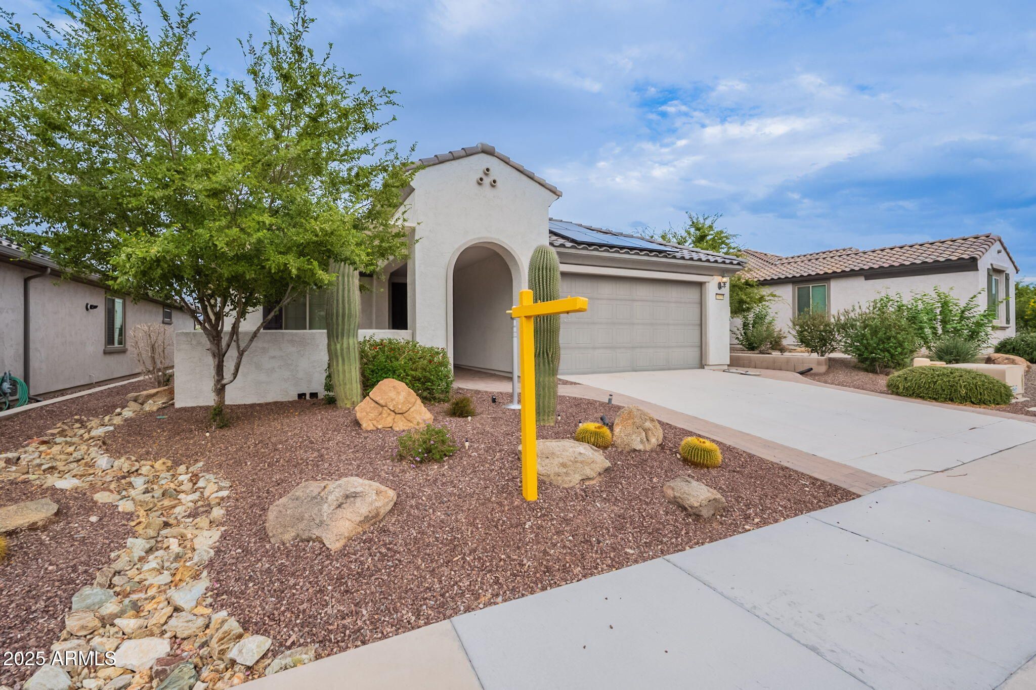 SELLER TO PAY OFF SOLAR LEASE AT CLOSE OF ESCROW. Experience comfort and style in this beautiful 1,859 sq. ft. home showcasing over $80K in premium upgrades. The home features 2 bedrooms, 2 bathrooms, and a versatile den/office—perfect for guests, hobbies, or working from home. The open-concept design showcases upgraded flooring throughout, recessed lighting and electric shades in every room, as well as upgraded fixture and door hardware. A chef-inspired kitchen boasts quartz countertops, Shaker-style cabinetry, and a large walk-in pantry. The spacious great room is bright, inviting, and wired for a whole-home speaker system. . The serene primary suite offers a large walk-in closet and a luxurious bath with dual sinks and a fully tiled, low-threshold shower with built-in bench. Additional upgrades include an air-conditioned, extended-size garage and a tankless water heater for efficiency and convenience. Enjoy outdoor living year-round with covered patios in both the front and back. A custom wood pergola adds shade and charm, and professional landscaping with an irrigation system provides the perfect backdrop for relaxing or entertaining. Enjoy the active lifestyle of Sun City Festival with access to golf, fitness, clubs, and walking trails. This home is walking distance to community's newest community pool and gym.