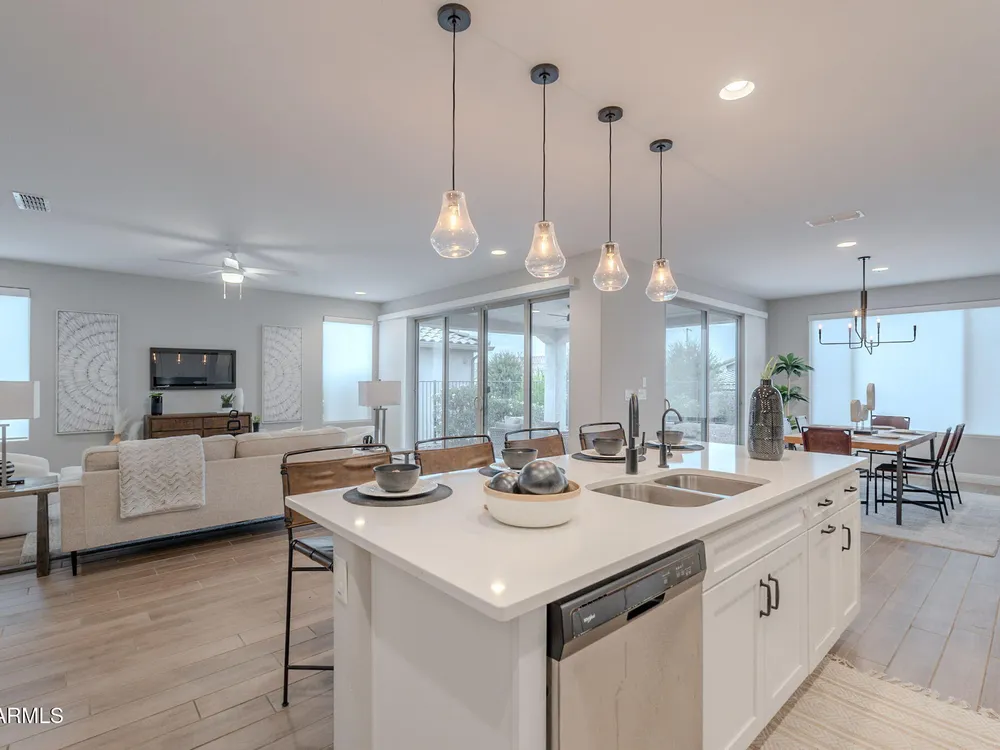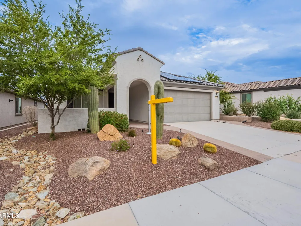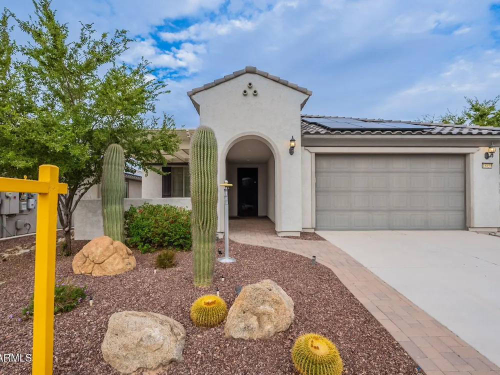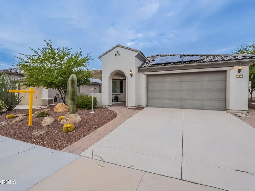 Experience comfort and style in this beautiful 1,859 sq. ft. home showcasing over $80K in premium upgrades. The home features 2 bedrooms, 2 bathrooms, and a versatile den/office—perfect for guests, hobbies, or working from home. The open-concept design showcases upgraded flooring throughout, recessed lighting and electric shades in every room, as well as upgraded fixture and door hardware. A chef-inspired kitchen boasts quartz countertops, Shaker-style cabinetry, and a large walk-in pantry. The spacious great room is bright, inviting, and wired for a whole-home speaker system. The serene primary suite offers a large walk-in closet and a luxurious bath with dual sinks and a fully tiled, low-threshold shower with built-in bench. The guest bath features an upgraded tile and vanity for a refined touch. Additional upgrades include an air-conditioned, extended-size garage and a tankless water heater for efficiency and convenience. Enjoy outdoor living year-round with covered patios in both the front and back. A custom wood pergola adds shade and charm, and professional landscaping with an irrigation system provides the perfect backdrop for relaxing or entertaining. Enjoy the active lifestyle of Sun City Festival with access to golf, fitness, clubs, and walking trails. This home is walking distance to community's newest community pool and gym.
