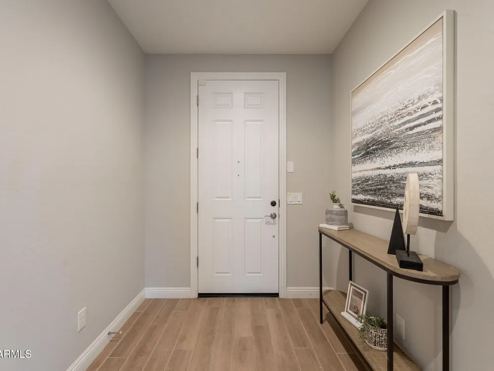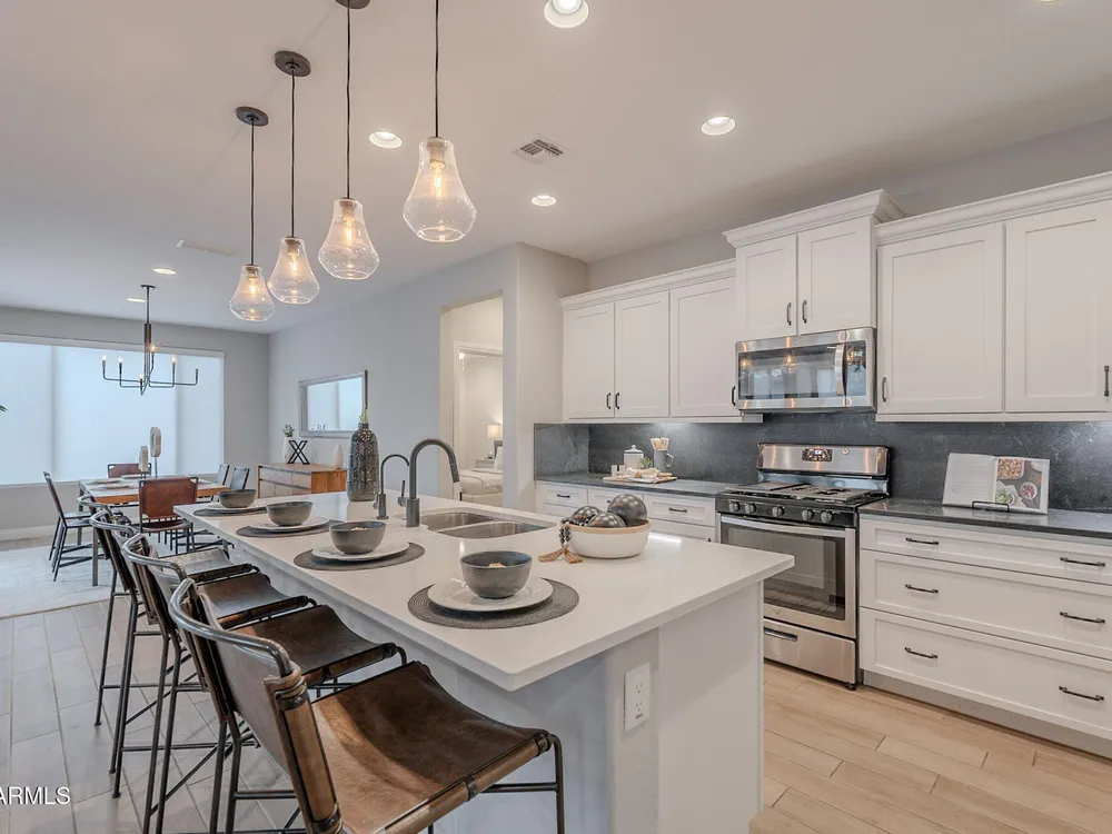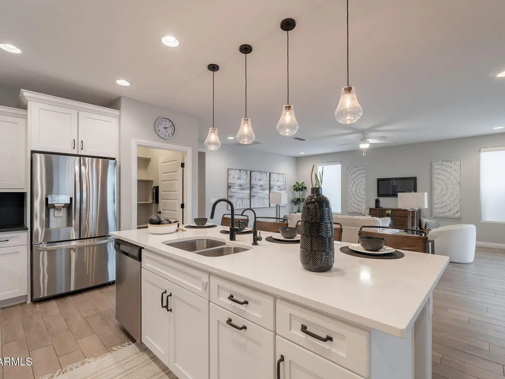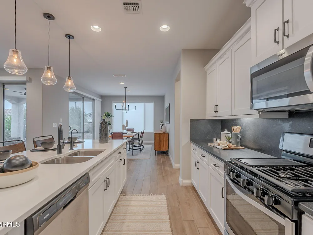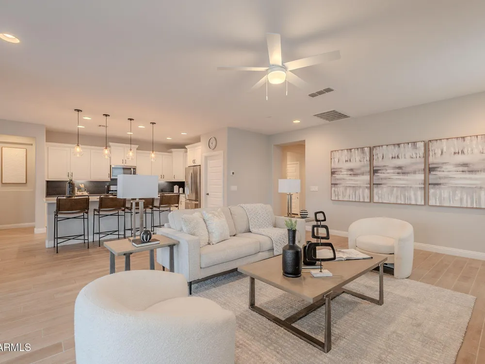 Experience comfort and style in this beautiful 1,859 sq. ft. home showcasing over $80K in premium upgrades. The home features 2 bedrooms, 2 bathrooms, and a versatile den/office—perfect for guests, hobbies, or working from home. The open-concept design showcases upgraded flooring throughout, recessed lighting and electric shades in every room, as well as upgraded fixture and door hardware. A chef-inspired kitchen boasts quartz countertops, Shaker-style cabinetry, and a large walk-in pantry. The spacious great room is bright, inviting, and wired for a whole-home speaker system. The serene primary suite offers a large walk-in closet and a luxurious bath with dual sinks and a fully tiled, low-threshold shower with built-in bench. The guest bath features an upgraded tile and vanity for a refined touch. Additional upgrades include an air-conditioned, extended-size garage and a tankless water heater for efficiency and convenience. Enjoy outdoor living year-round with covered patios in both the front and back. A custom wood pergola adds shade and charm, and professional landscaping with an irrigation system provides the perfect backdrop for relaxing or entertaining. Enjoy the active lifestyle of Sun City Festival with access to golf, fitness, clubs, and walking trails. This home is walking distance to community's newest community pool and gym.