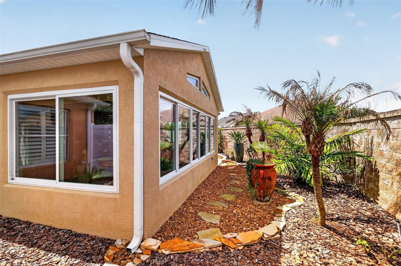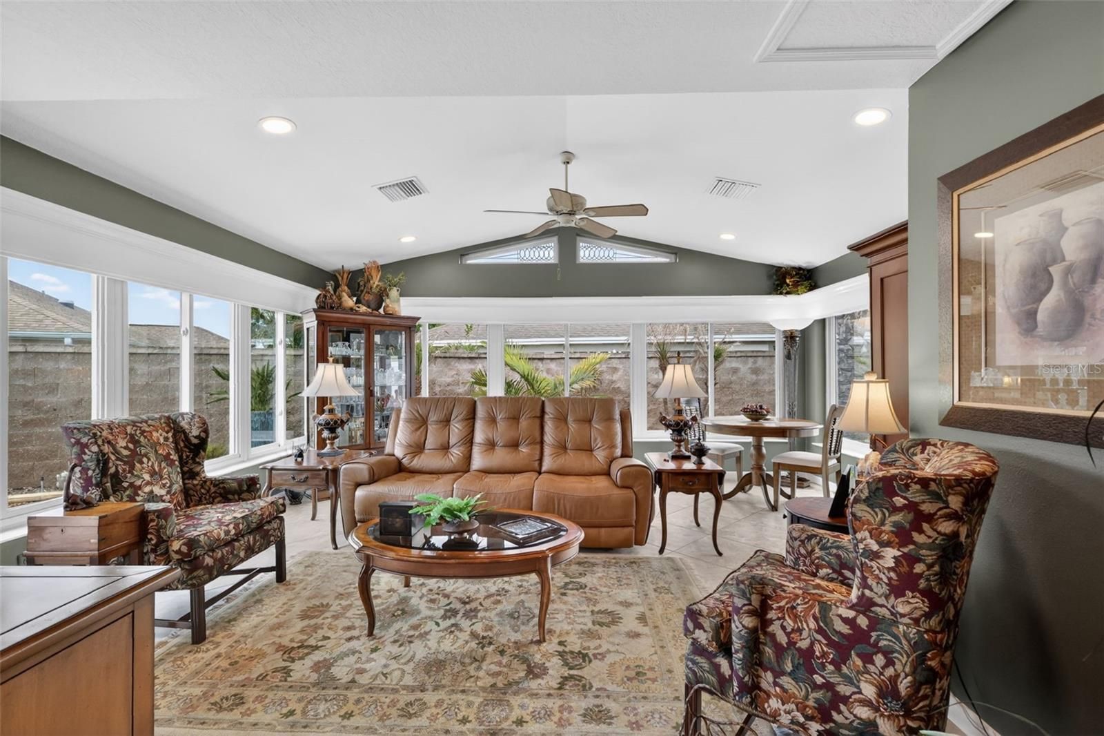 Discover refined Florida living in this EXQUISITE, BLOCK and STUCCO 3/2 Anaheim Courtyard Villa, IDEALLY SITUATED on a LARGE, PRIVATE lot! Designed for effortless enjoyment with an EXPANSIVE 19' x 18' FLORIDA ROOM, SPACIOUS side PAVER patio, and beautifully finished LOW-MAINTENANCE stoned landscaping throughout—NO GRASS to maintain—Perfectly positioned between Lake Sumter Landing and Brownwood Paddock Square in the highly desirable Village of St. James offering both PRIVACY and PRIME CONVENIENCE! BOND PAID! A covered entry with a PAVER floor and a custom LEADED-GLASS front door with sidelight creates a warm first impression, opening into a SPACIOUS foyer. Inside, STUNNING Brazilian tiger HARDWOOD FLOORING is complemented by PLANTATION SHUTTERS, custom CROWN MOLDING, and ARCHED DOORWAYS—adding timeless ELEGANCE throughout. Additional upgrades include energy-efficient LED lighting and CUSTOM CLOSETS with convenient pressure-sensing illumination. The MAGNIFICENTLY RENOVATED kitchen features WHITE cabinetry with ROLL-OUT shelving, built-in PANTRY and shelves, EBONY GRANITE countertops, hexagon TILE backsplash, STAINLESS appliances, under-cabinet lighting, and counter-height EAT-IN breakfast bar for casual dining. Soaring VAULTED ceilings and an OPEN-CONCEPT design seamlessly connect the living, dining, and kitchen areas, creating a light-filled central living space. Sliding glass doors from the dining room open to an INCREDIBLE, SPACIOUS side PAVER patio with LOW-MAINTENANCE stone landscaping beds, curved walls, and PLENTY of room for a FUTURE POOL—all within a PRIVATE, enclosed courtyard. This serene setting is perfect for entertaining or simply relaxing while enjoying Florida’s beautiful weather! The highlight of the home is a BRIGHT, EXPANSIVE 19' x 18' Florida room that impresses with a VAULTED ceiling, diagonal TILE flooring, elegant LEADED-GLASS triangular transom windows, and surrounding WALLS of WINDOWS accented with custom CORNICES, all overlooking the STUNNING courtyard! The primary bedroom showcases a TRAY ceiling and a CUSTOM WALK-IN closet. Its en-suite bathroom features “basketweave” TILE floor, EBONY vanity with GRANITE top, WALK-IN TILED shower, and a separate water closet. The second bedroom and bathroom are tucked behind a POCKET DOOR for added PRIVACY. Bedroom two features a VAULTED ceiling and a CUSTOM built-in closet. The second bathroom has a WHITE vanity with GRANITE top, TILE WALK-IN shower, and a hallway linen closet. Centrally located, just outside of the second bed and bathroom, is an INTERIOR laundry room with WHITE cabinetry and a utility sink. A third bedroom is near the foyer and also features a VAULTED CEILING and CUSTOM built-in closet. The 18’x23’ garage boasts an EPOXIED floor, attic access with stairs, NOVA whole-house water filtration system, and PLENTY of space for parking and storage! DON’T MISS YOUR OPPORTUNITY to make this FABULOUS HOME YOUR OWN! The Village of St James is IDEALLY LOCATED near both Lake Sumter Landing and Brownwood Paddock Squares. Close to Seabreeze Regional Recreation Center; Sterling Heights Family Pool; Cane Garden, Havana, and Evans Prairie Country Clubs and Championship Golf Courses; and Trailwinds, Colony, Sarasota Plazas and CR 466A with an abundance of shopping, dining, banking, medical, and more! PLEASE WATCH OUR WALKTHROUGH VIDEO of this MAGNIFICENT HOME IN AN AMAZING LOCATION and call today to schedule your Private Showing or Virtual Tour!