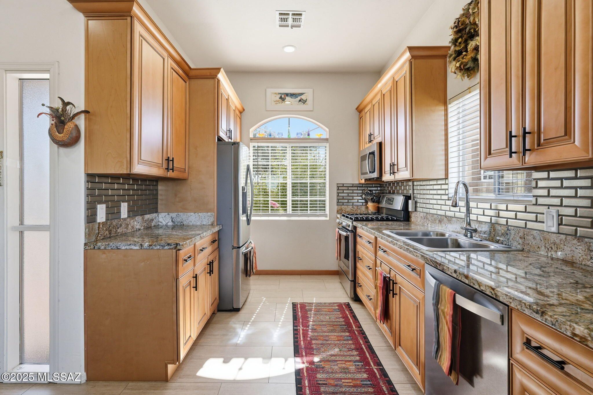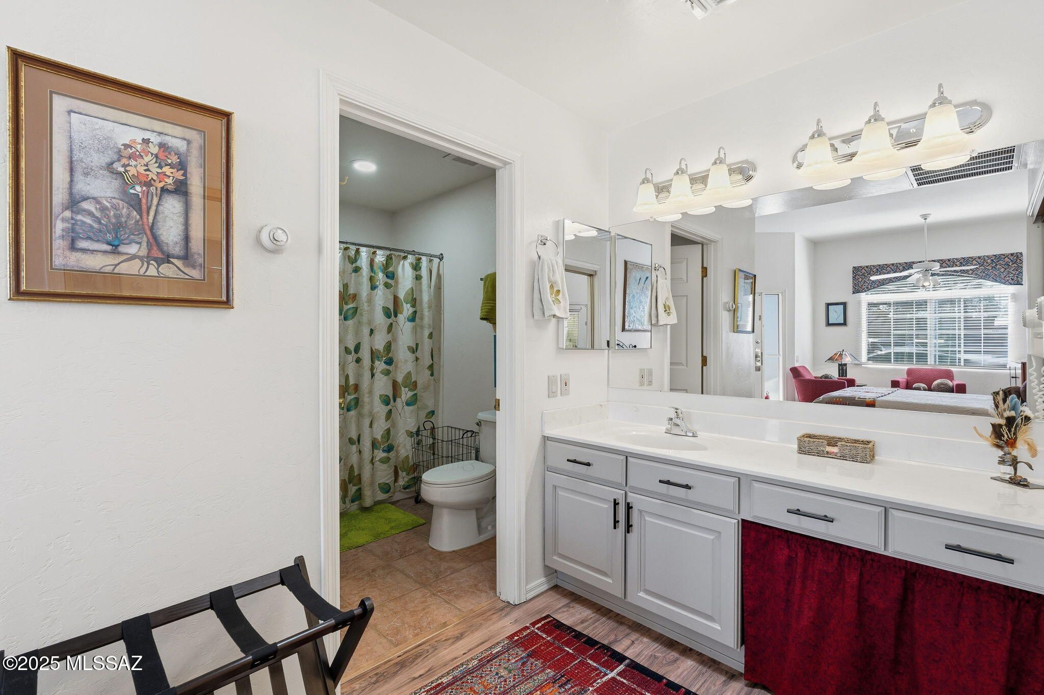 This gorgeously updated corner-lot villa in the heart of San Ignacio is perfect as a full-time residence, seasonal desert retreat, or investment opportunity. The spacious great room is filled with natural light and features soaring ceilings and newer flooring. The stylish, modern kitchen offers custom cabinetry, granite countertops, stainless-steel appliances, and abundant counter and storage space. The primary suite includes a walk-in closet and an en-suite bath with expansive dual vanities. The guest suite, with its own private entrance and lockout door, provides exceptional flexibility for guests or dual-living potential and features a convenient kitchenette, full bath, generous sitting area, and large closet. Step outside to a private patio with sweeping mountain and desert views.