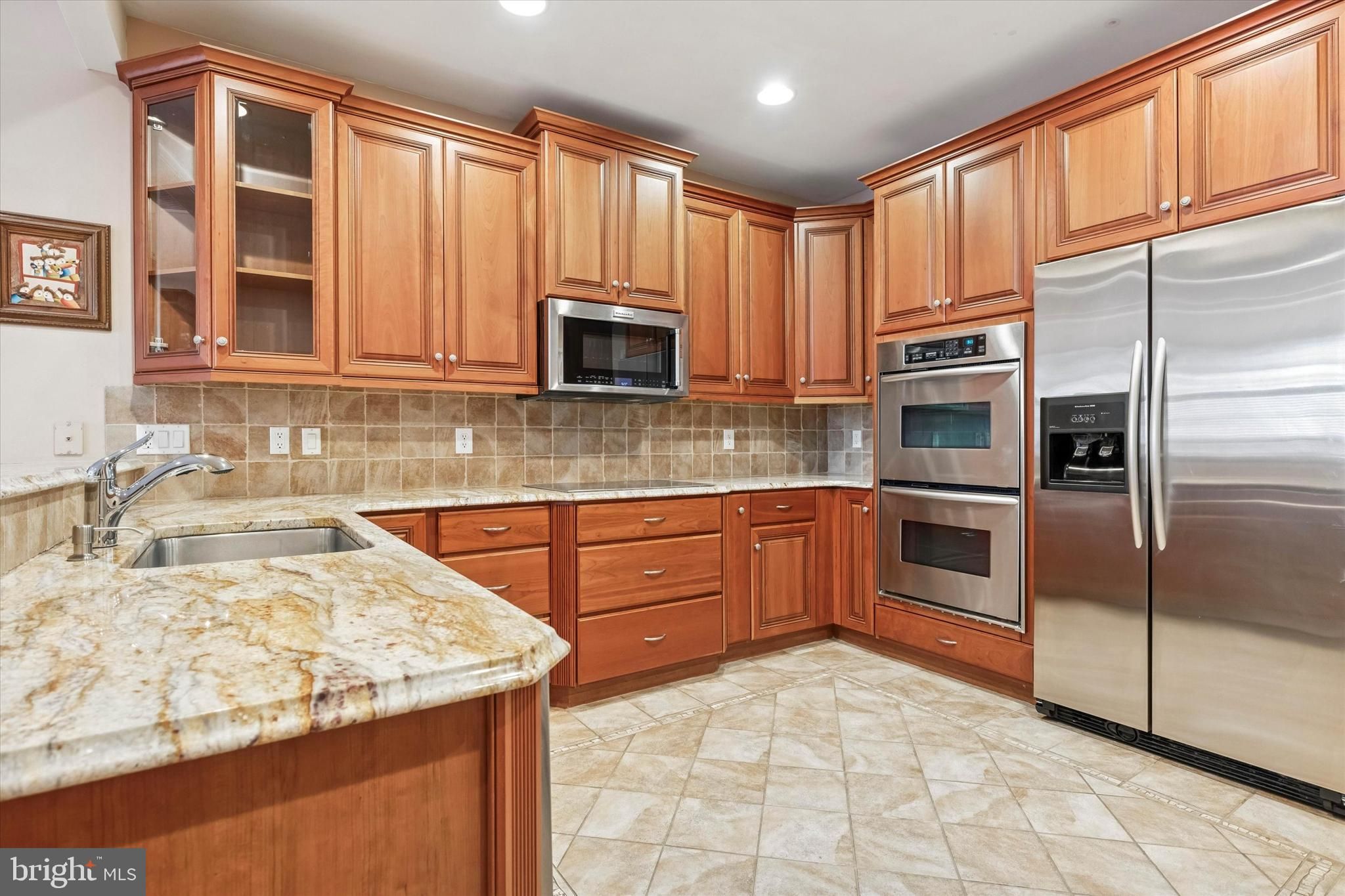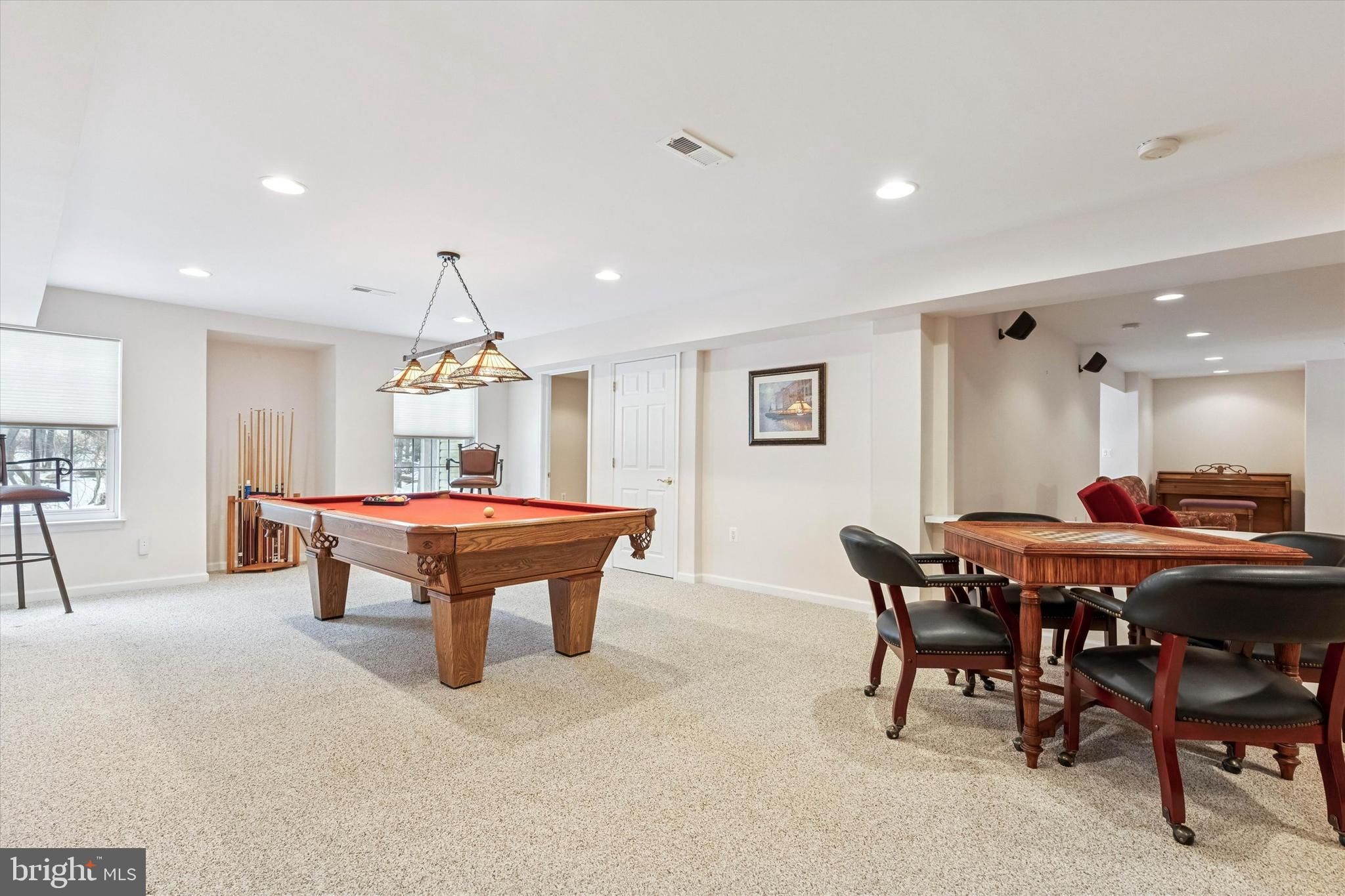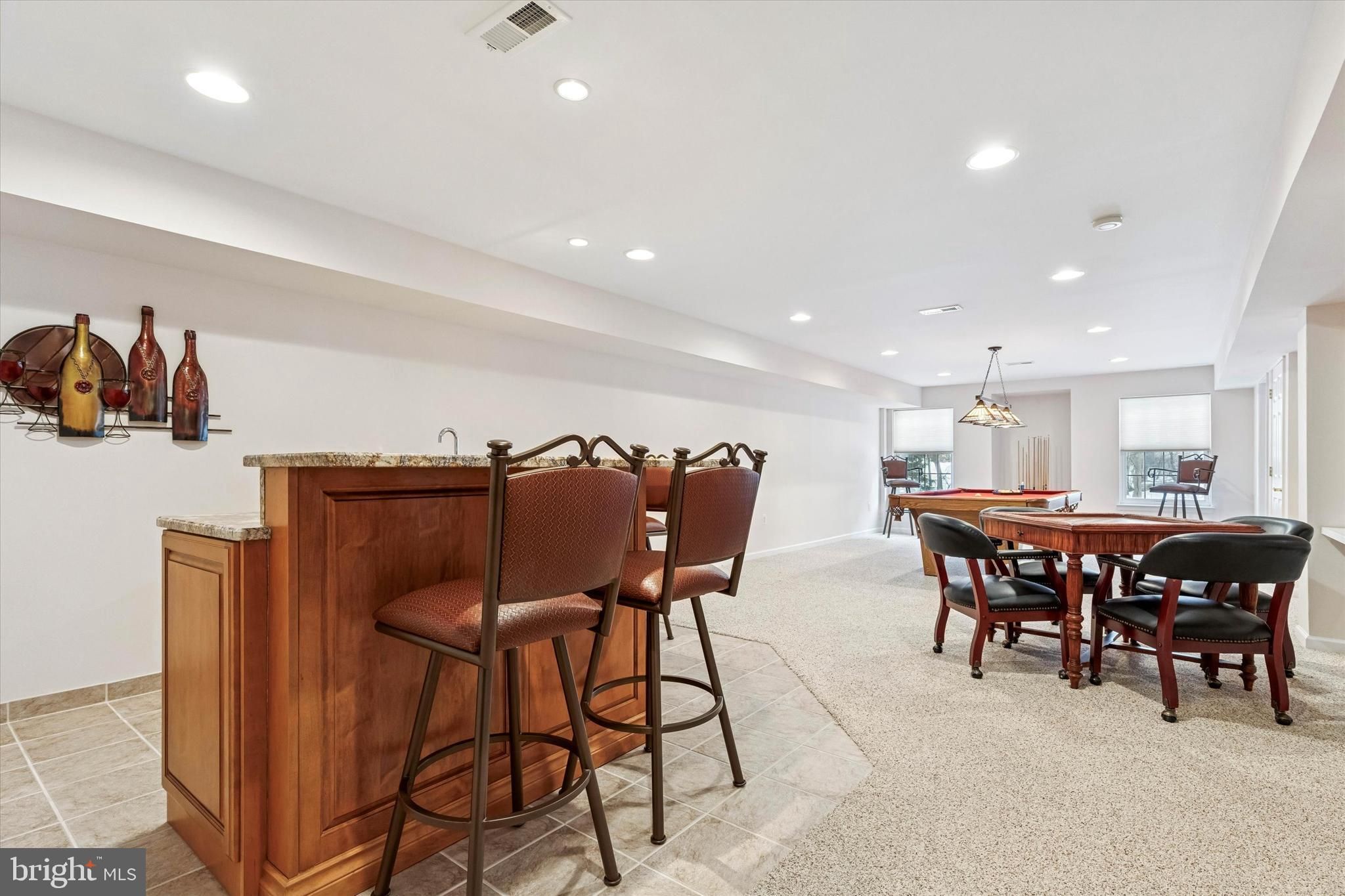 Welcome to 189 Villa Drive, an exceptional carriage home located in the highly sought-after Villas at Five Ponds, one of Bucks County’s premier active adult communities. This coveted Thornhill model — one of the largest in the neighborhood — presents a rare opportunity, as it is one of only 22 homes in the entire community offering a very large finished basement. A charming covered front porch leads into a dramatic, light-filled living room that flows seamlessly into the spacious dining area, both enhanced by gleaming hardwood floors, soaring vaulted ceilings, custom millwork, and designer window treatments. The open floor plan is ideal for both everyday living and effortless entertaining. The private primary suite features two custom walk-in closets and a luxurious bath with granite countertops, dual sinks, and an expanded walk-in shower, while a generously sized second bedroom sits adjacent to a full hall bath, perfect for guests. At the heart of the home is the beautifully appointed eat-in island kitchen showcasing stainless steel KitchenAid appliances, granite countertops, 42-inch wood cabinetry with built-in spice rack and Lazy Susan and ceramic tile flooring, all opening directly to the inviting family room complete with hardwood floors, vaulted ceilings, a gas fireplace with custom mantle, and large-screen TV. Just beyond, a private den provides the perfect space for a home office or quiet retreat and offers direct access to the impressive Trex deck with a dedicated gas line for grilling. The main level also includes a spacious laundry room with newer GE washer and dryer, entry to the oversized two-car garage with additional storage, and access to the upper-level loft. Ideal as a third bedroom or guest suite, the loft features a full bath with a stall shower and an oversized storage room outfitted with extensive custom closets and built-ins. The true showstopper is the expansive finished basement offering over 1,450 square feet of exceptional entertainment space — a feature rarely found in this community — complete with a large-screen TV with surround sound, a custom wet bar with two-tier granite countertops, stainless steel sink, electric service, and seating for four to six guests. The sprawling game area comfortably accommodates a full-size pool table and separate chess/checkers table, while two additional rooms provide outstanding flexibility for a private office, fitness space, or hobby area, and a dedicated workshop is perfect for woodworking or creative projects.