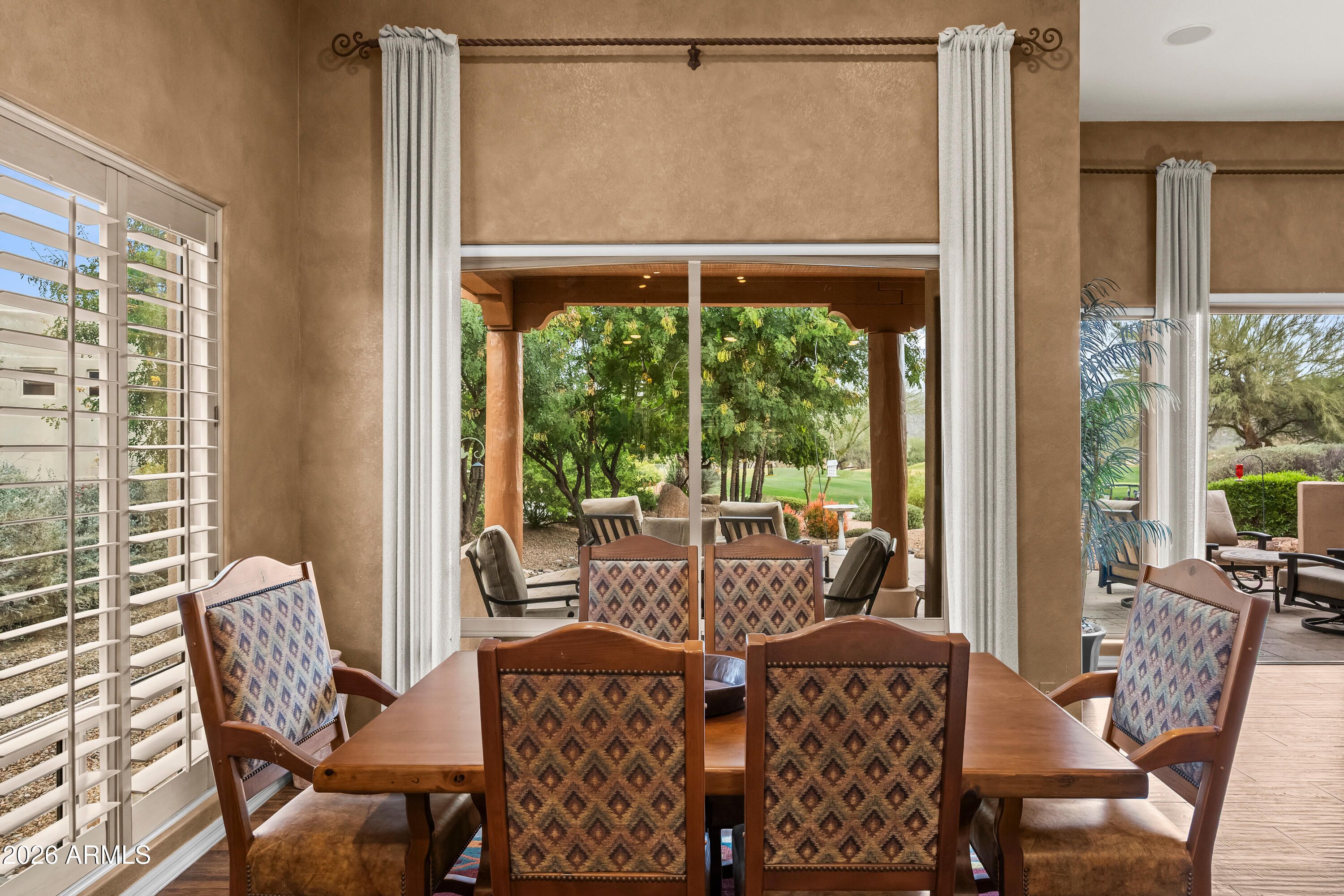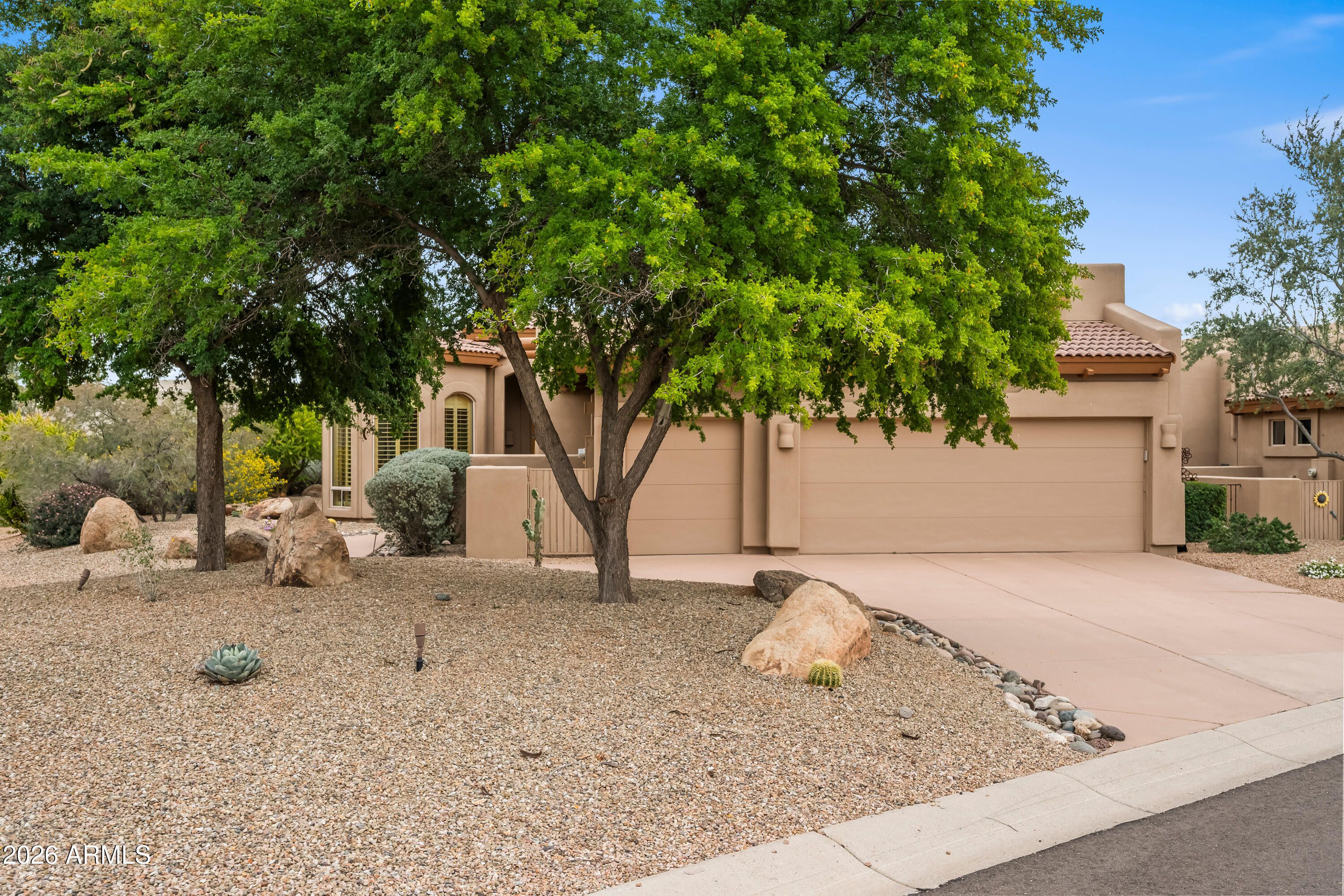 VIEWS GALORE!!! Sensational townhouse situated on the 10th green of the Ranch Course with great views of the Mazatzal mountains to the east. What's not to love in this fully furnished townhouse. Great tile flooring throughout, updated kitchen, two eating areas; one breakfast nook and another dining room. The den is right off of the great room and could be a 3rd bedroom. The huge patio was recently redone with travertine tiles and the corner lot gives a feel of a private yard. The primary suite has a bathtub, snail shower, double vanities and a nice size closet. The guest suite has its own bath. A bonus is the powder room and a laundry room with a large closet for supplies. The garage holds 2 cars and a golf cart. This unit also has a transferable Golf Membership.